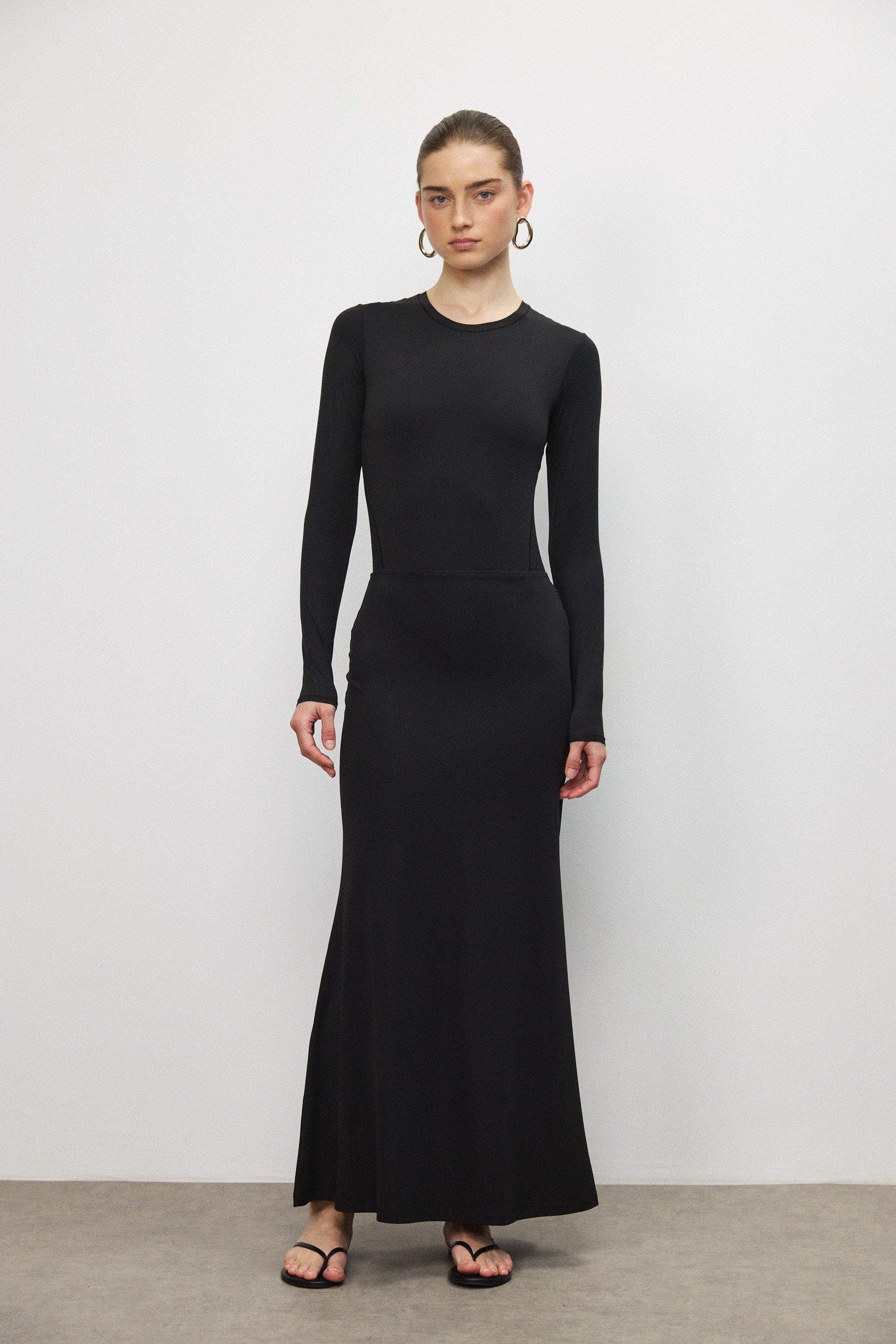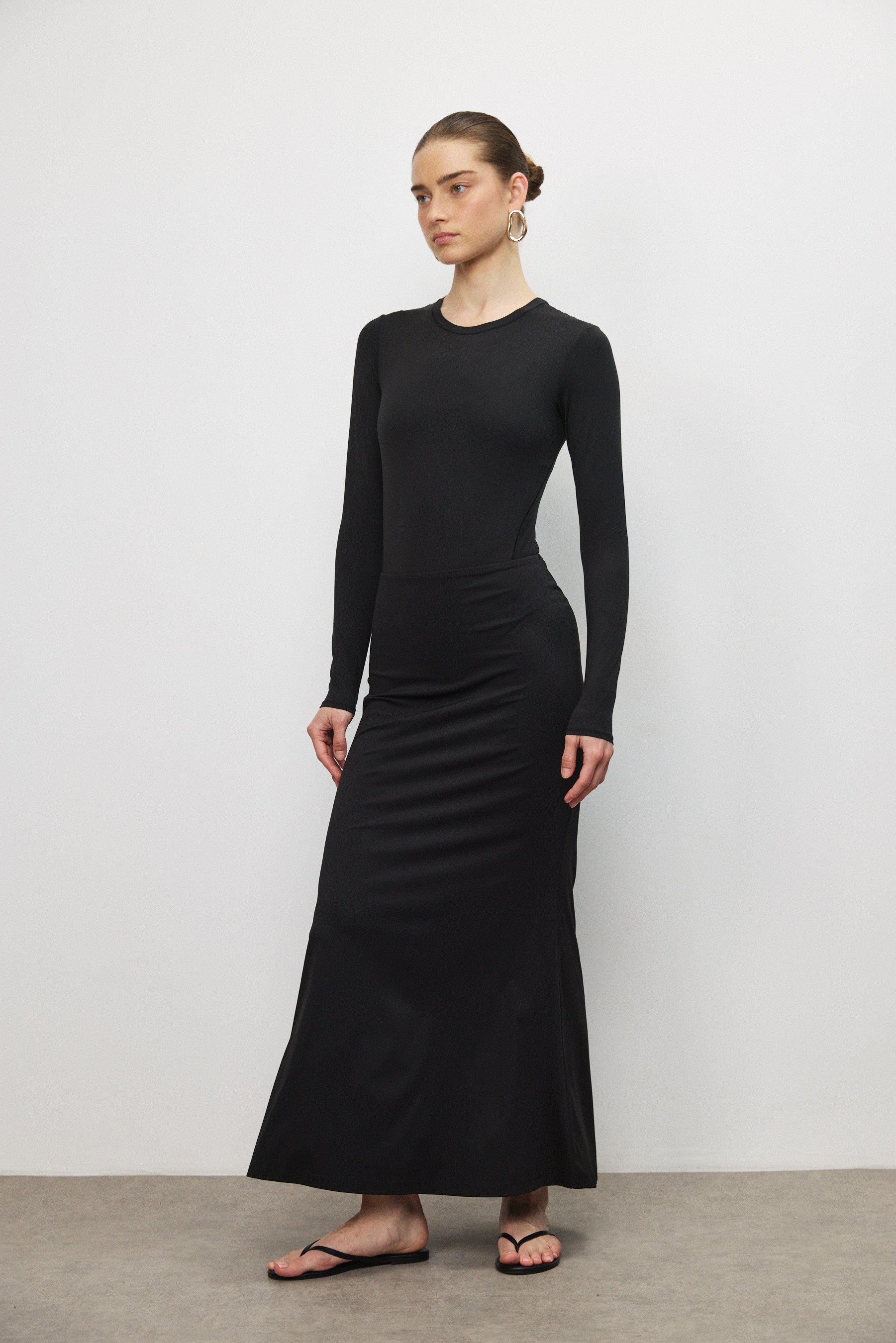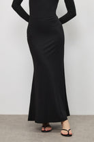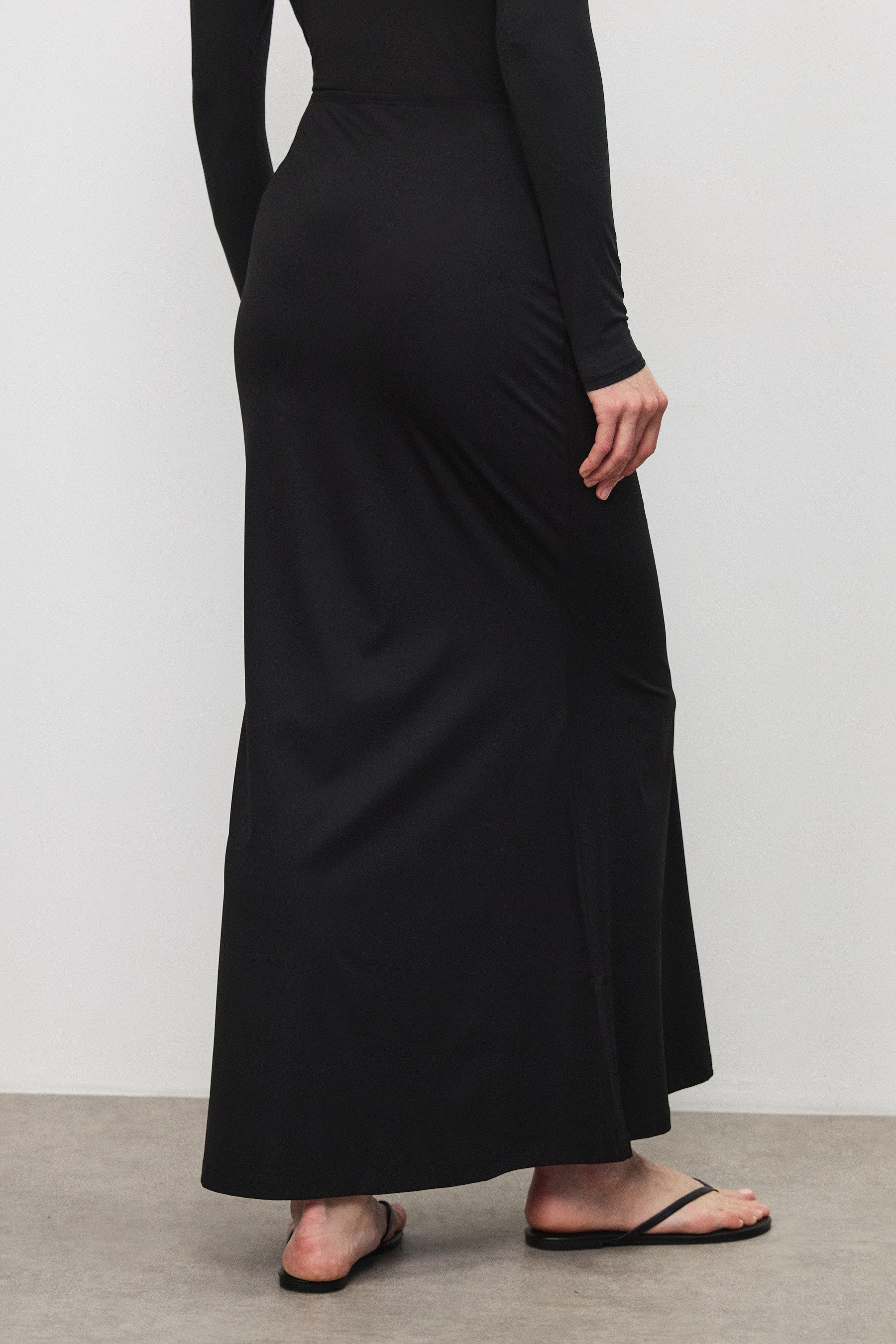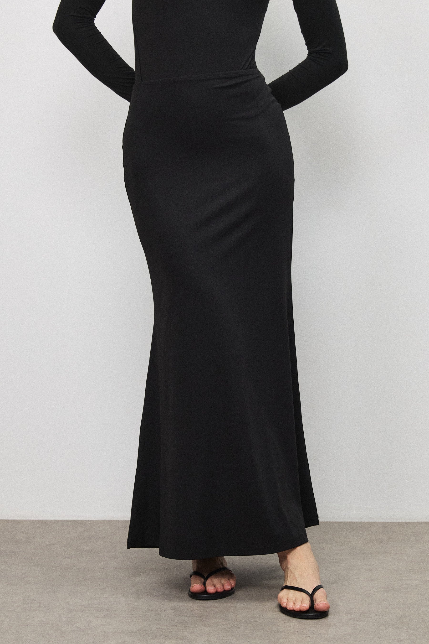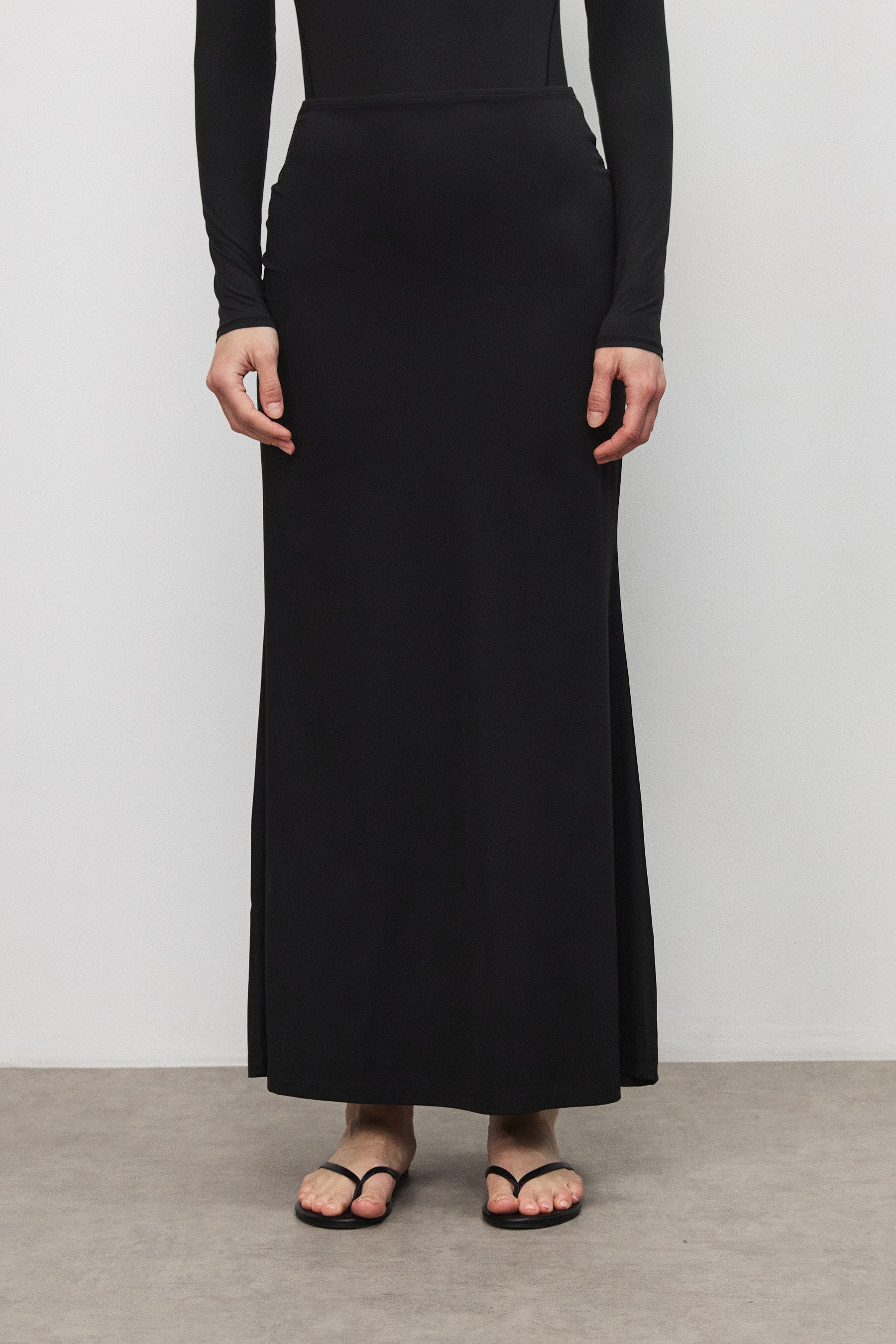 חצאית מקסי מבד רך בגוון מט, בעלת מראה חלק ומוקפד. גזרה גבוהה ומדויקת הצמודה בחלק העליון ונפתחת בעדינות בחלק התחתון, ליצירת תנועה זורמת ומאוזנת. כוללת גומי בקו המותן ללבישה נוחה וישיבה טבעית.