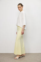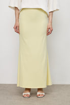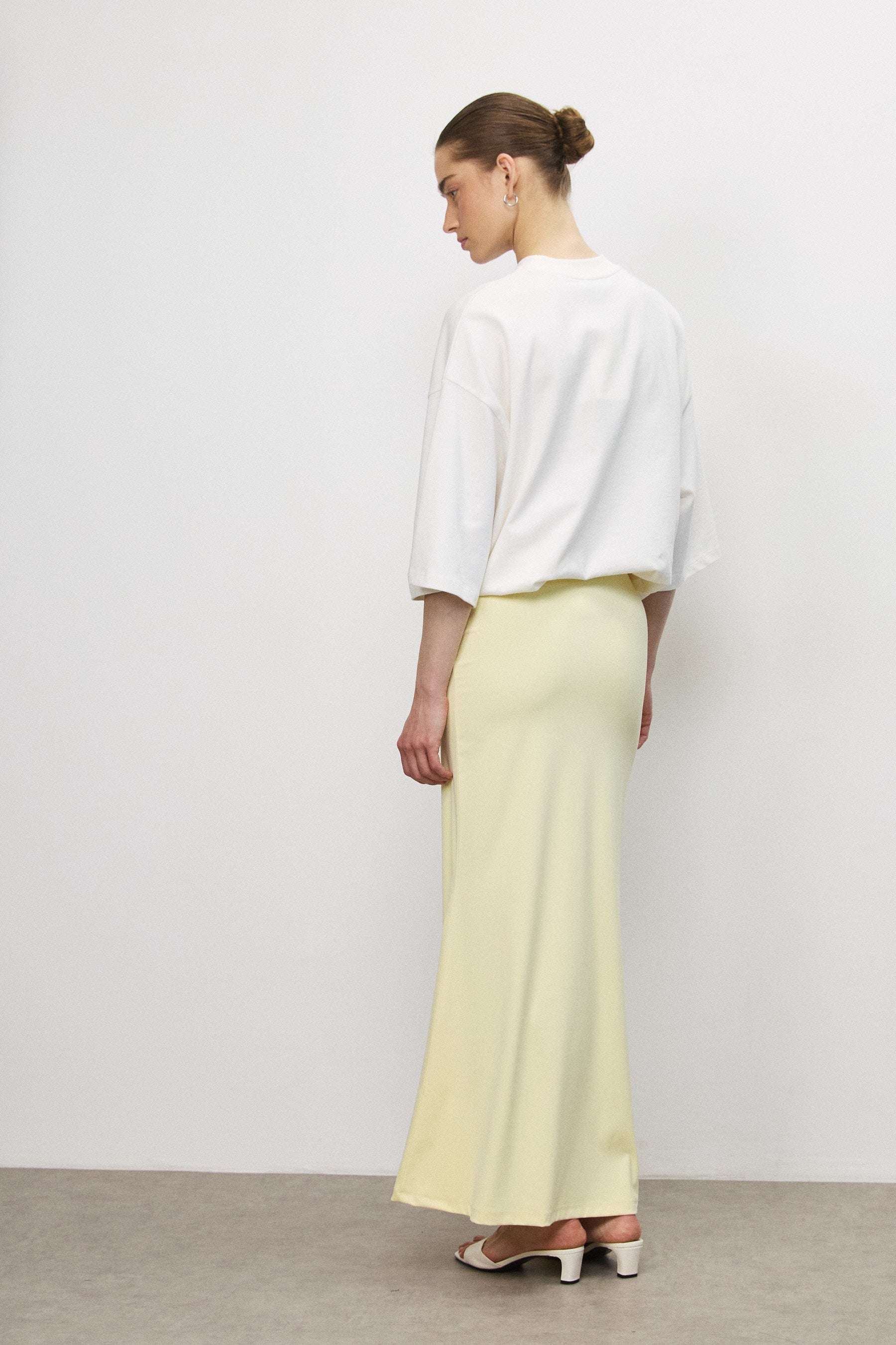חצאית מקסי מבד רך בגוון מט, בעלת מראה חלק ומוקפד. גזרה גבוהה ומדויקת הצמודה בחלק העליון ונפתחת בעדינות בחלק התחתון, ליצירת תנועה זורמת ומאוזנת. כוללת גומי בקו המותן ללבישה נוחה וישיבה טבעית.
