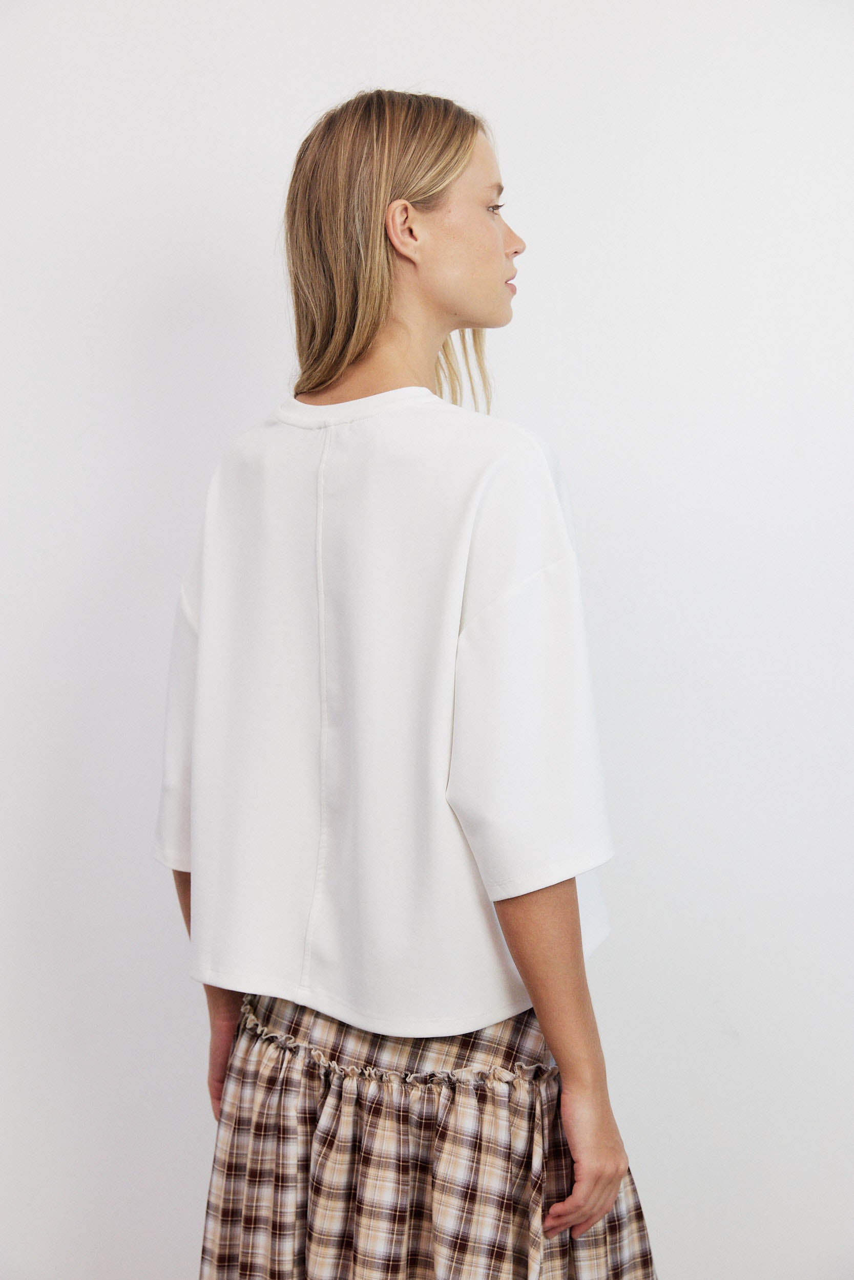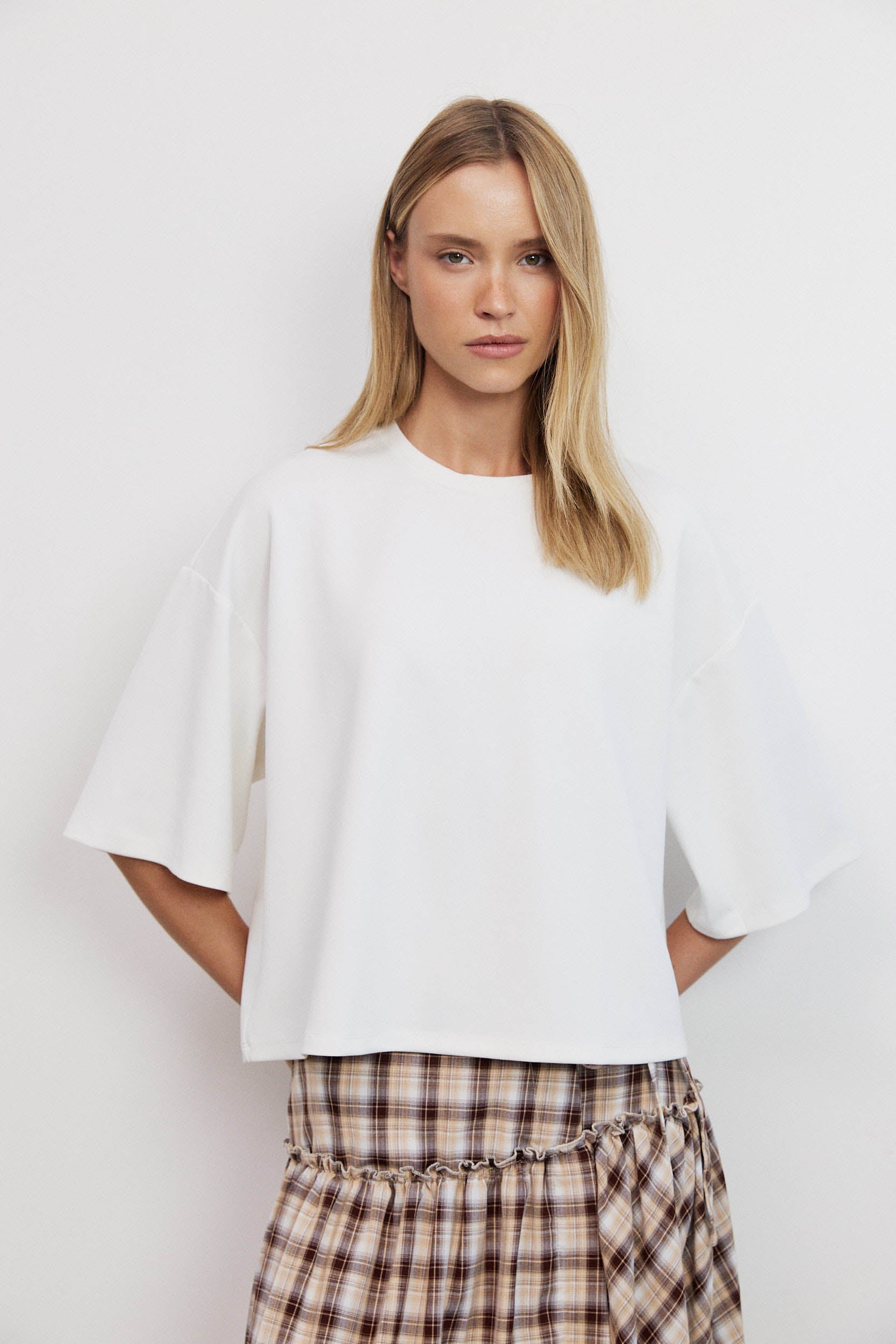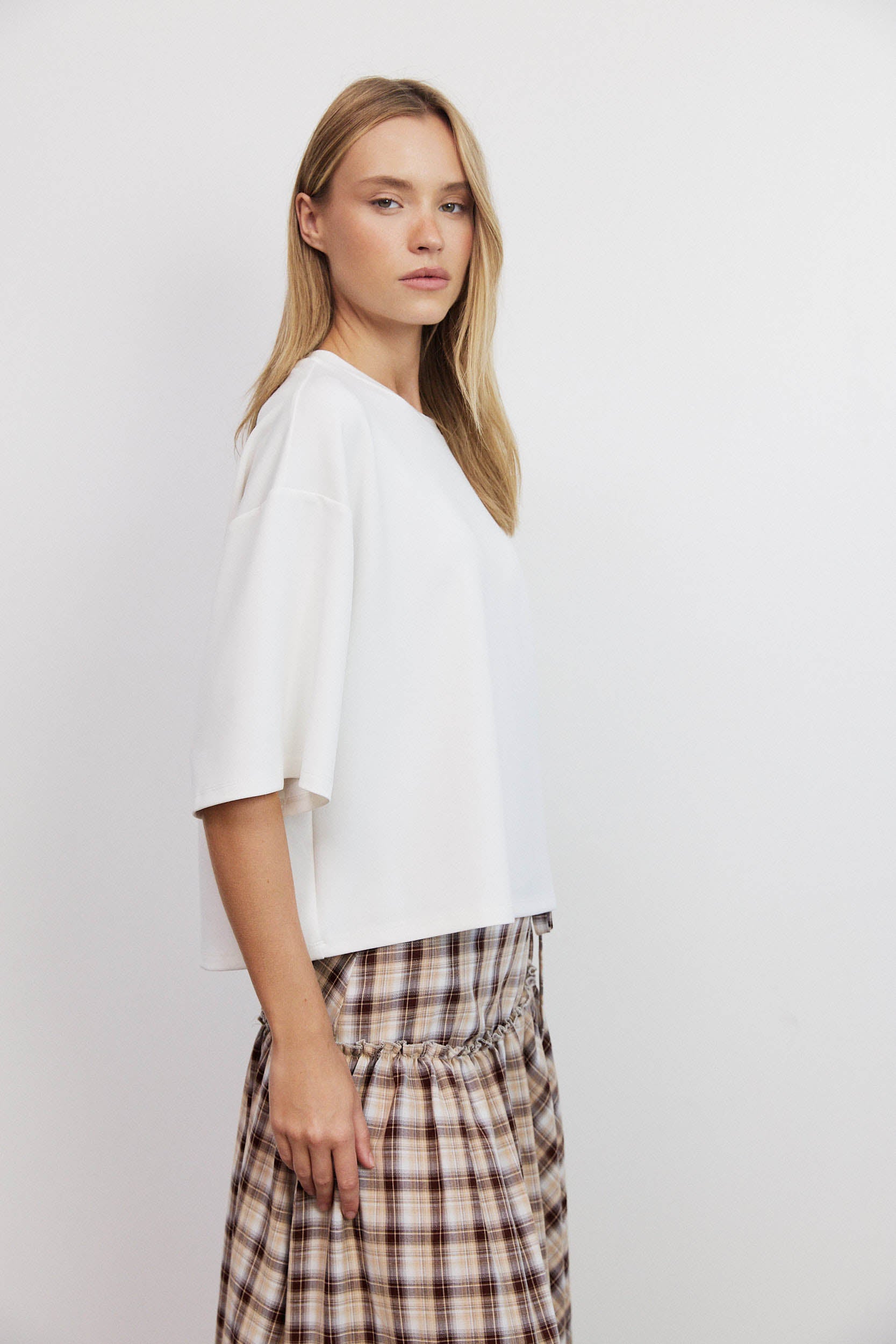 חולצת טי רחבה בגזרת אוברסייז עם שרוולים רחבים באורך ביניים ומפתח צוואר עגול קלאסי. עשויה מבד רך ונעים, מעניקה מראה מינימליסטי, נקי ושיקי לכל לוק.
