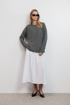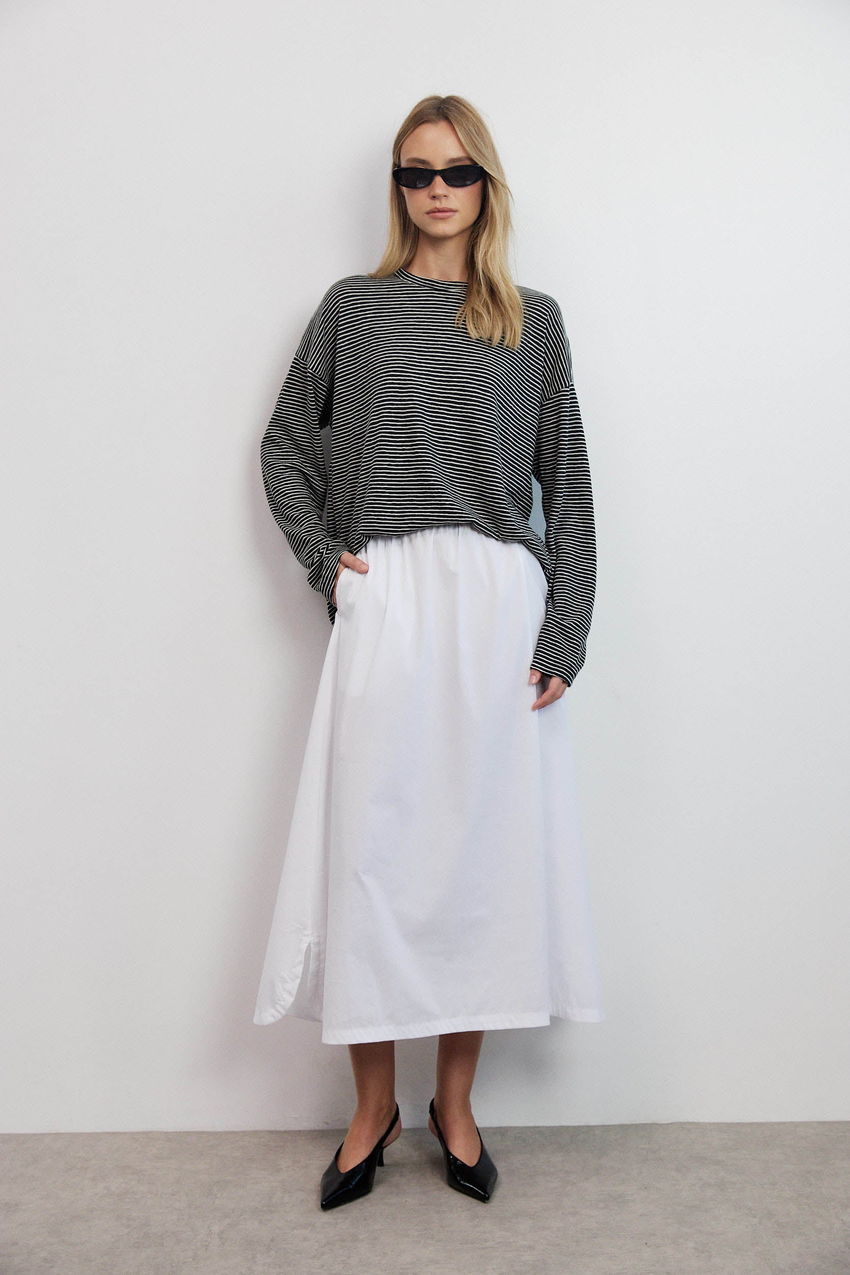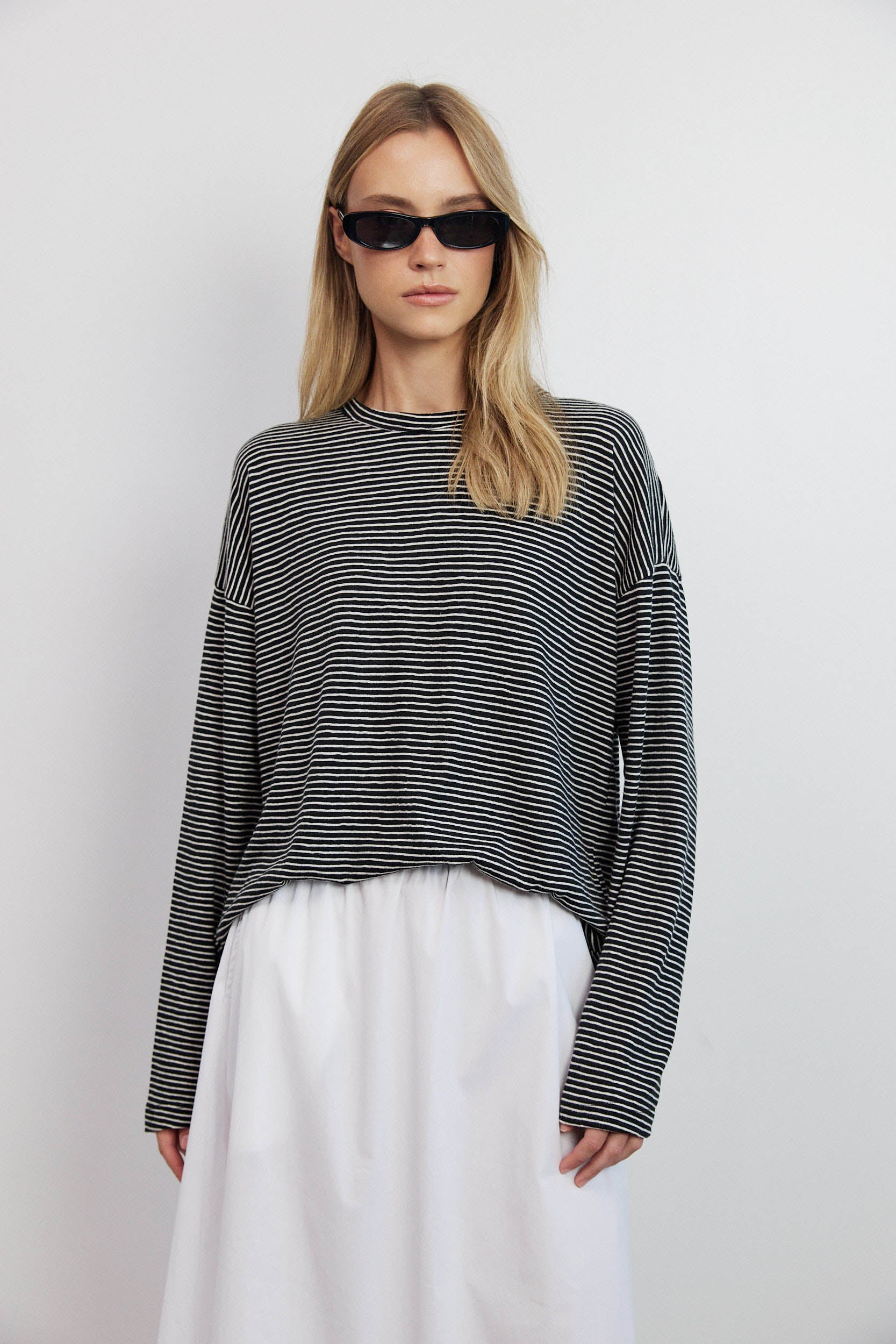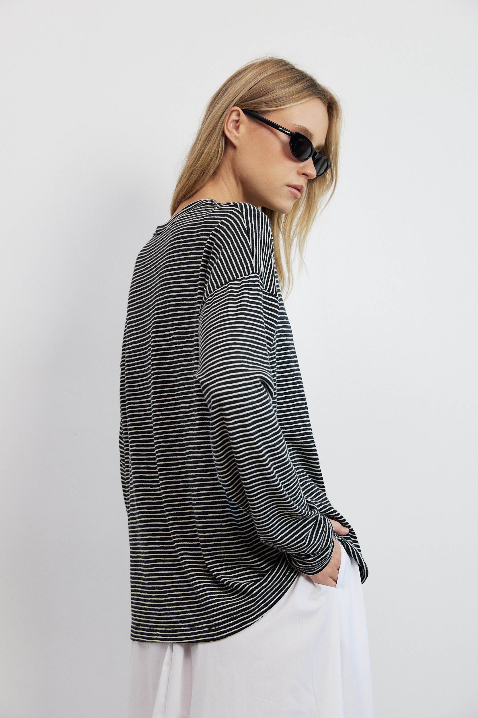 חולצת פסים בייסיק בגזרה רפויה, עשויה בד קליל ונעים למגע עם שרוולים ארוכים ומפתח צוואר עגול וקלאסי.