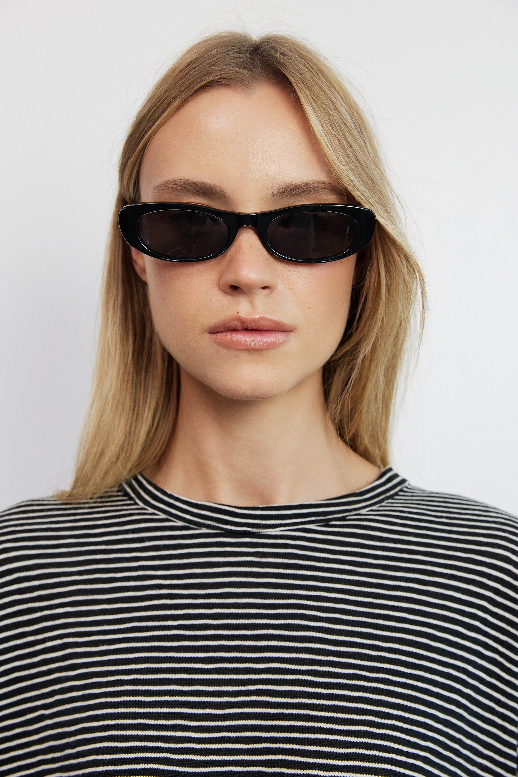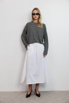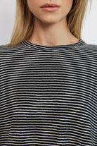 הפסים העדינים בגווני שחור ואוף ווייט יוצרים מראה קלאסי עם טוויסט מודרני.