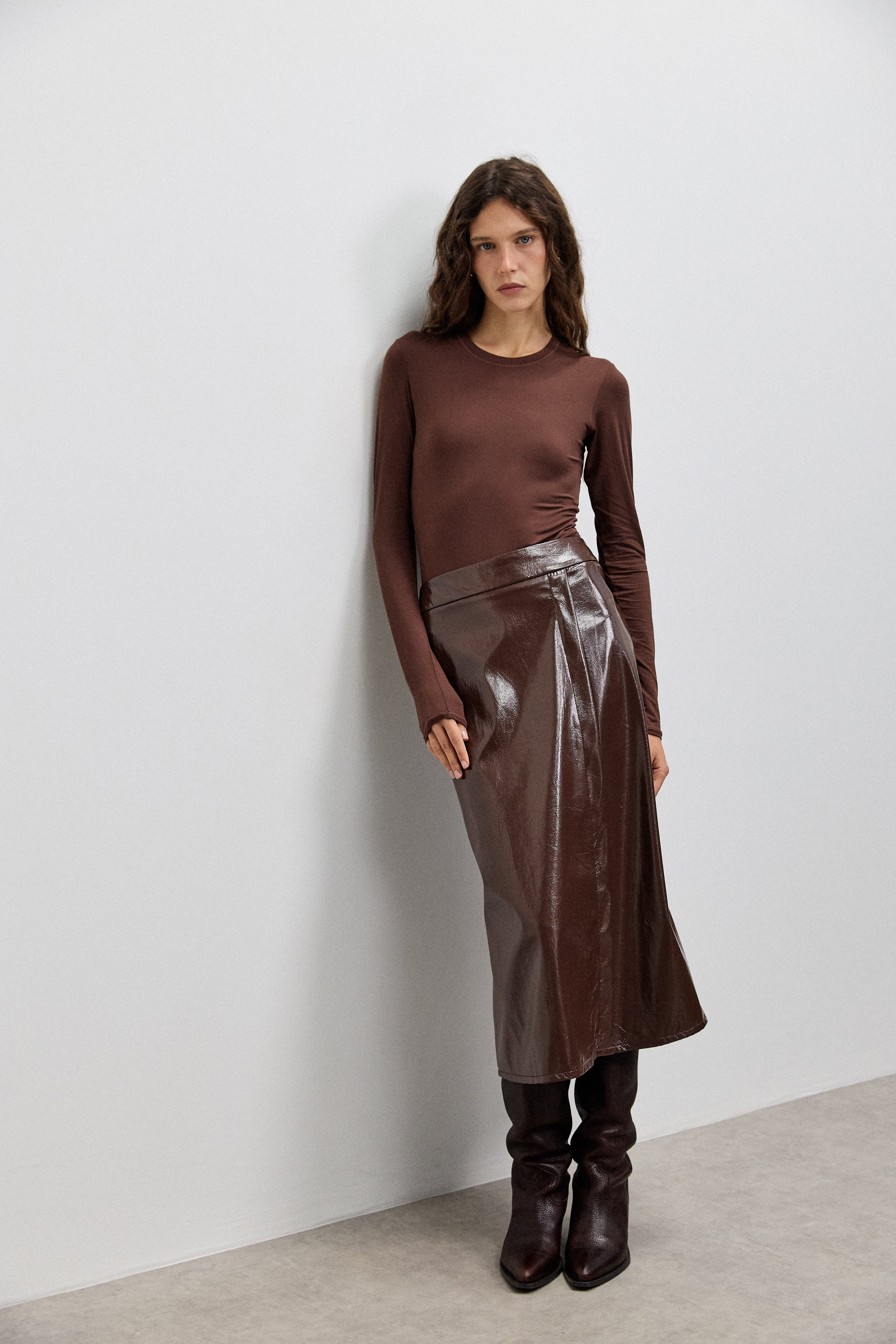 חצאית מידי במראה אלגנטי עם גימור מבריק ונוכחות נקייה. עשויה בד נעים עם נגיעת לייקרה, היוצר נפילה חלקה ותנועה מחמיאה על הגוף. כוללת רוכסן נסתר לשמירה על קו מוקפד ואחיד. חצאית ורסטילית שמתאימה ללוק יומיומי מהודק ולמראה ערב מדויק.