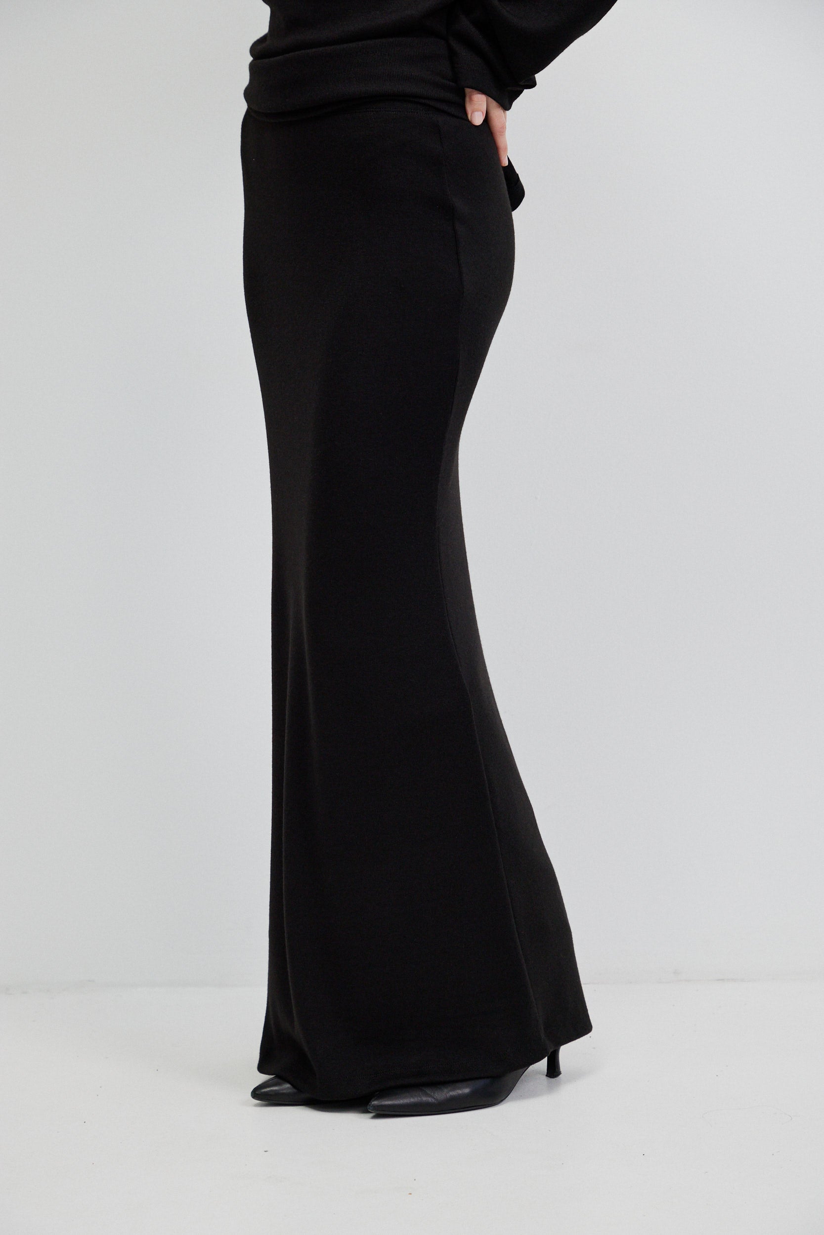 החצאית בעלת גזרה ארוכה וישרה, עם קו מותן בגימור אלסטי נקי.