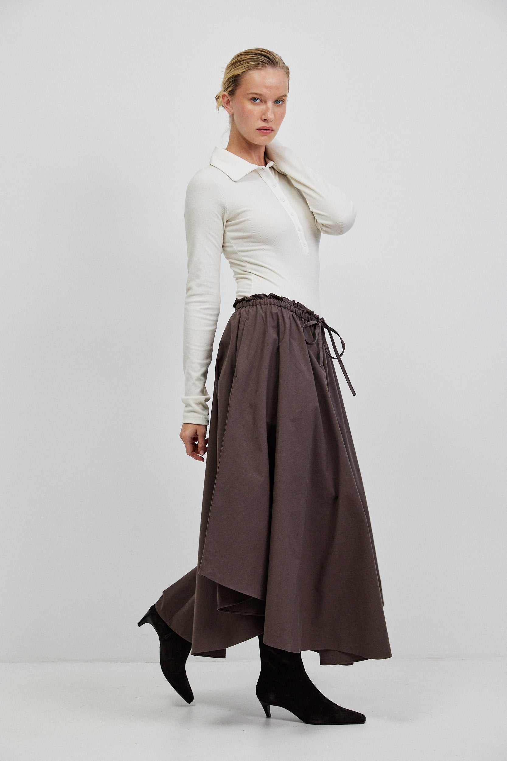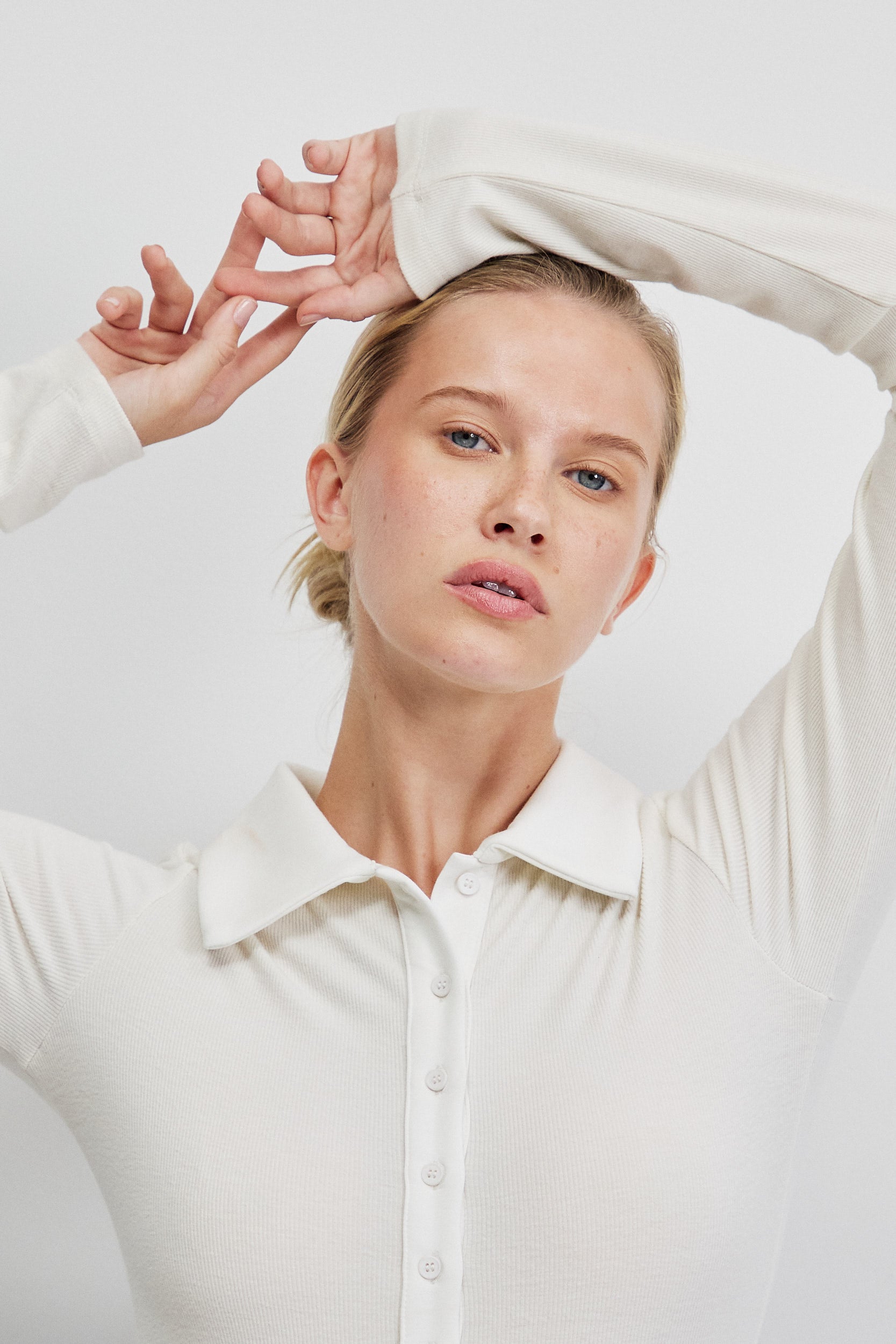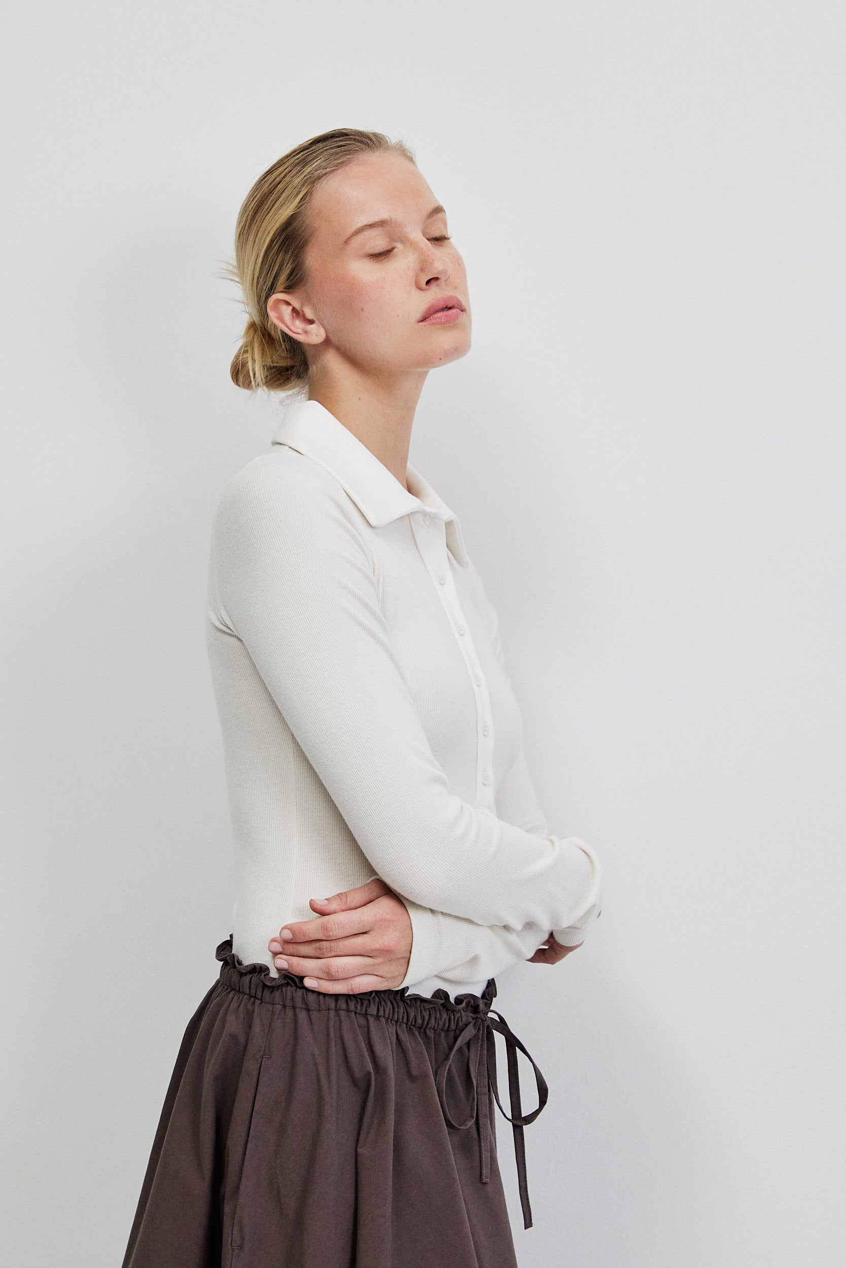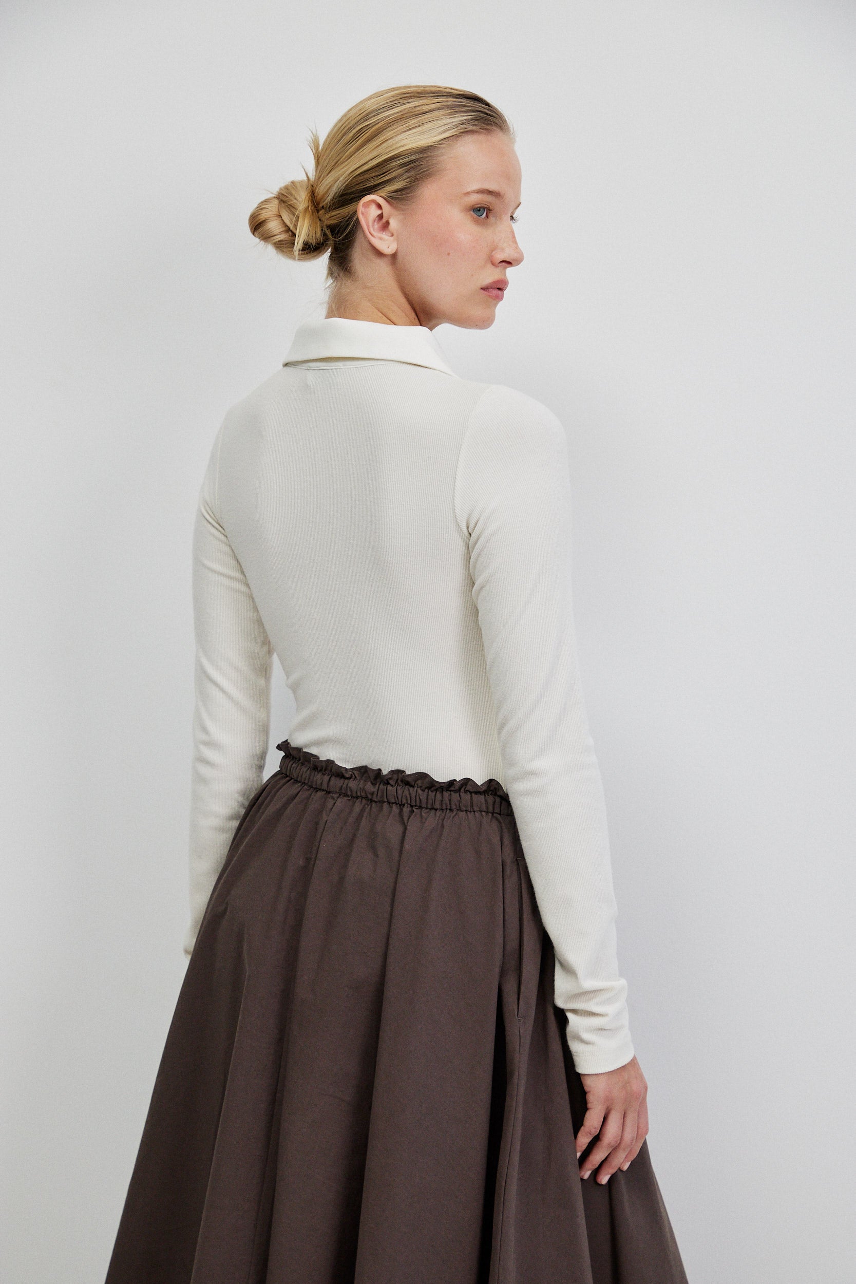 בגד גוף עשוי בד ריב דק בגוון שמנת, עם טקסטורה עדינה שמעניקה עומק שקט ונקי. הגזרה הצמודה שומרת על קו מוארך ומדויק וחלקו העליון מעוצב בפתח פולו מינימליסטי עם כפתורי טון־על־טון וצווארון רךהיוצר פרופורציה מודרנית.