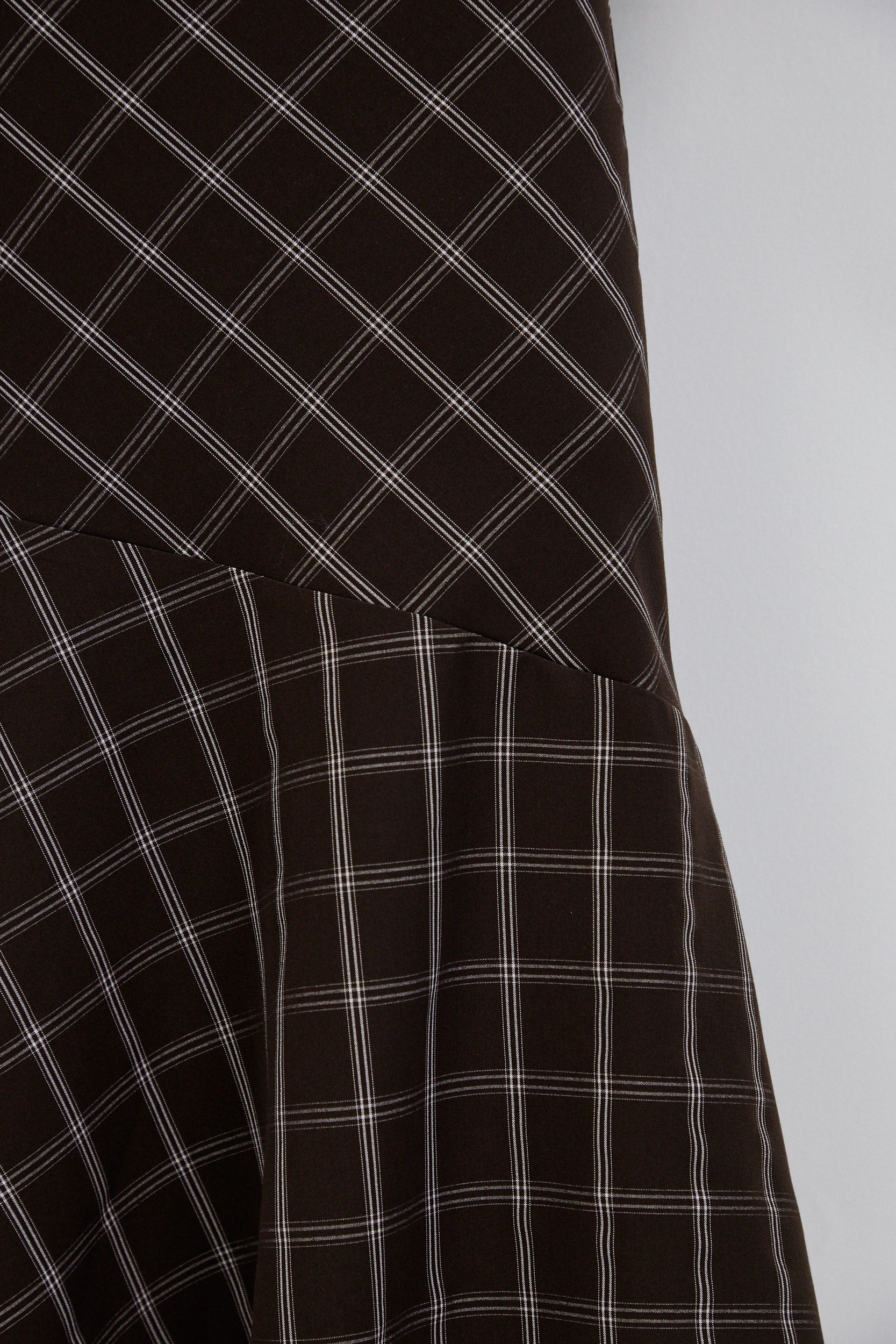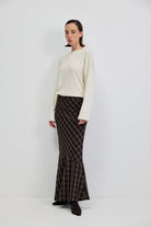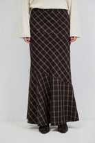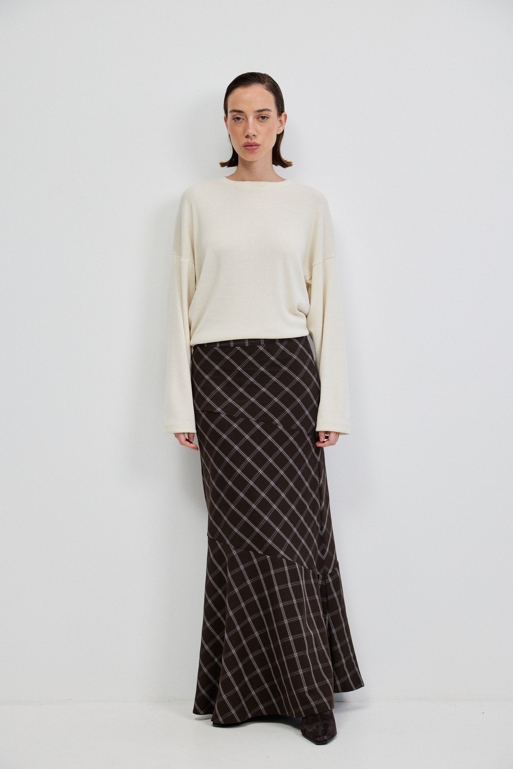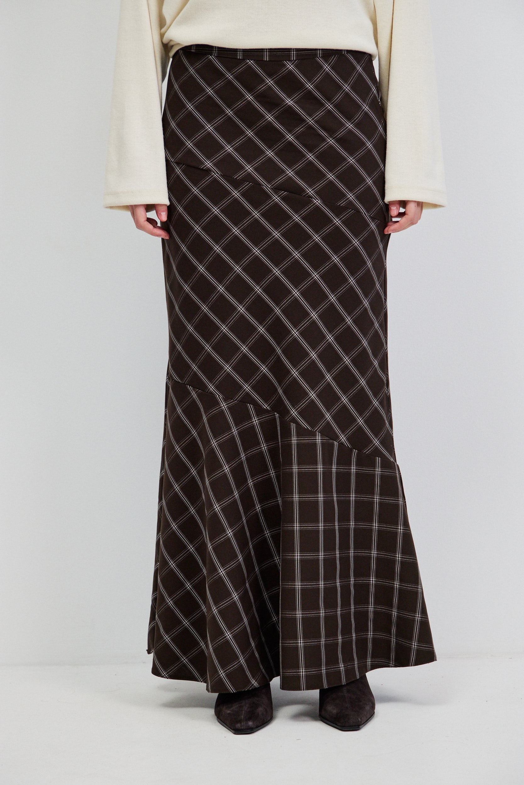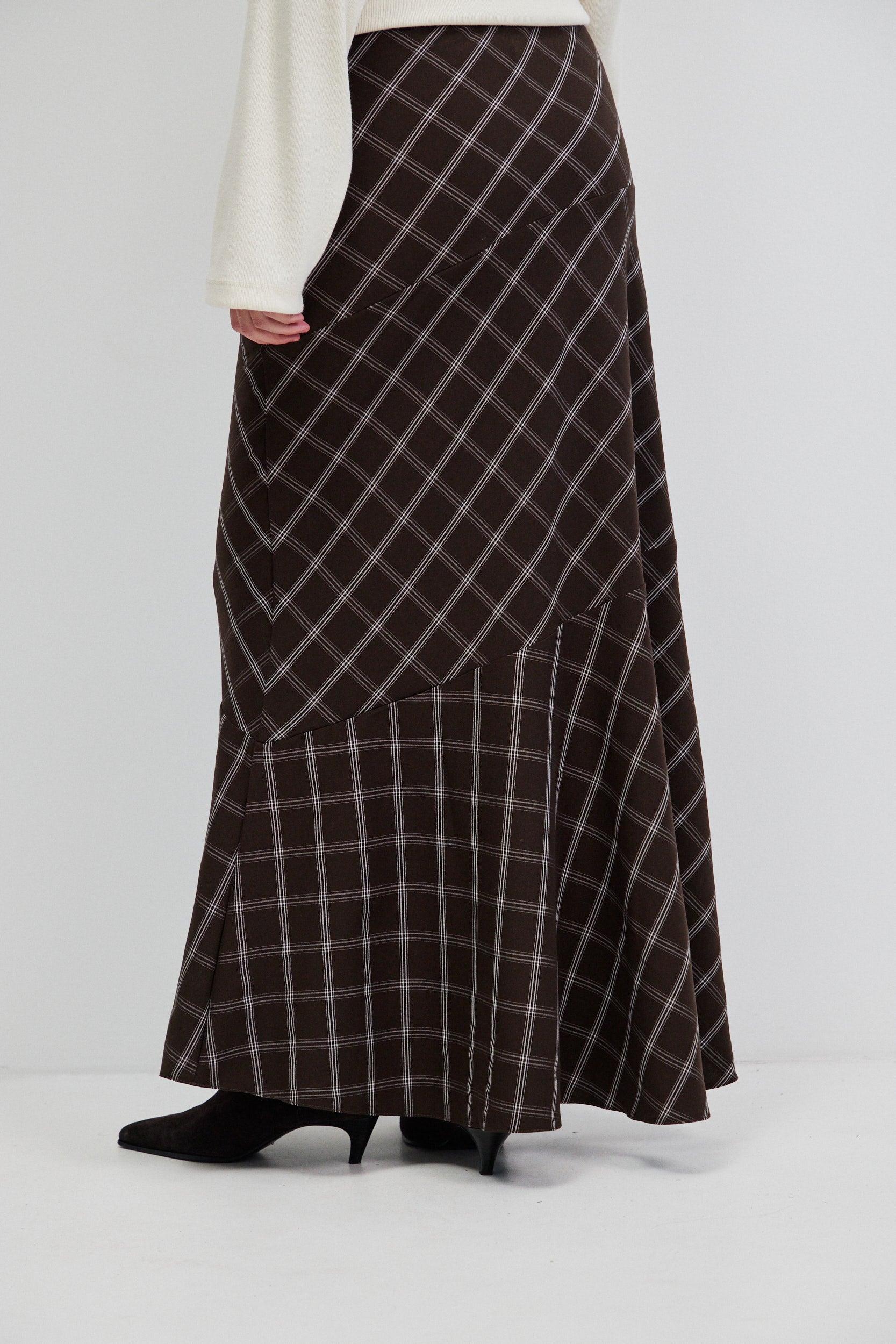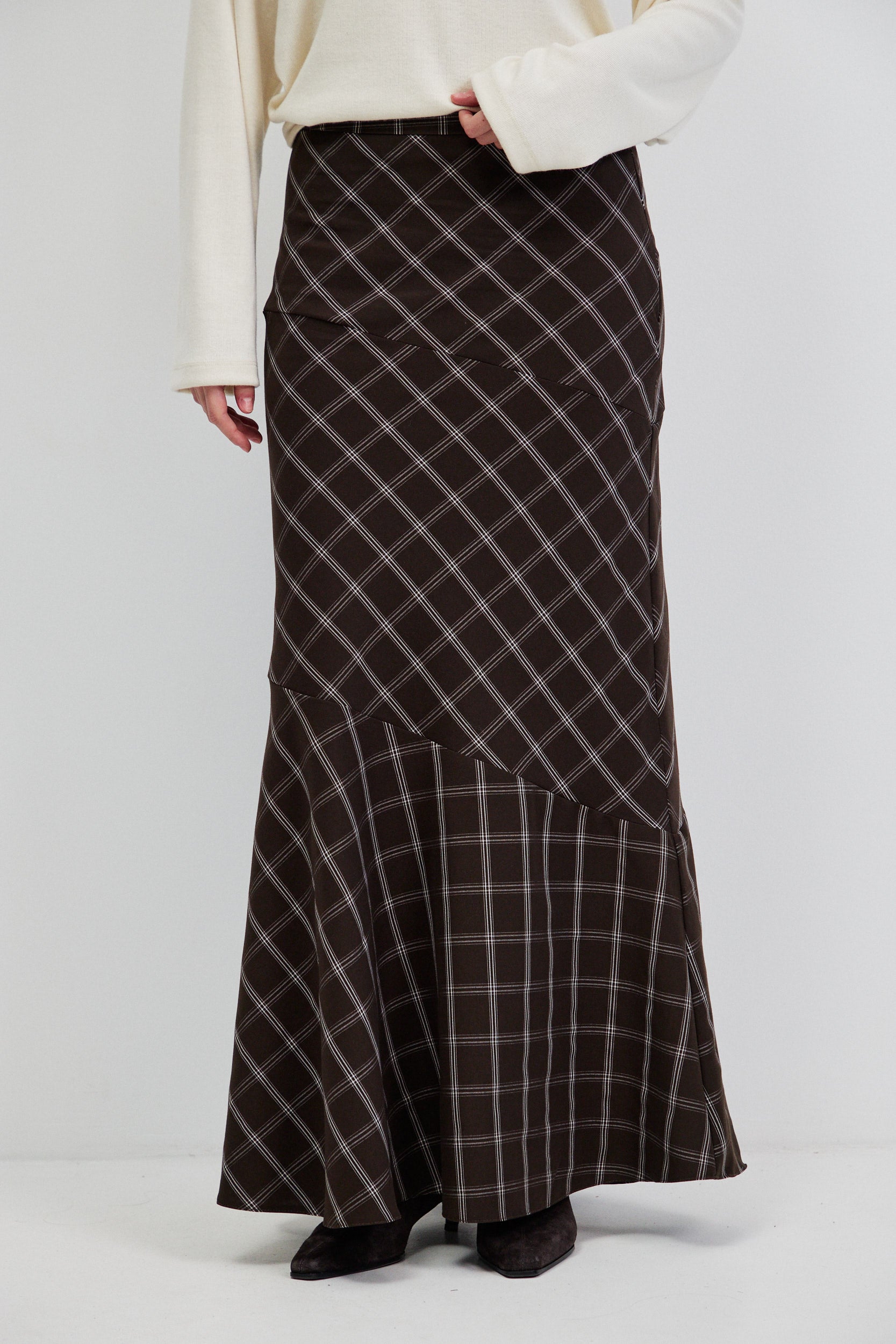 חצאית מקסי בעלת סילואט מתוחכם ונקי, בגוון חום כהה בדוגמת משבצות אלכסונית היוצרת עומק טקסטורלי מרומז.