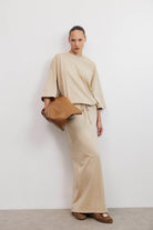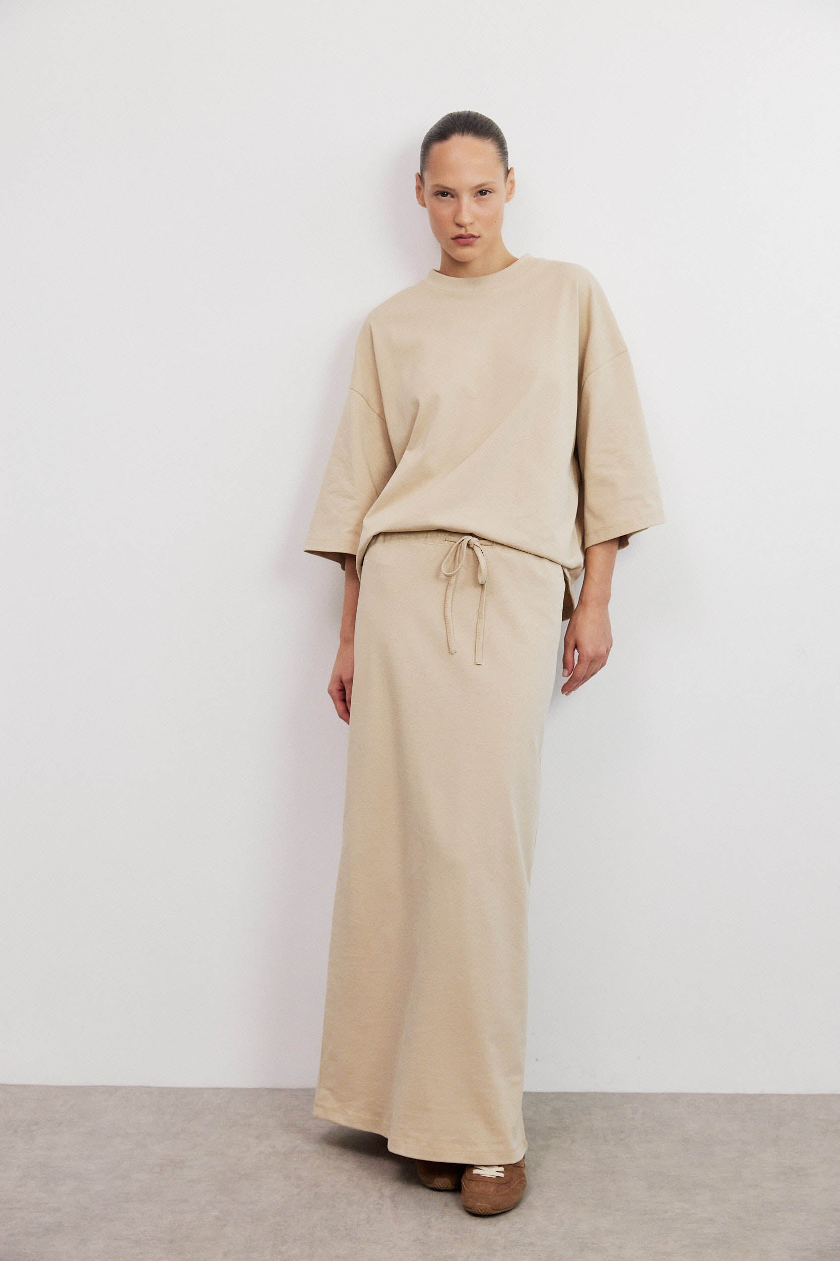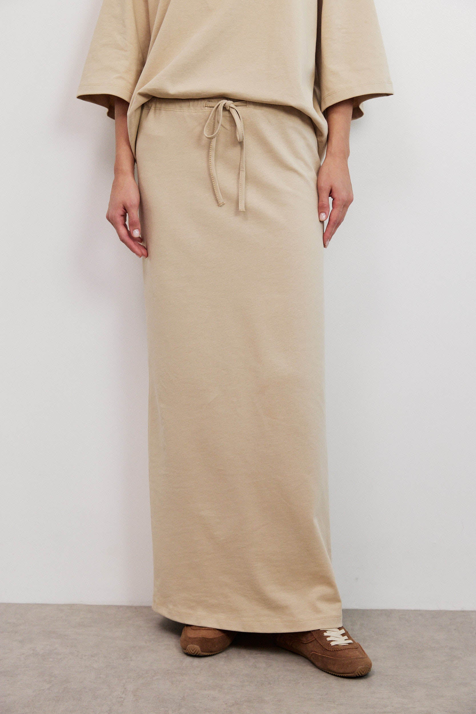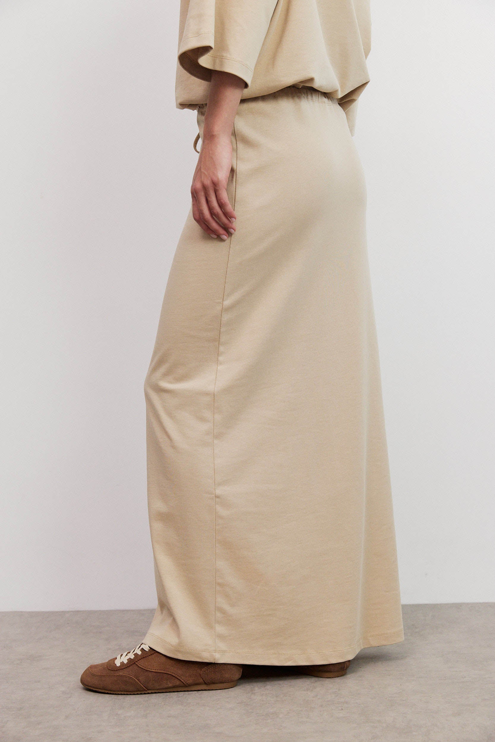 חצאית מקסי נקייה ומינימליסטית עשוית בד רך עם נפילה טבעית, שמעניק לה מראה נינוח אך מוקפד.
