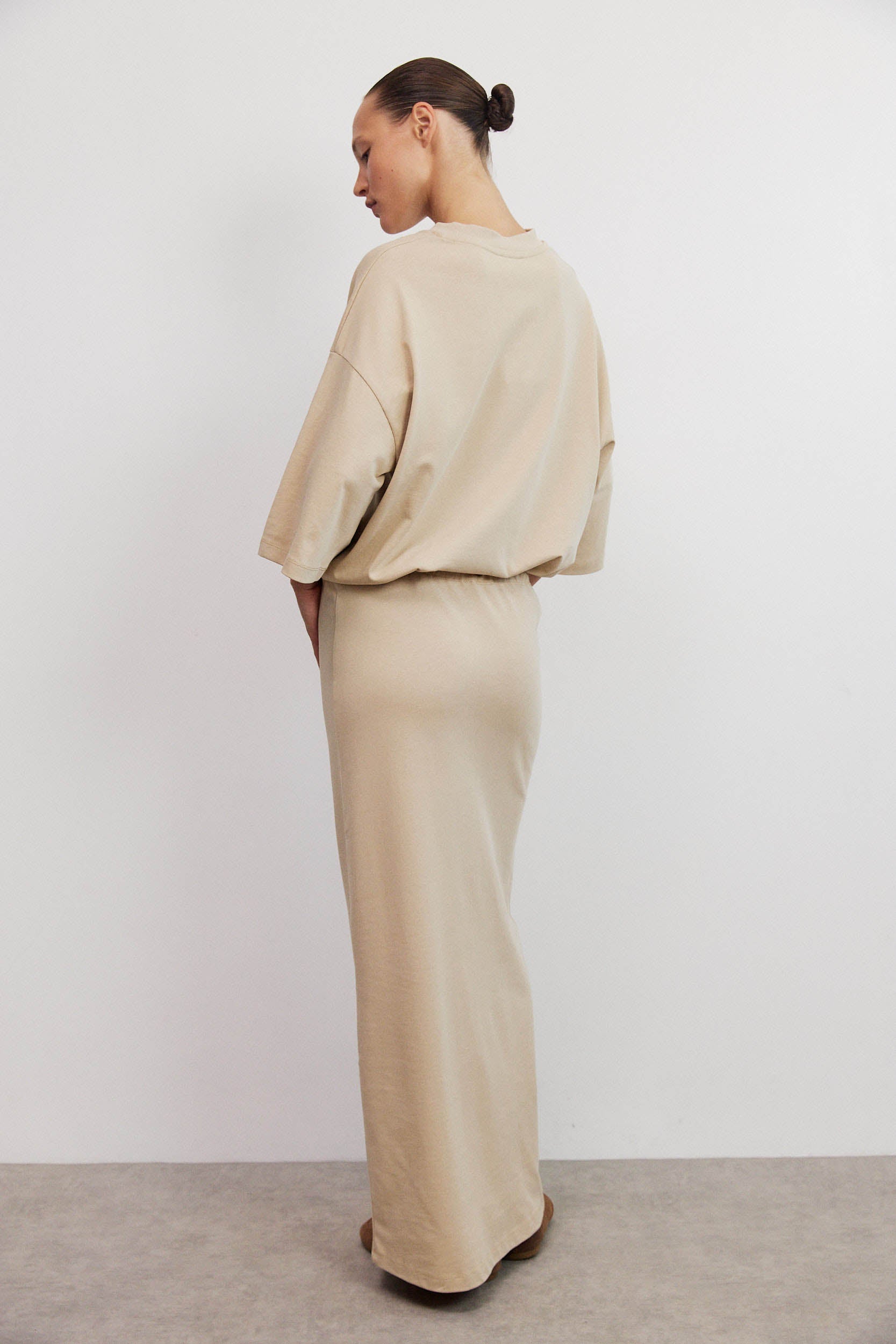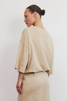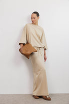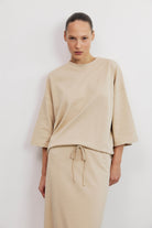 הבד רך ונשפך בעדינות על הגוף, ויוצר מראה נינוח אך מתוחכם. השרוולים רחבים באורך 3/4 עם כתפיים שמוטות, מה שמוסיף קו אדריכלי וסילואט עכשווי. המפתח עגול וסגור, שמעניק תחושת פשטות אלגנטית.
