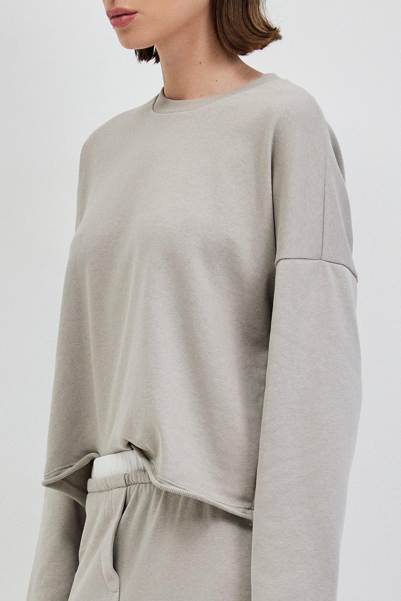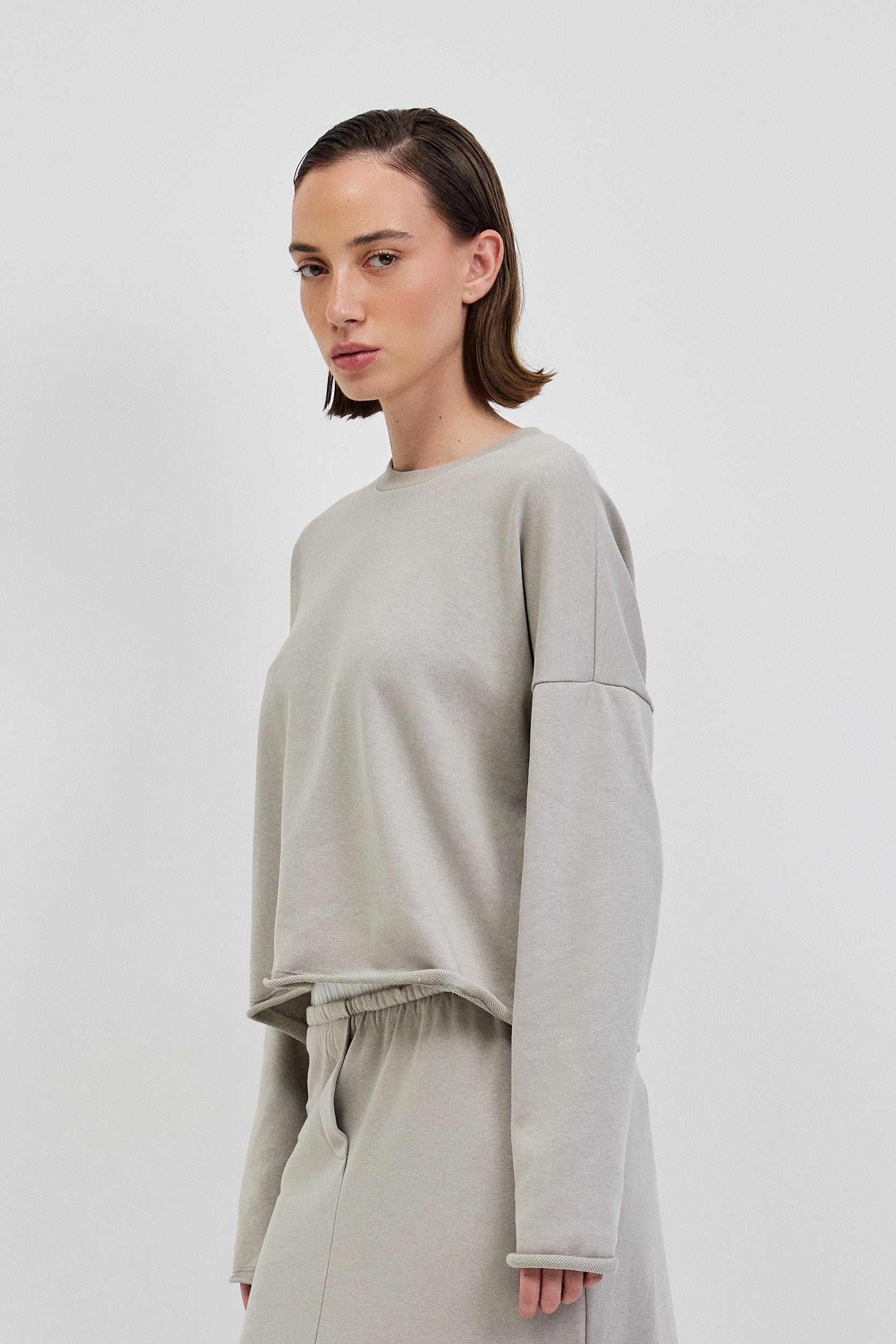 חולצת פרנץ׳ טרי בגזרה רפויה, עם קו כתפיים נמוך ועיצוב נקי ומינימליסטי, הבד נעים בעל נפילה רכה ויוצר לוק יומיומי מוקפד וספורטיבי. לחולצה סיומות תיפורים גולמית המעניקה לה טאץ’ אורבני.