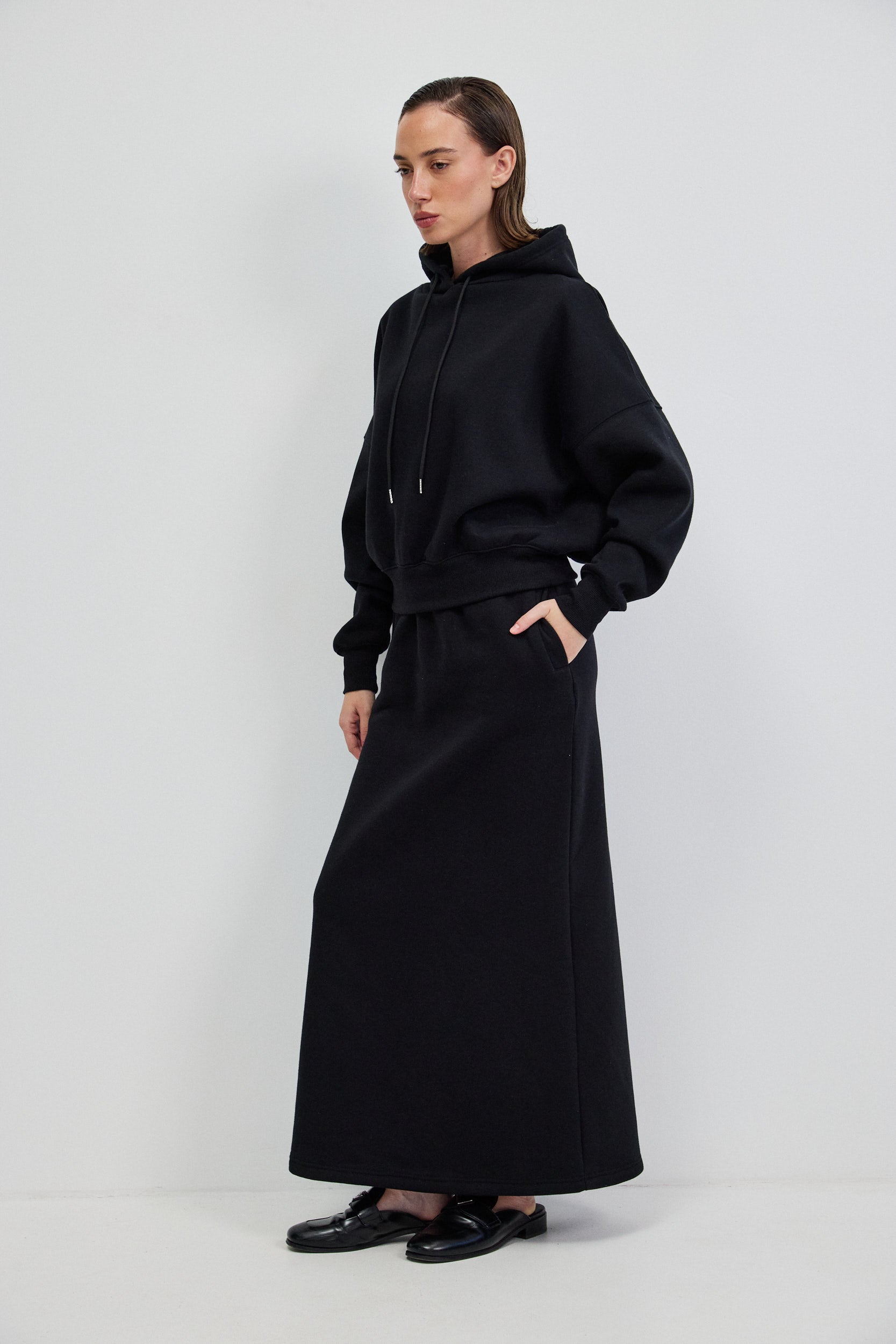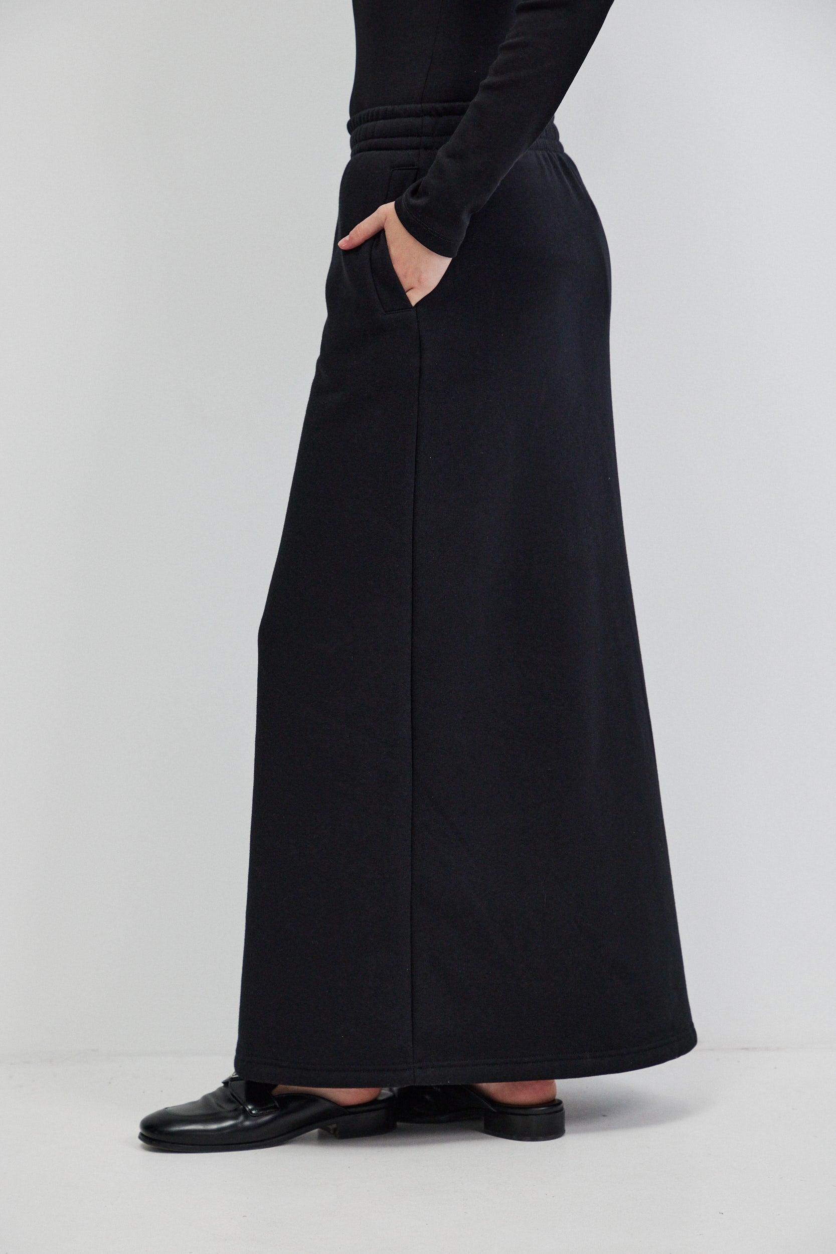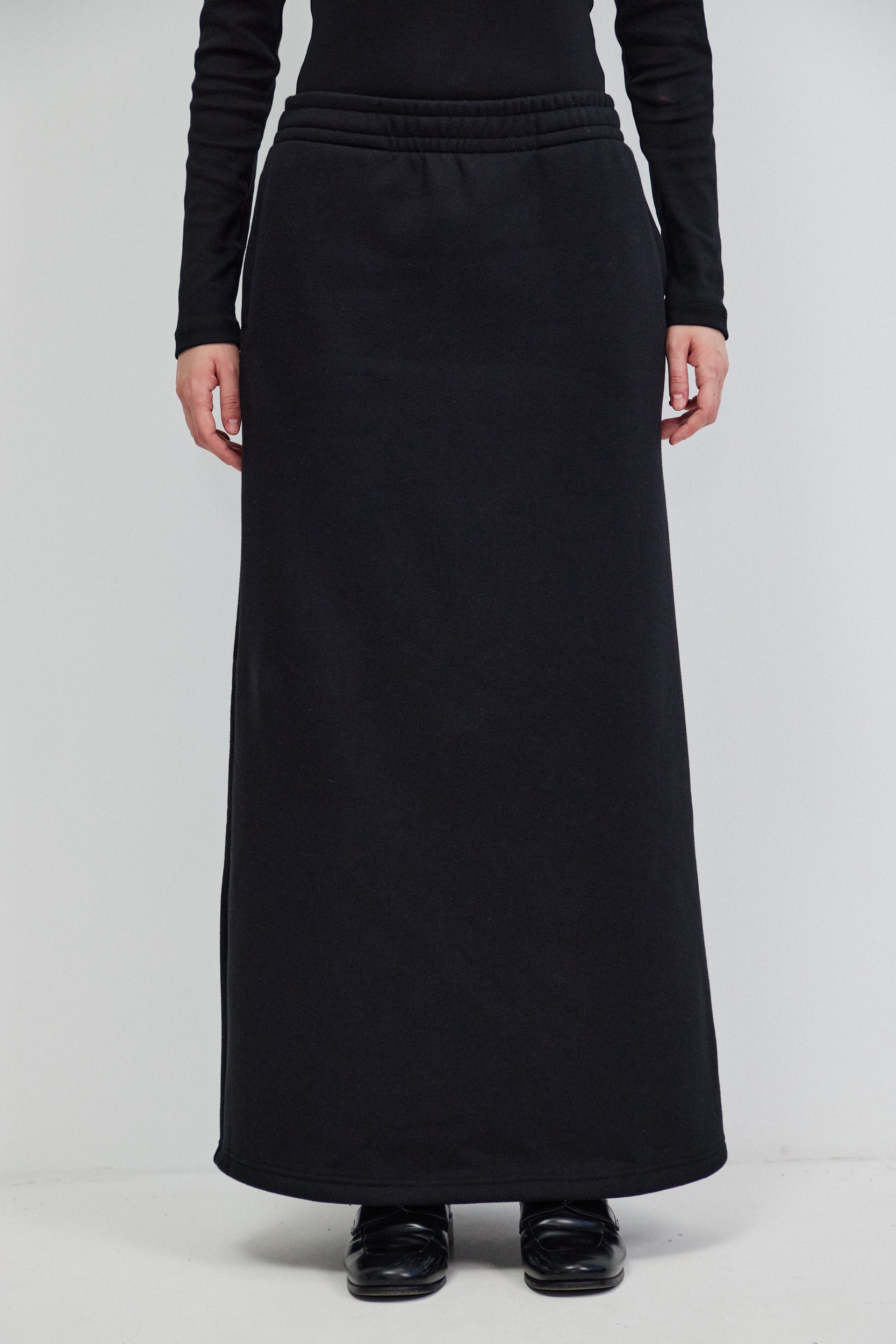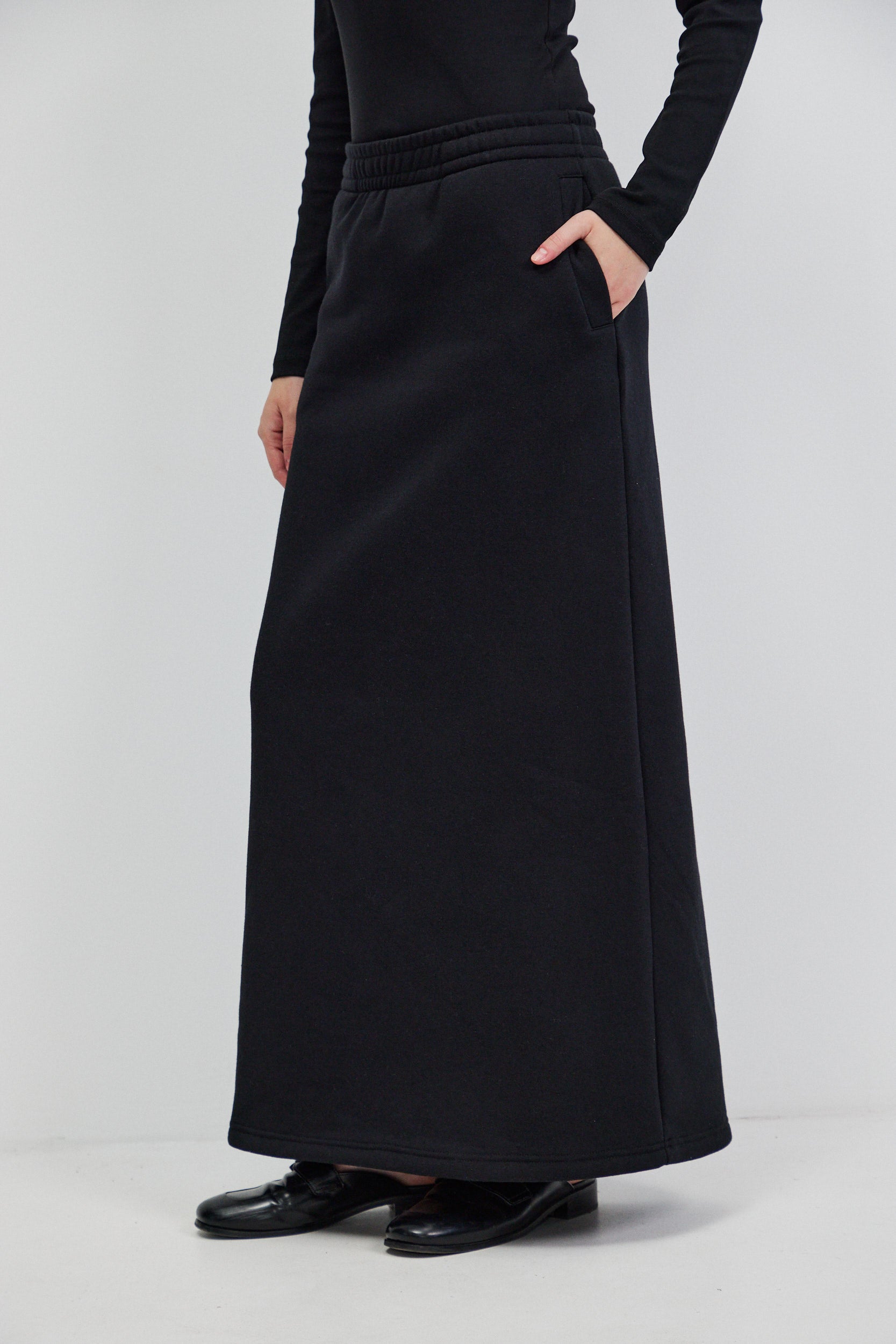 חצאית מקסי שחורה מבד פוטר עבה ורך, בגזרה ישרה ומדויקת. לחצאית מותן עם רצועת גומי רחבה בעלת נוכחות נקייה וכיסים צידיים המשולבים בקו מינימליסטי.