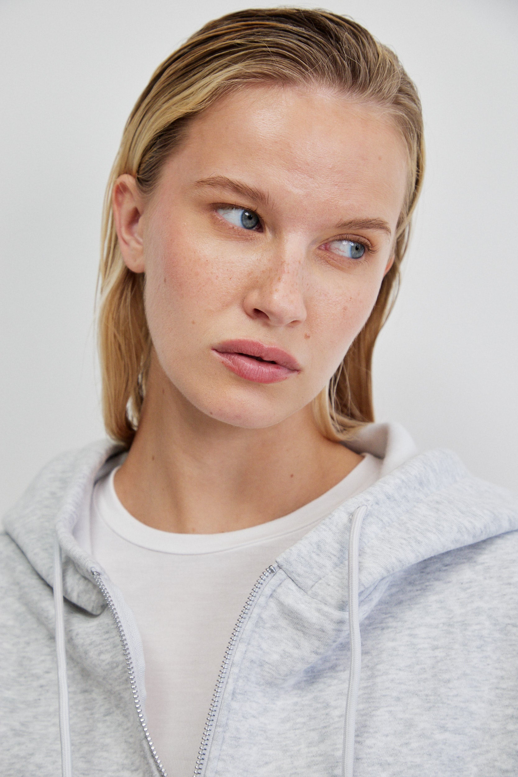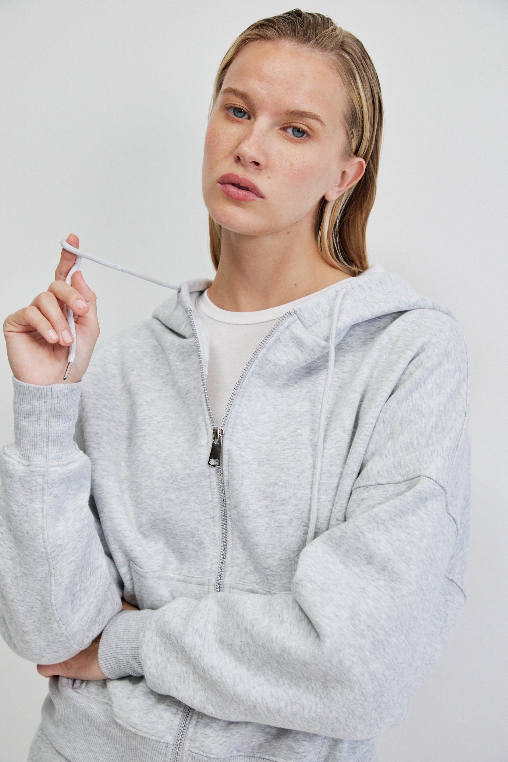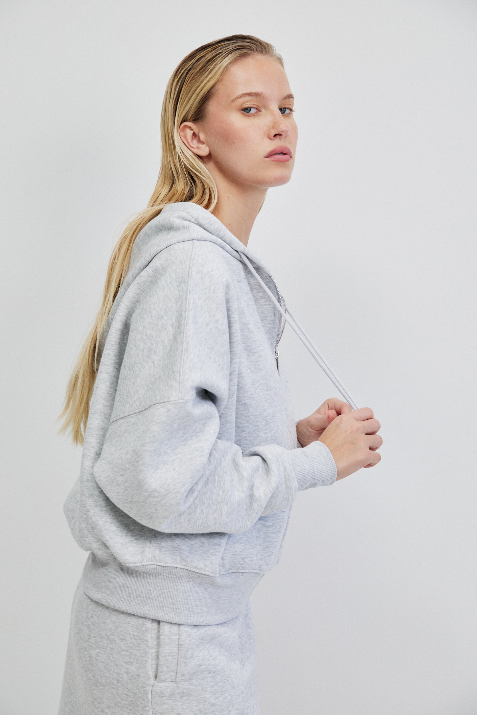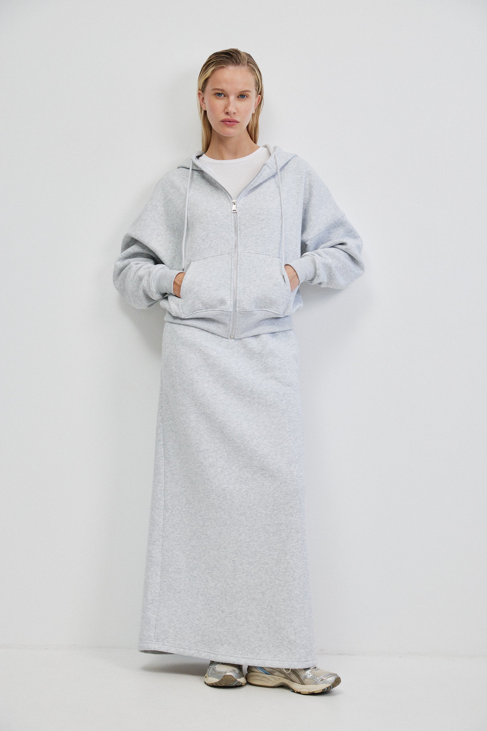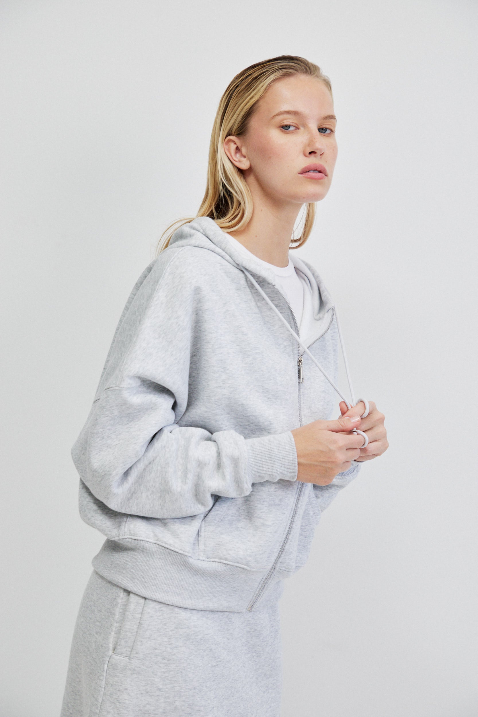 לסווטשירט כיס קדמי רחב המוטמע בגזרה באופן אדריכלי ומוסיף שכבה של פונקציונליות מדויקת ושרוולים ארוכים בסיומת מנז׳ט ורוכסן קדמי ארוך בגימור מתכתי היוצר קו אנכי חד, עם קפוצ’ון מבני ושרוכים דקים.
