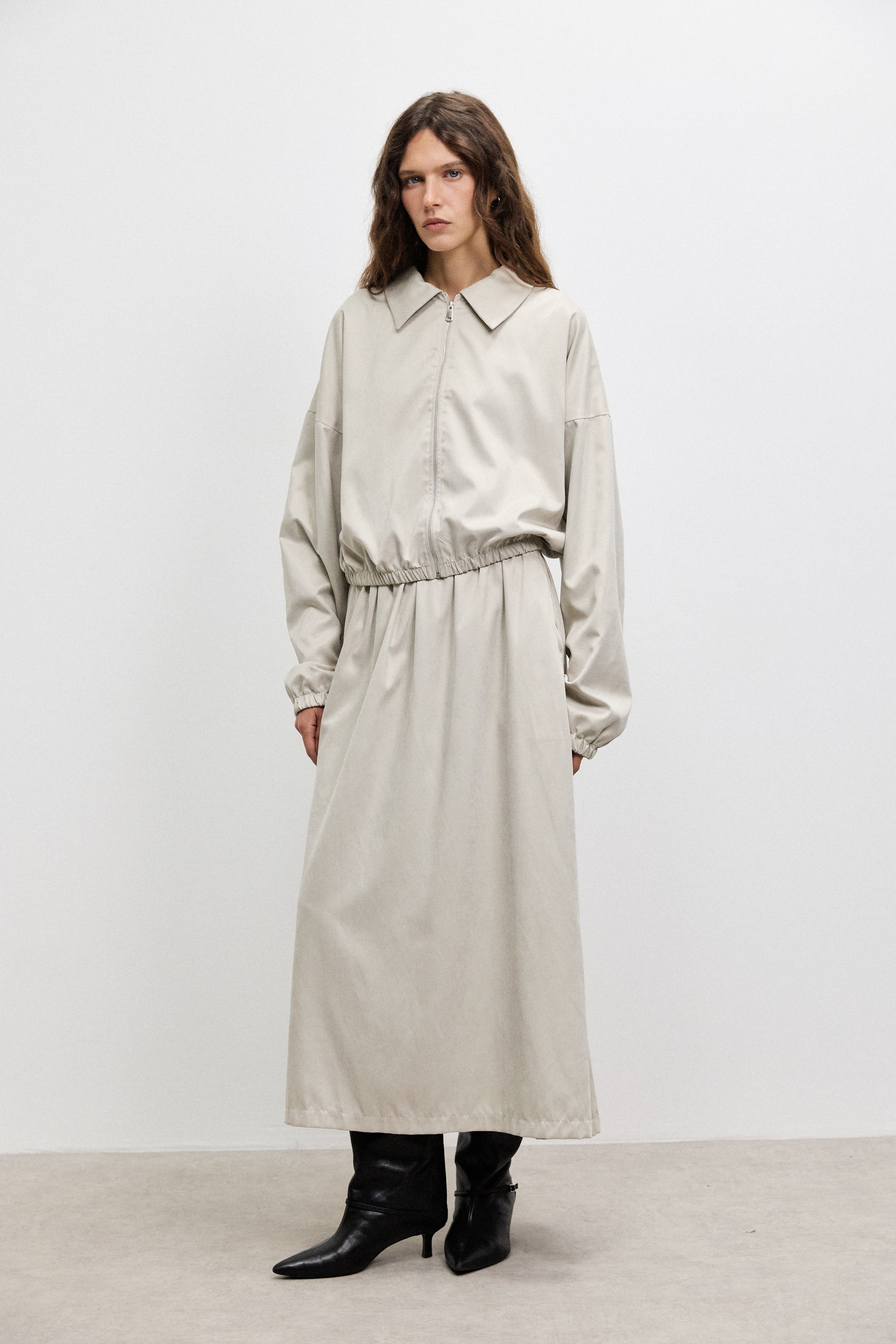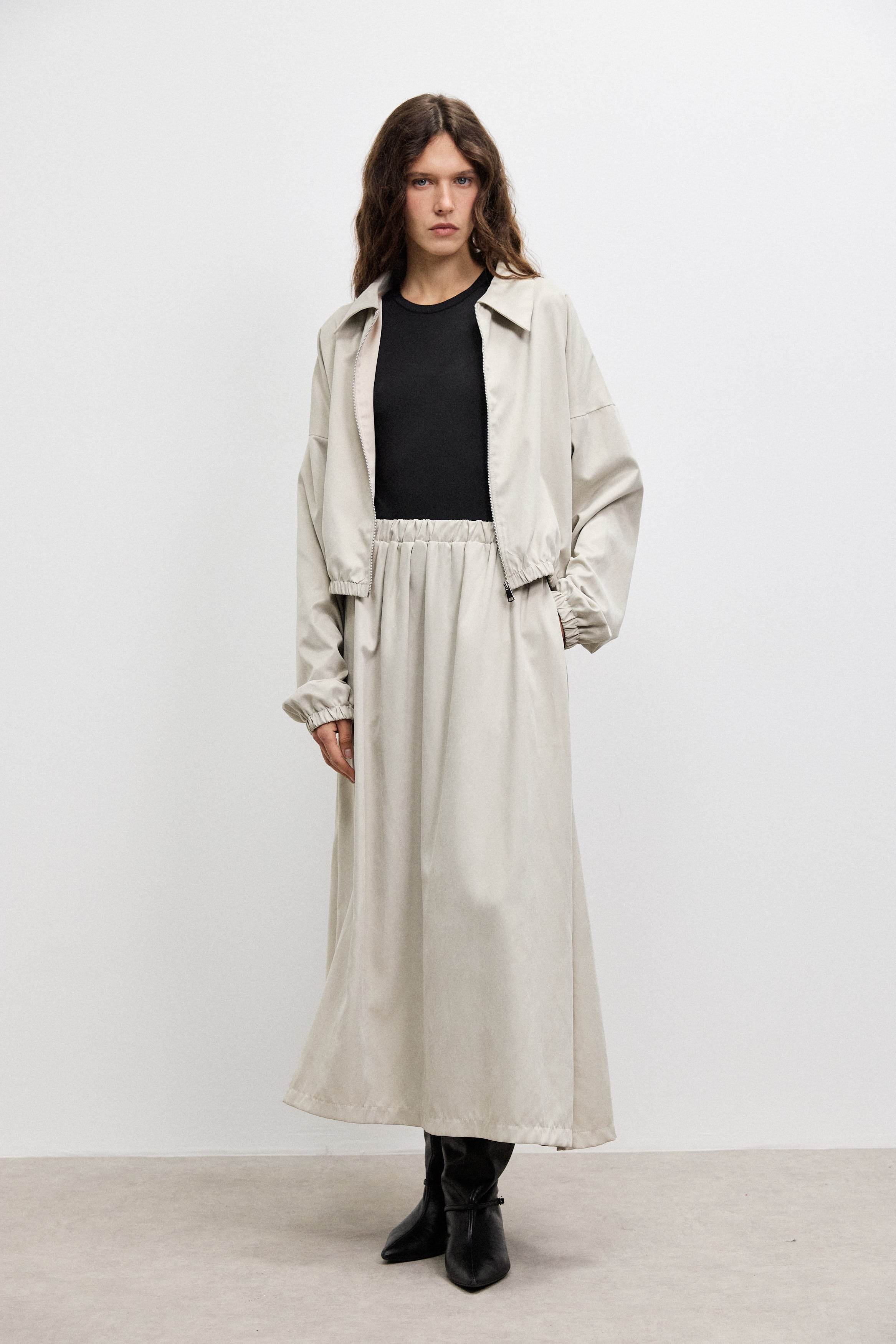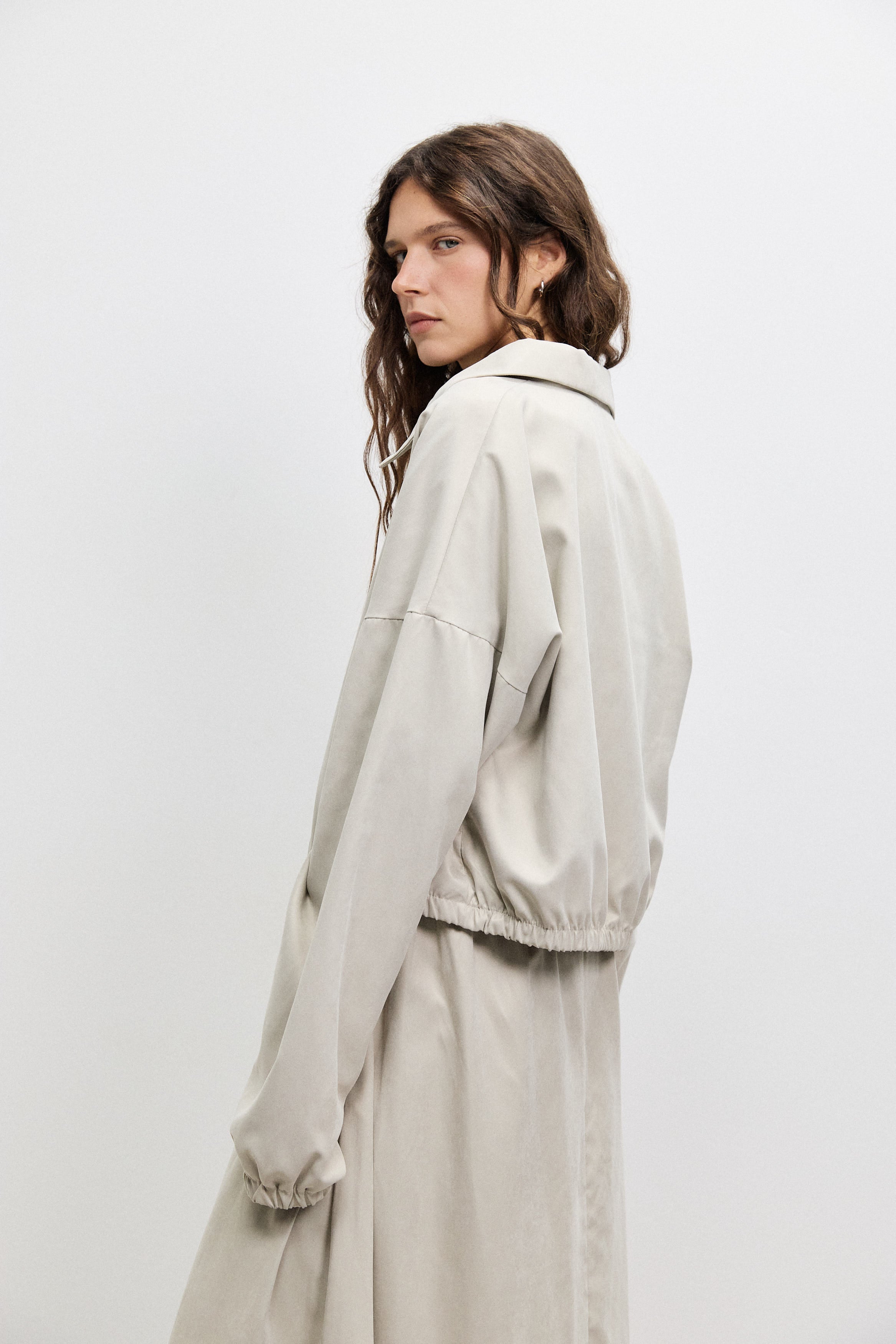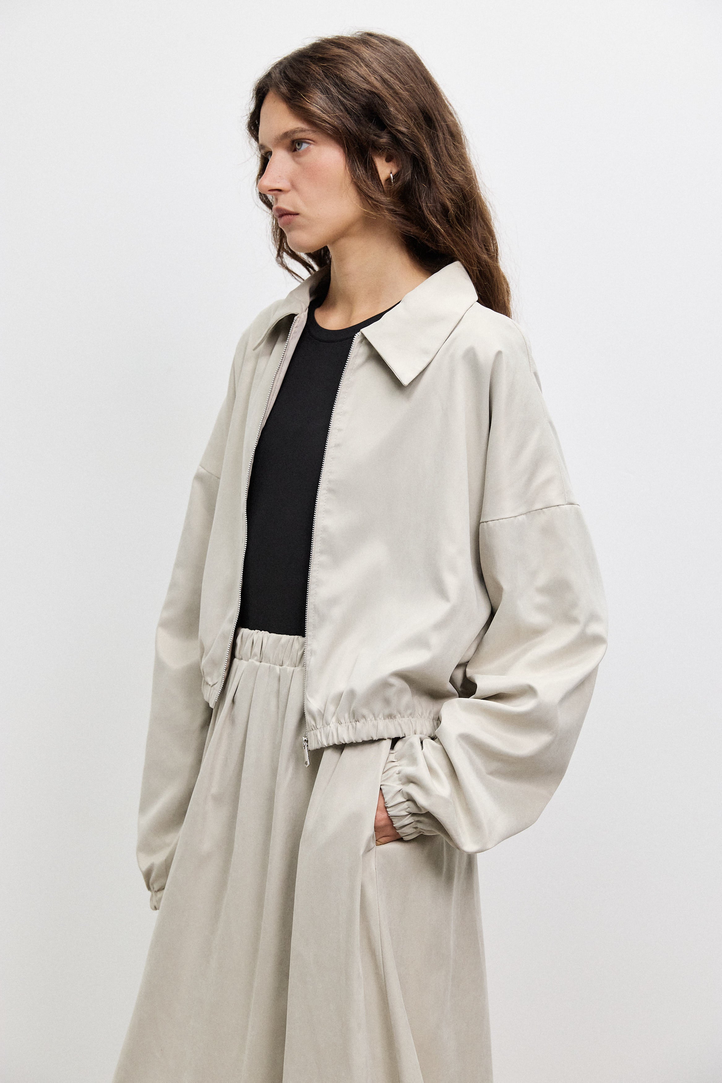 ז'קט בומבר בגזרה נקייה עם גומי בחלק התחתון. כולל בטנת סאטן, צווארון ורוכסן בגימור חלק ומוקפד. פריט על-זמני עם נוכחות שקטה, משתלב באופן טבעי עם חצאית מילאנו להשלמת הסט.