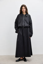 חצאית מקסי בגוון שחור עמוק, עשויה בד בעל מגע חלק ונפילה טבעית שיוצרת תנועה נקייה ולא מתאמצת. לחצאית גזרה רחבה ורפויה, קו מותן אלסטית נקי וכיסי צד.