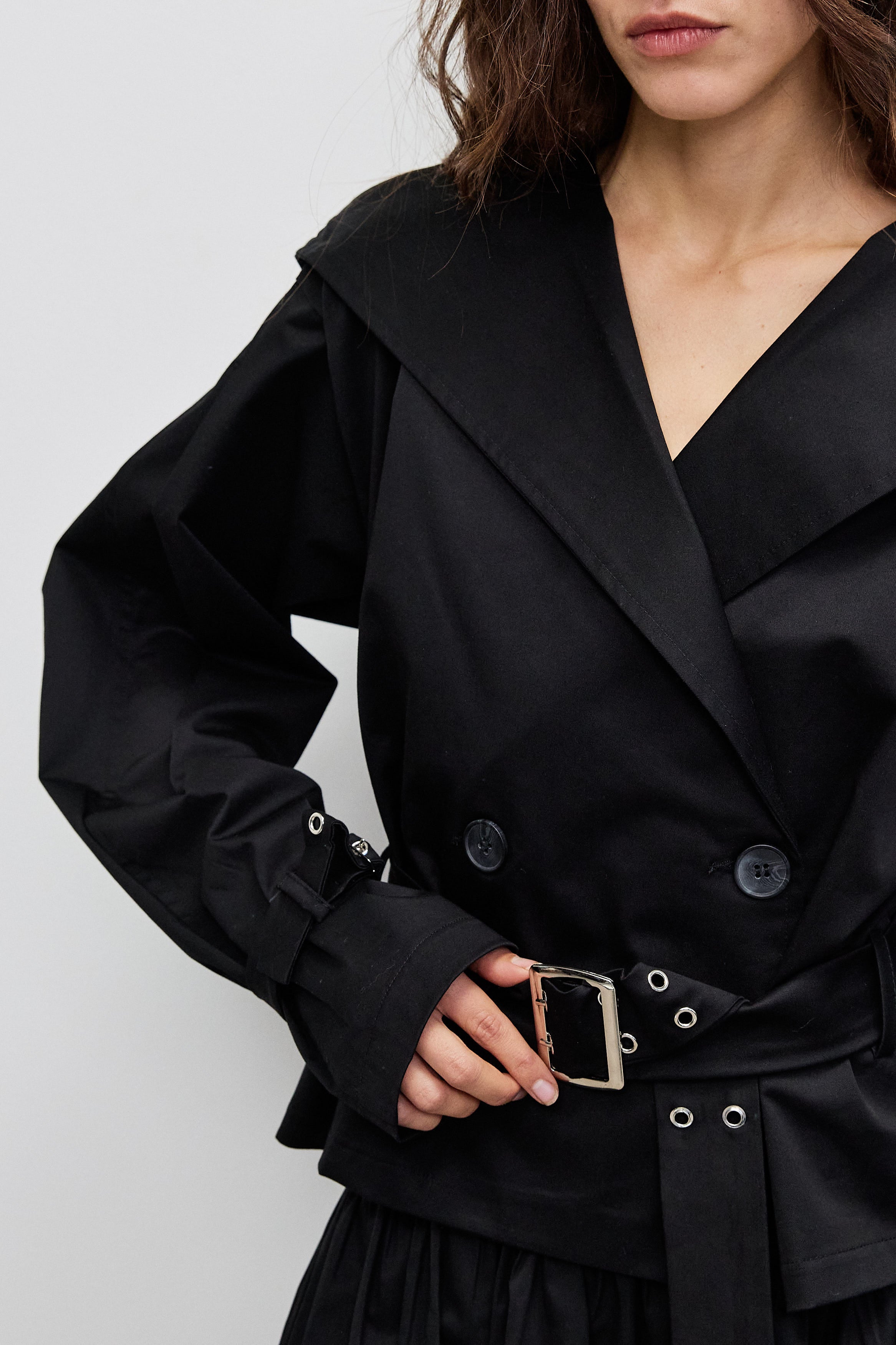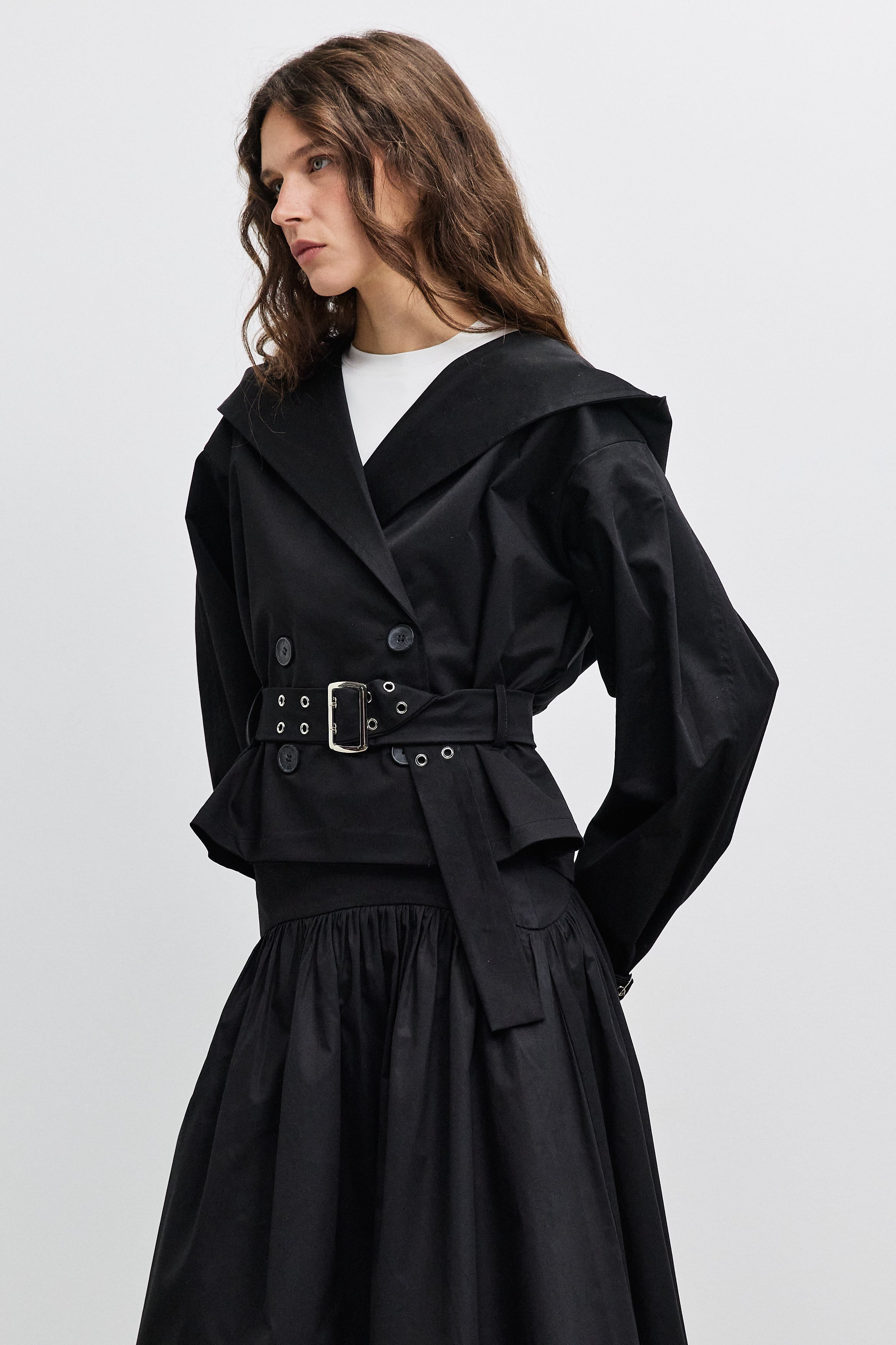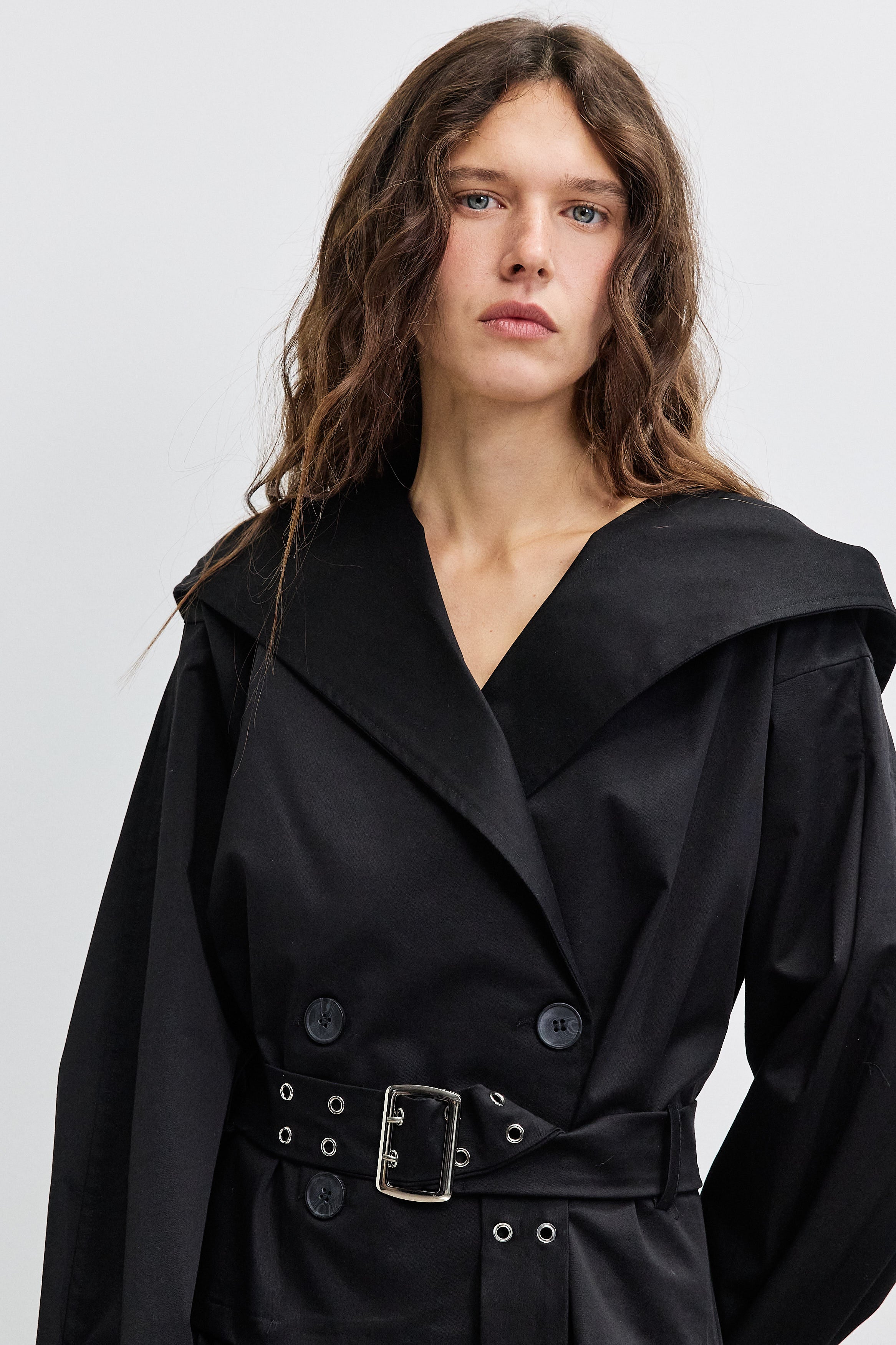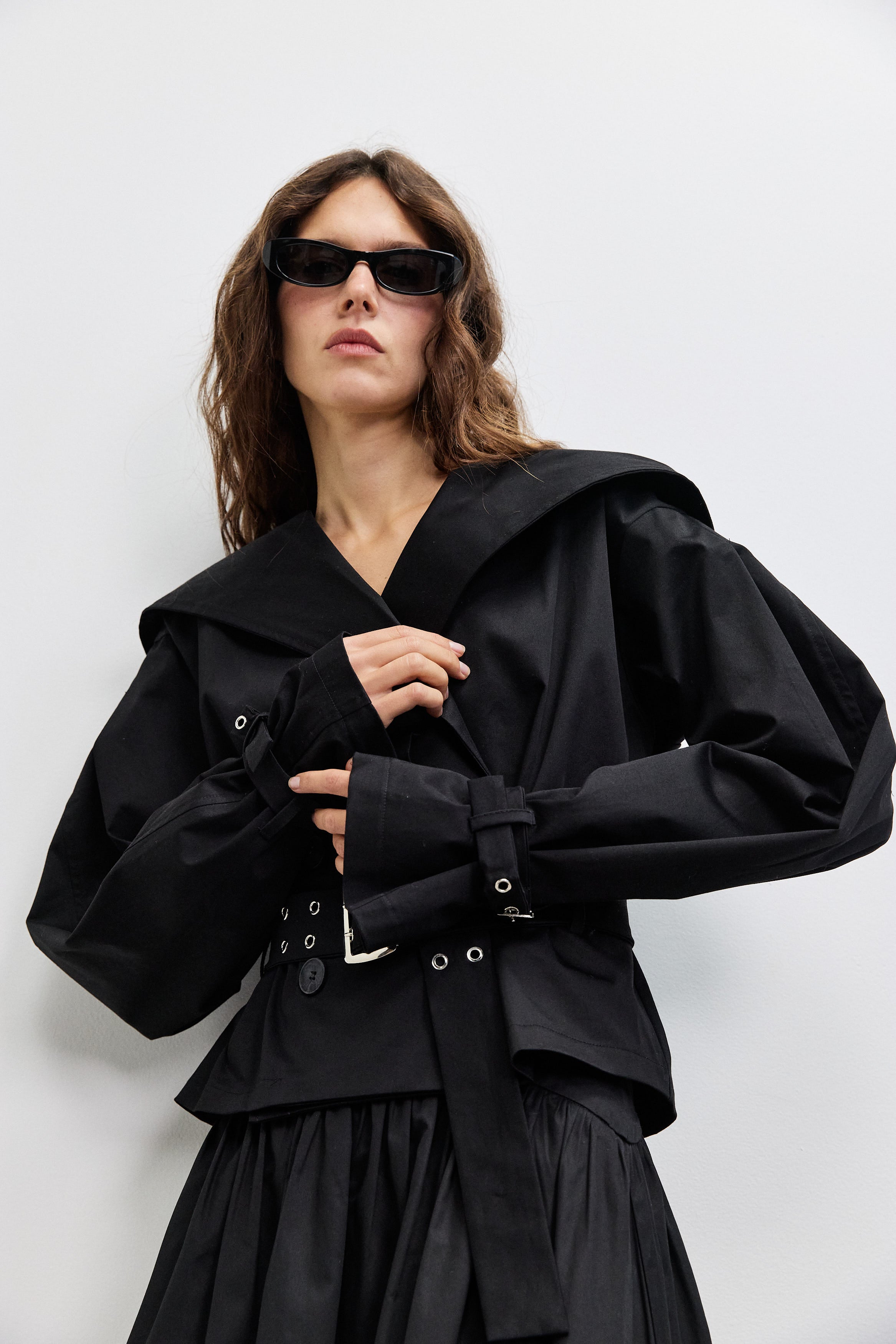 ז'קט טרנץ' קצר מאריג כותנה בעיצוב המשלב קווים נקיים וטוויסט מודרני. כולל קפוצ'ון גדול וגזרה מאוזנת בהשראת טרנץ', היוצרים מראה ייחודי ולא מתאמץ. מגיע עם חגורה להדגשת המותן.