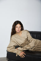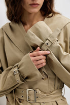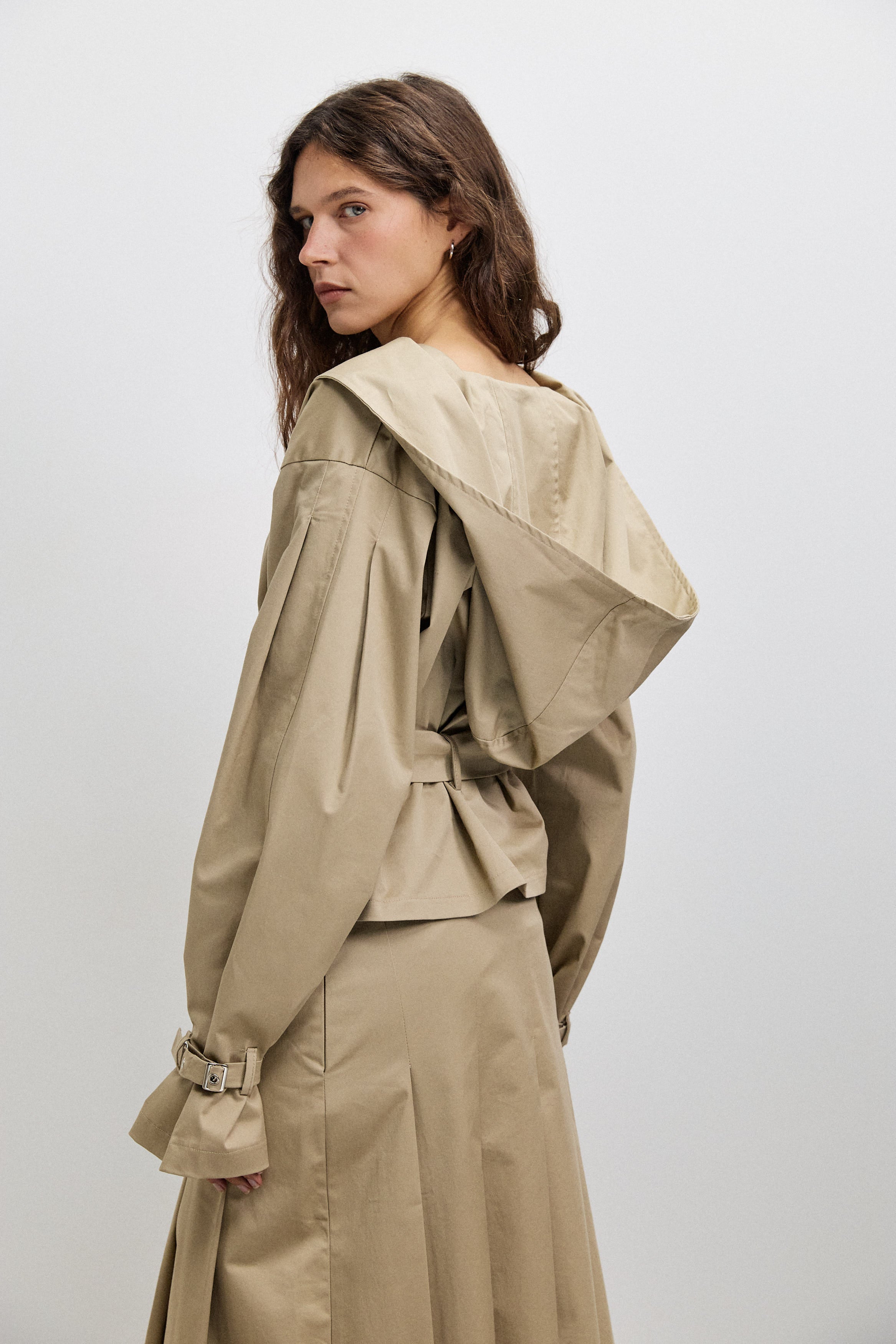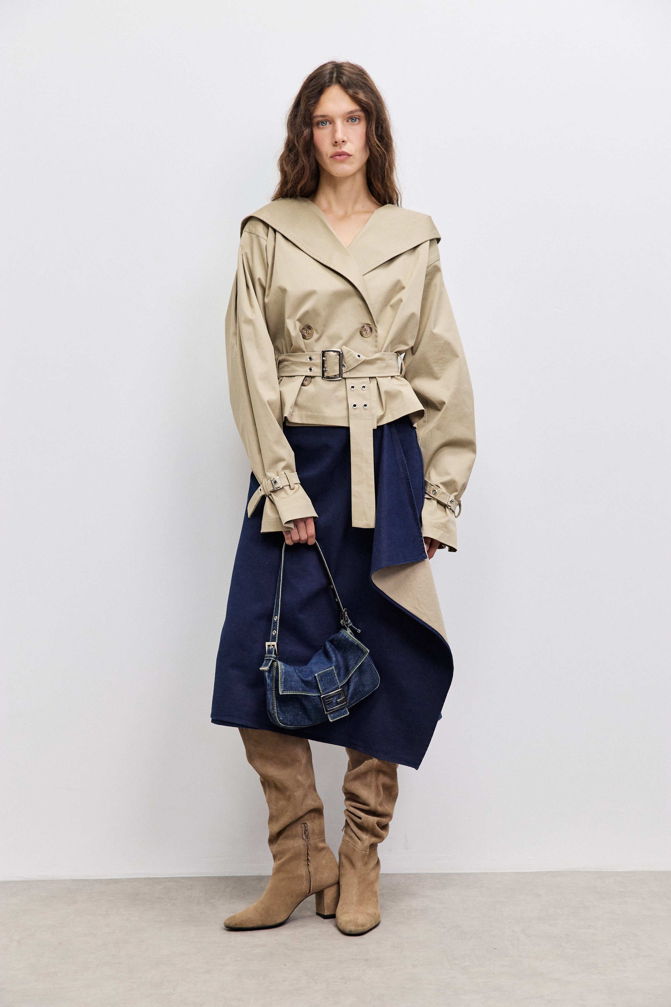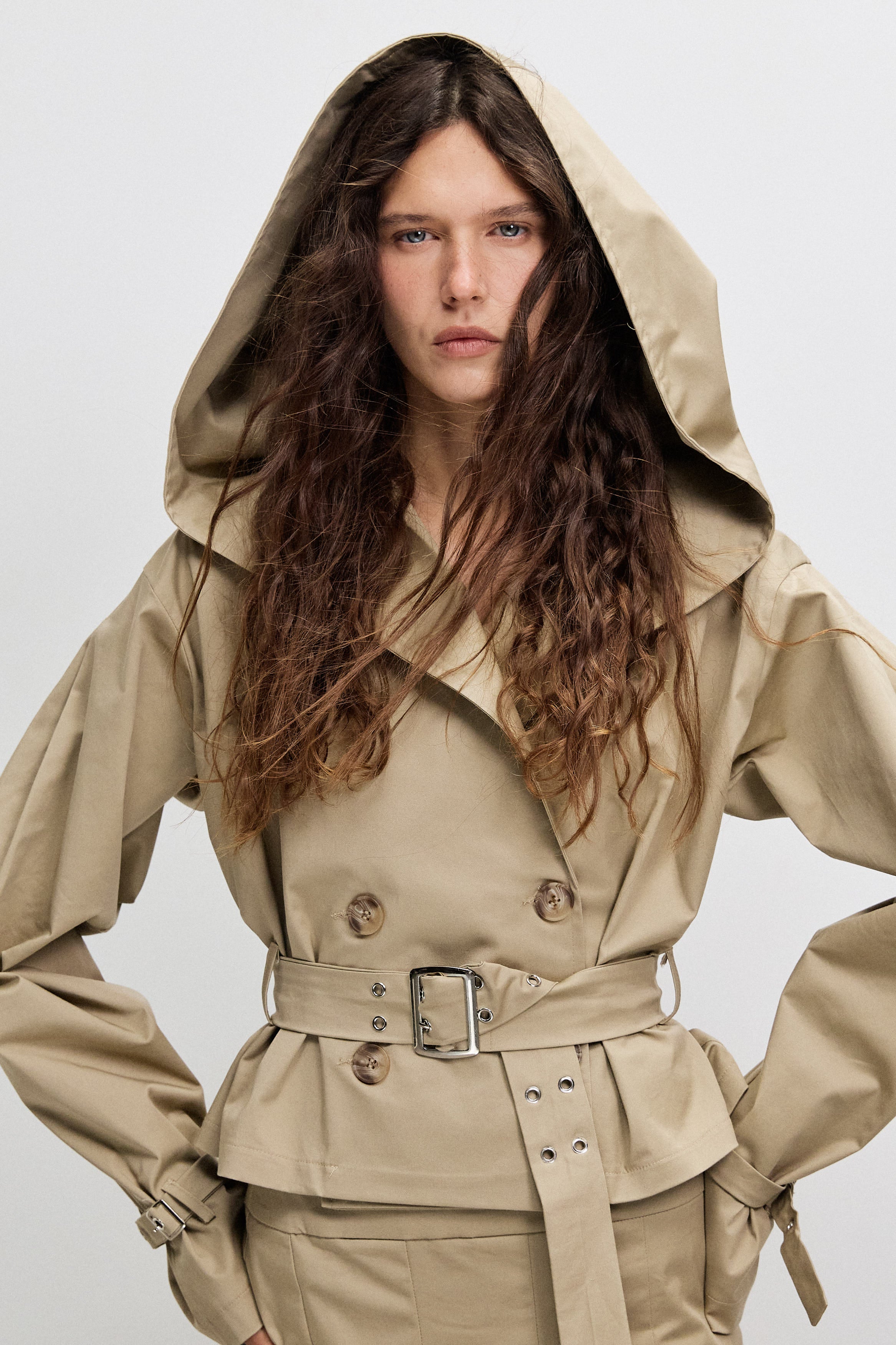 ז'קט טרנץ' קצר מאריג כותנה בעיצוב המשלב קווים נקיים וטוויסט מודרני. כולל קפוצ'ון גדול וגזרה מאוזנת בהשראת טרנץ', היוצרים מראה ייחודי ולא מתאמץ. מגיע עם חגורה להדגשת המותן, ומשתלב באופן טבעי עם חצאית רומי להשלמת לוק מוקפד.