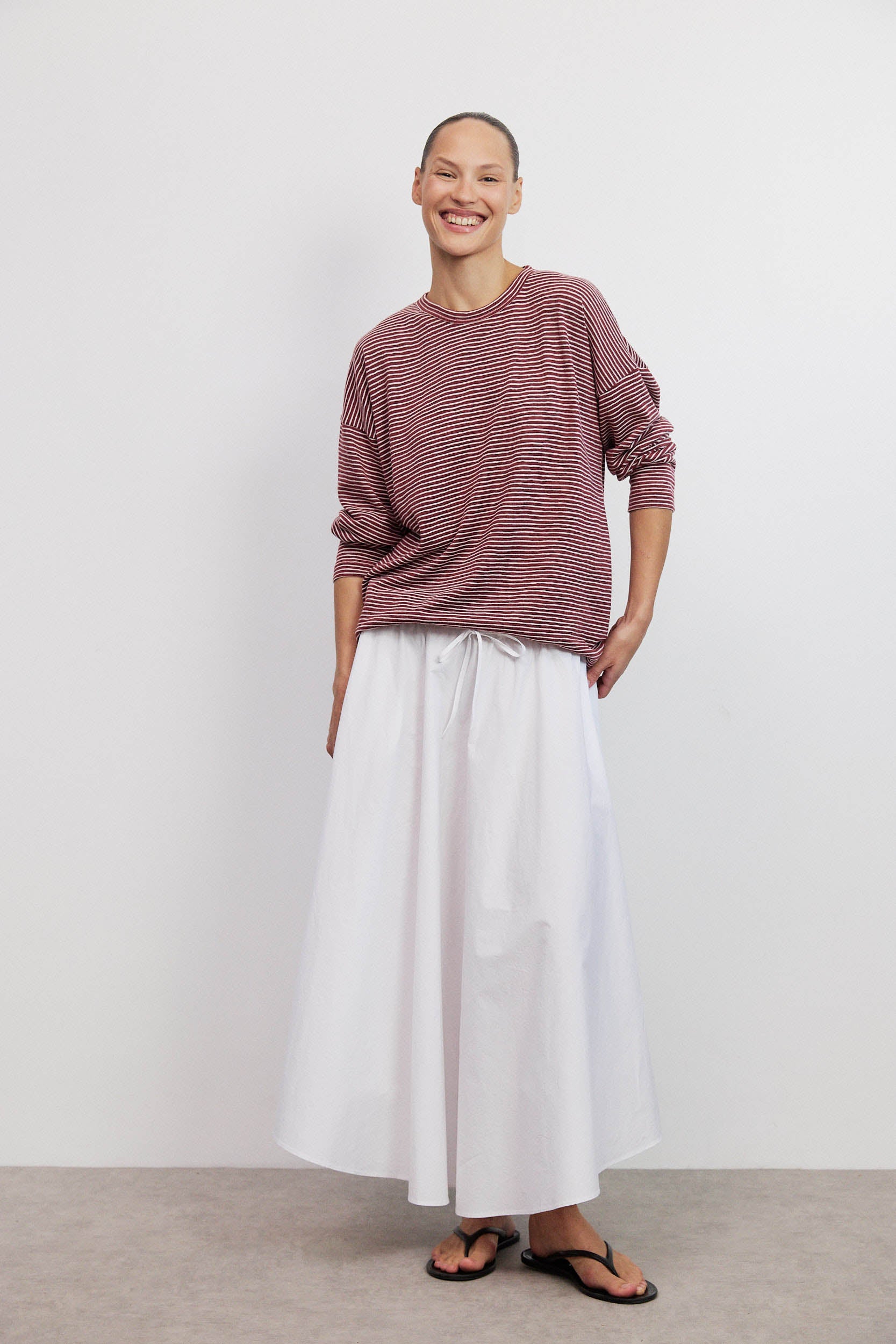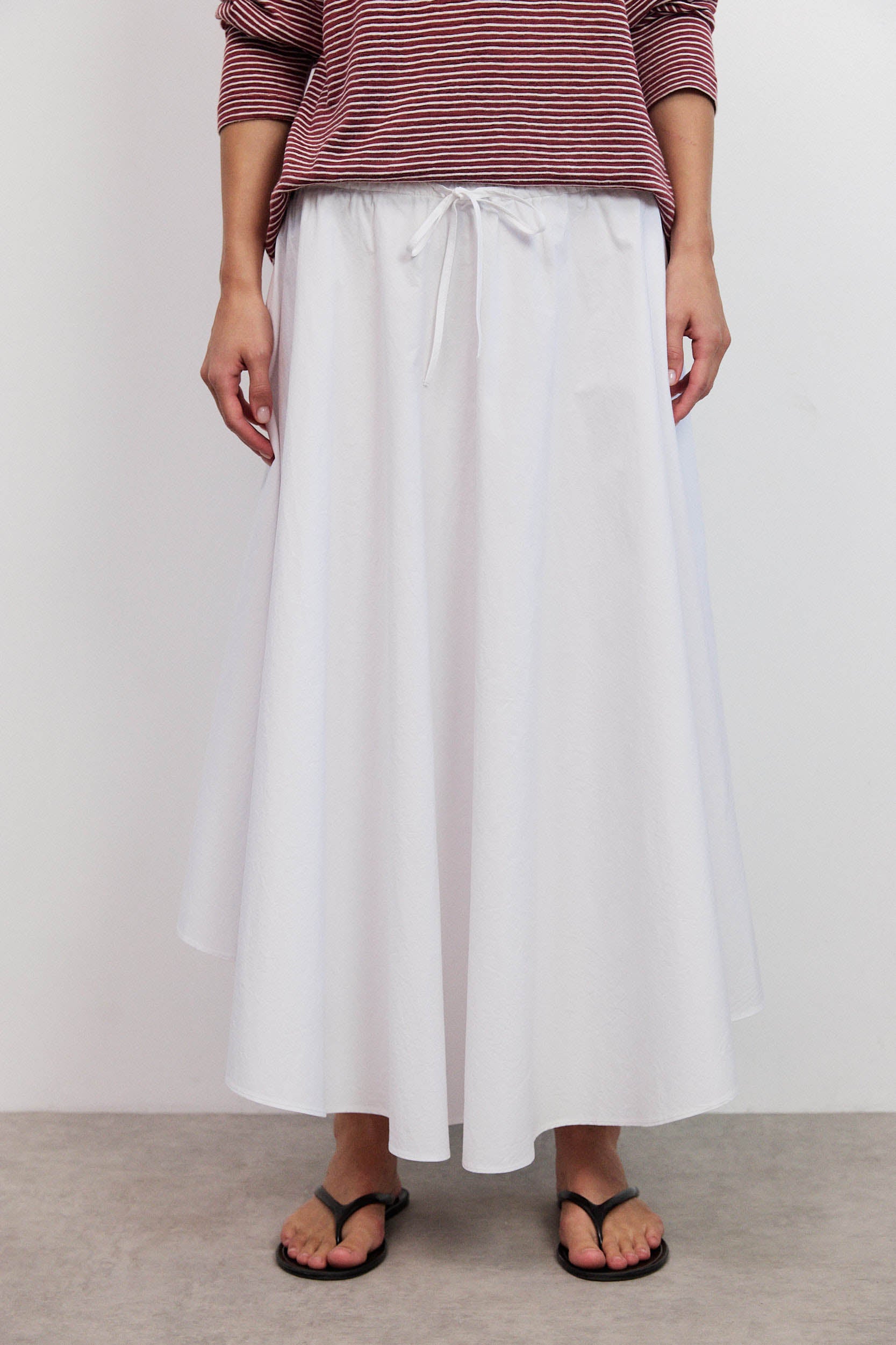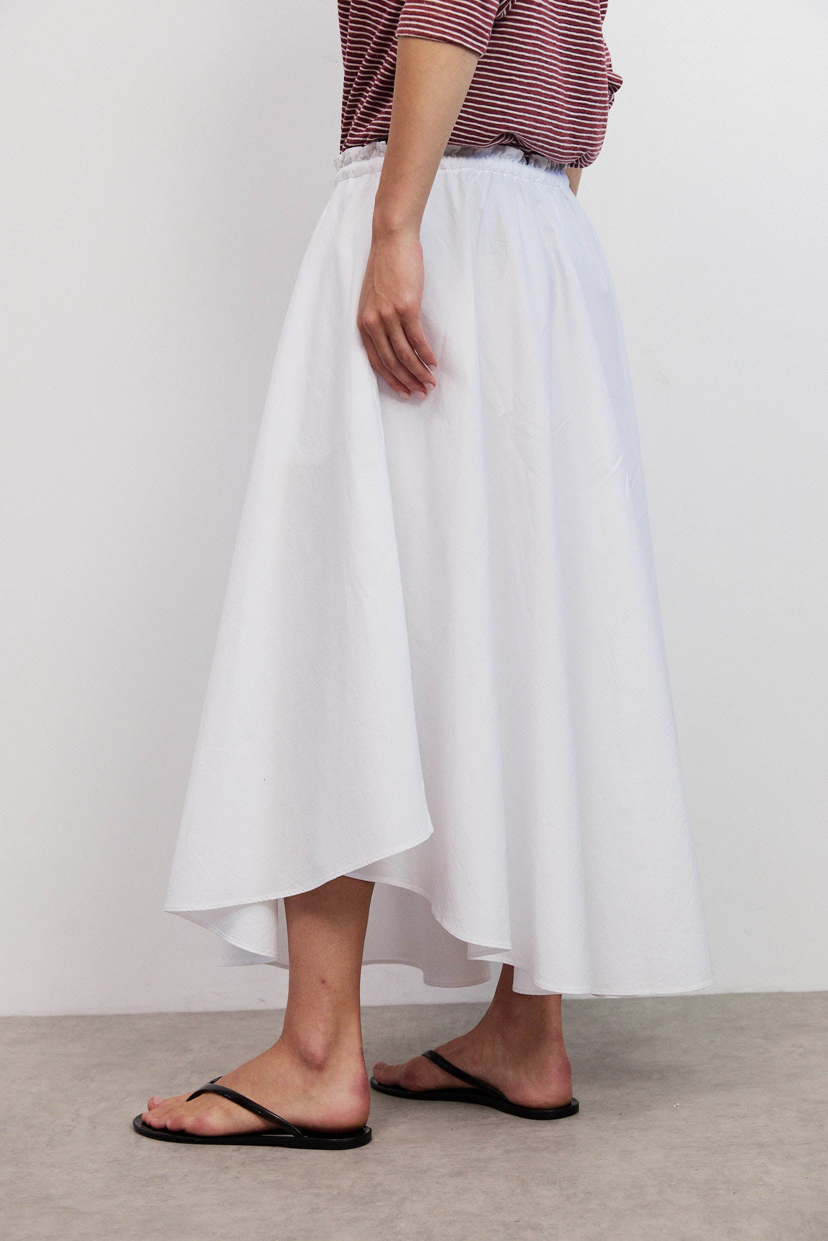 חצאית קלילה ונשפכת, עשוית בד כותנה אוורירי בעלת גזרה רחבה ומשוחררת, עם חיתוך א-סימטרי עדין בתחתית וקו מותן אלסטי עם שרוך מתכוונן