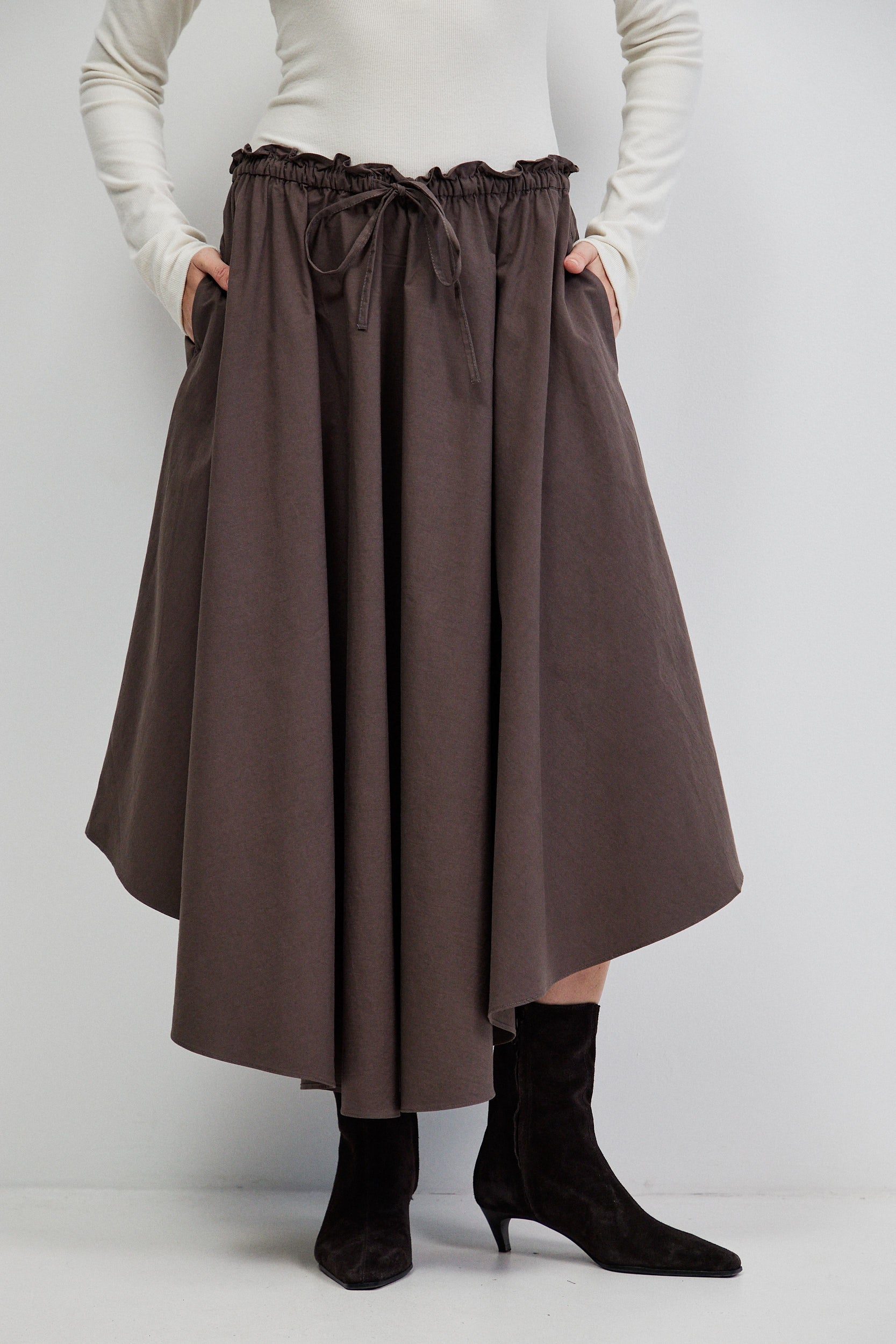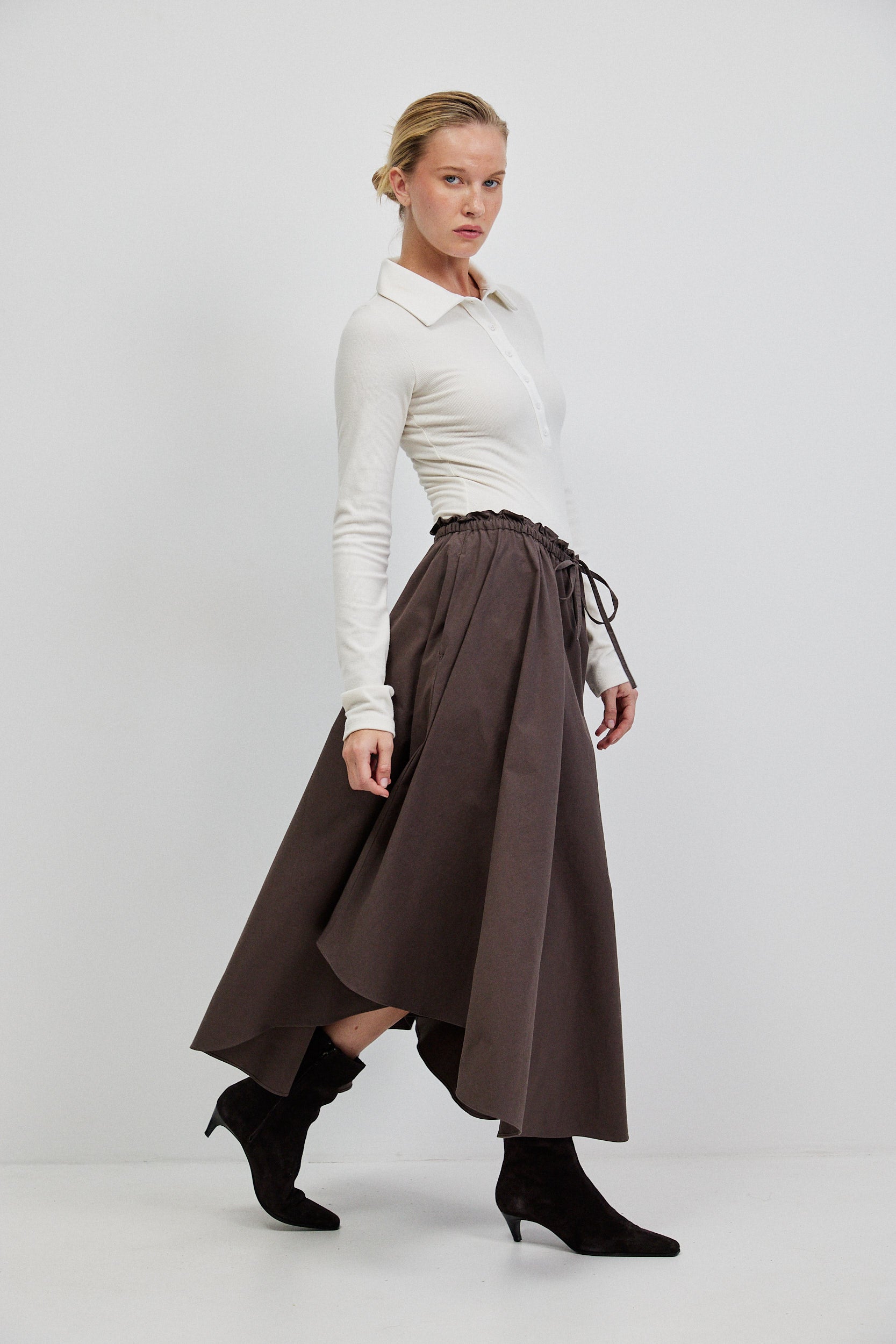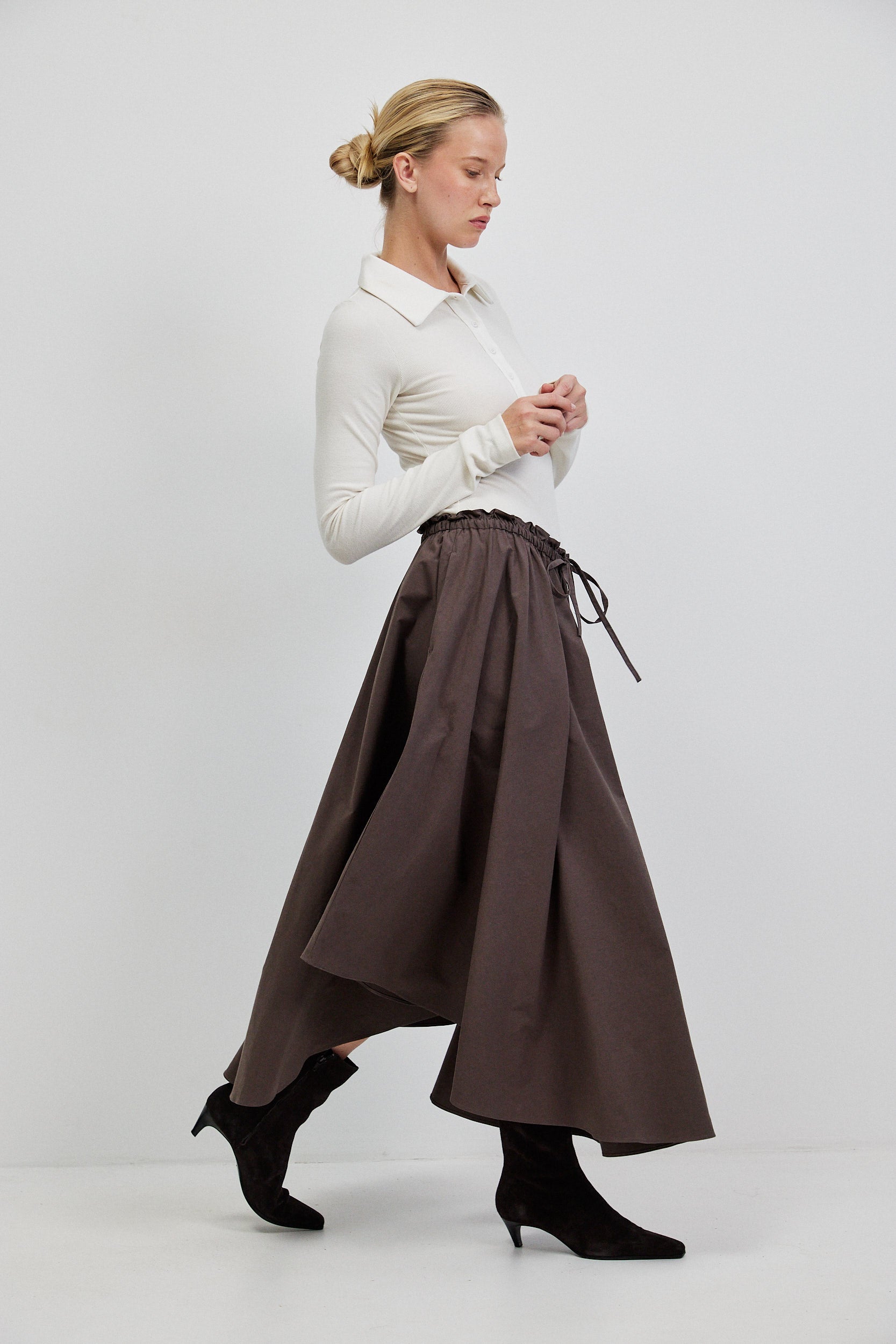 חצאית קלילה ונשפכת, עשוית בד כותנה אוורירי בעלת גזרה רחבה ומשוחררת, עם חיתוך א-סימטרי עדין בתחתית וקו מותן אלסטי עם שרוך מתכוונן