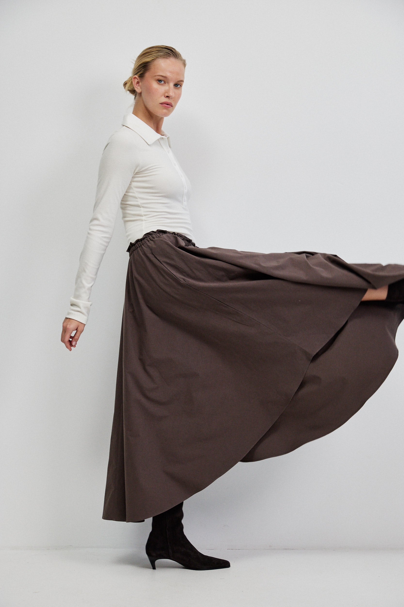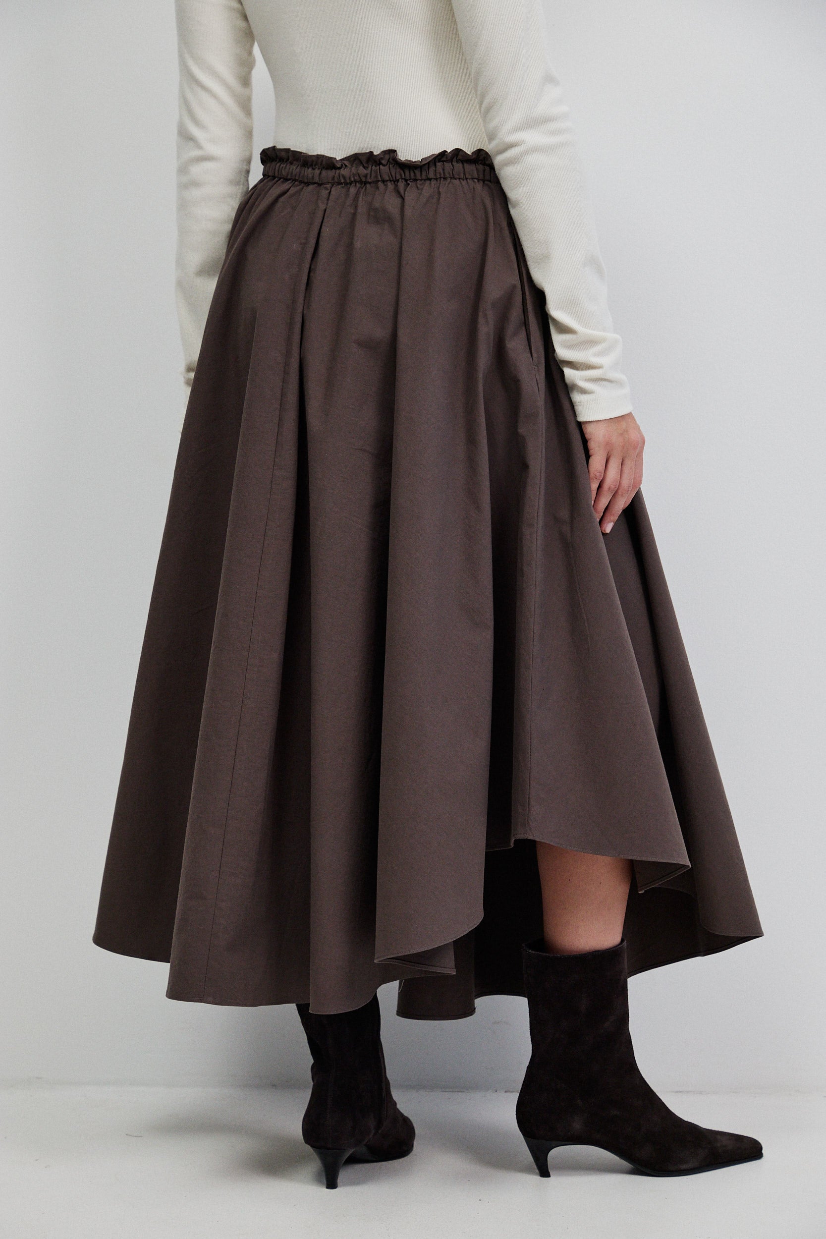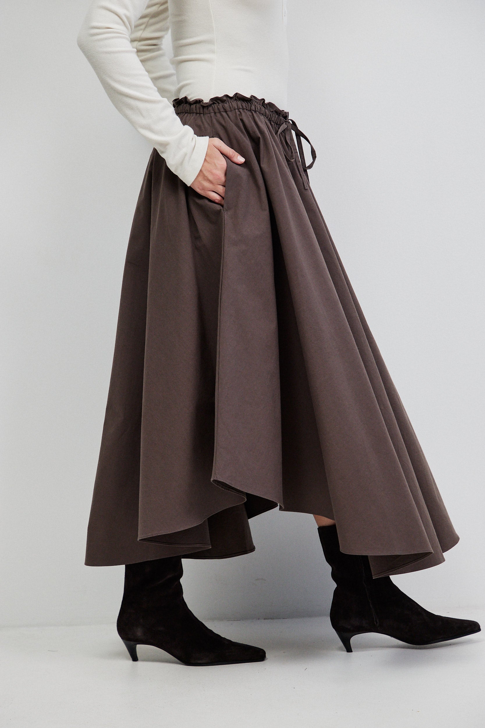 חצאית קלילה ונשפכת, עשוית בד כותנה אוורירי בעלת גזרה רחבה ומשוחררת, עם חיתוך א-סימטרי עדין בתחתית וקו מותן אלסטי עם שרוך מתכוונן