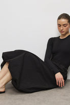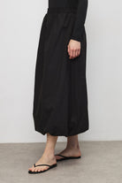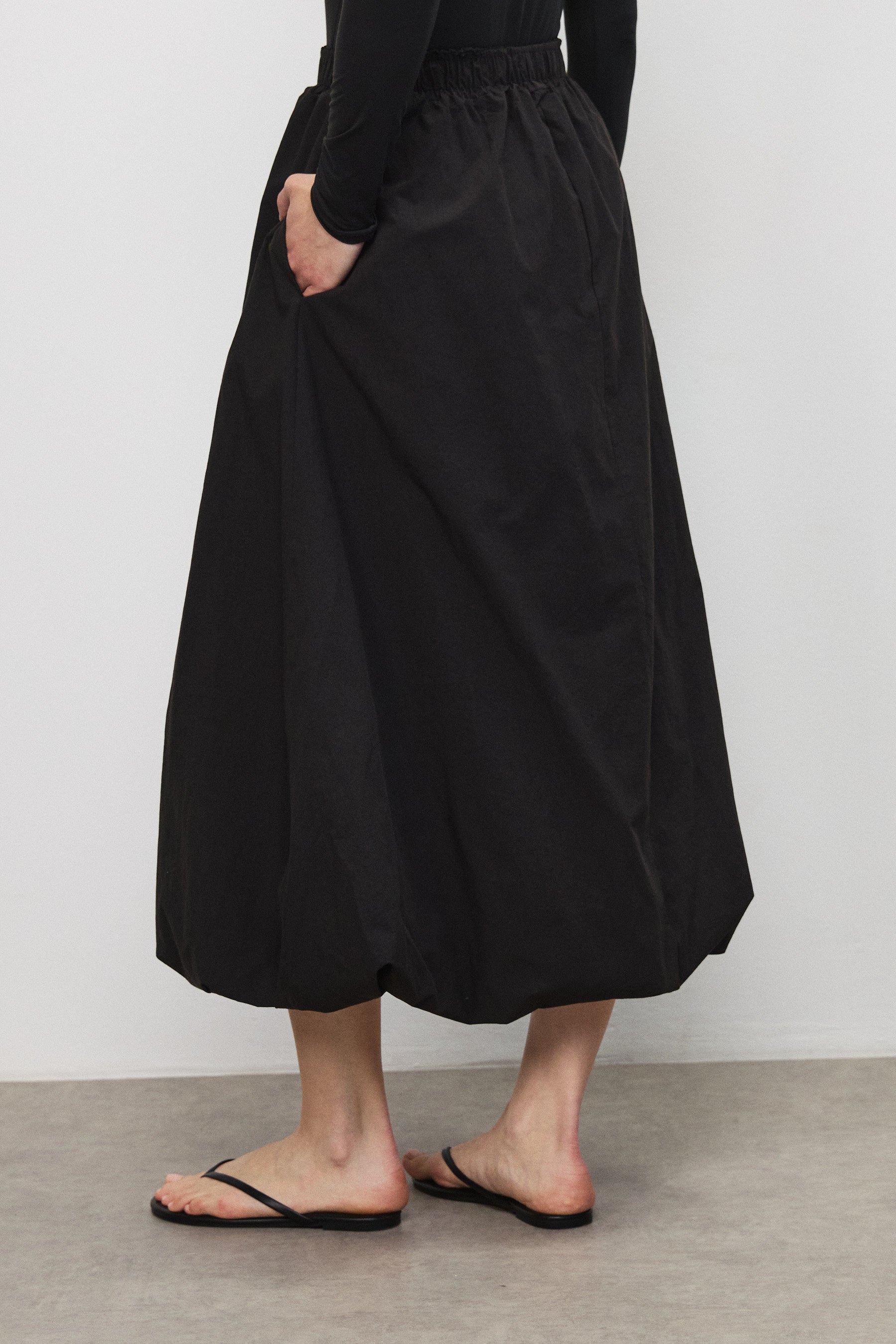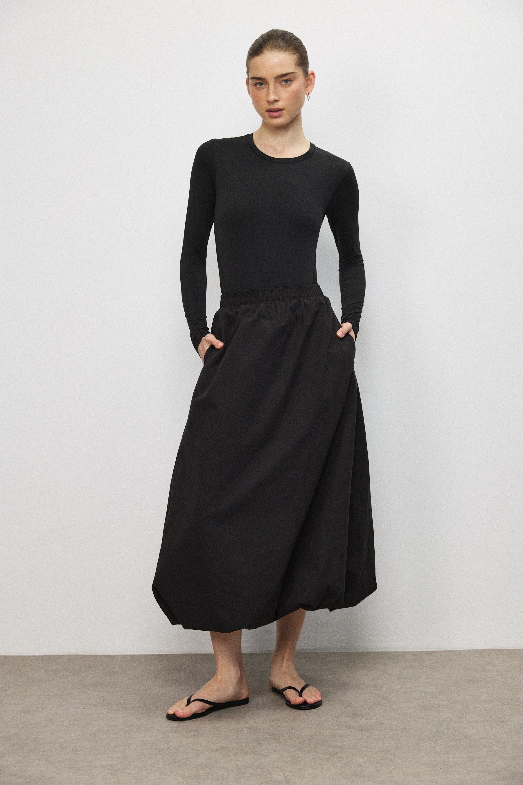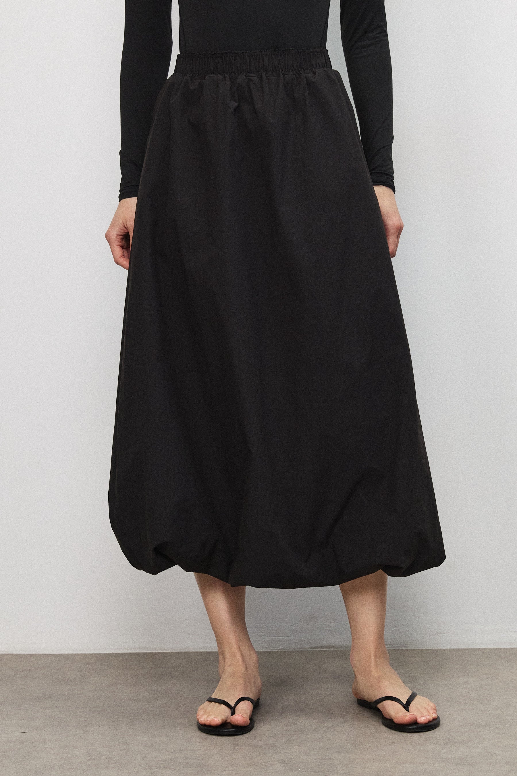 חצאית בלון באורך מידי עשויה 100% כותנה איכותית, בעלת נפח מאוזן ומראה מוקפד. כוללת בטנת סאטן איכותית המעניקה לבישה חלקה ונוחה על הגוף. גומי בקו המותן מאפשר התאמה נוחה וישיבה טבעית.