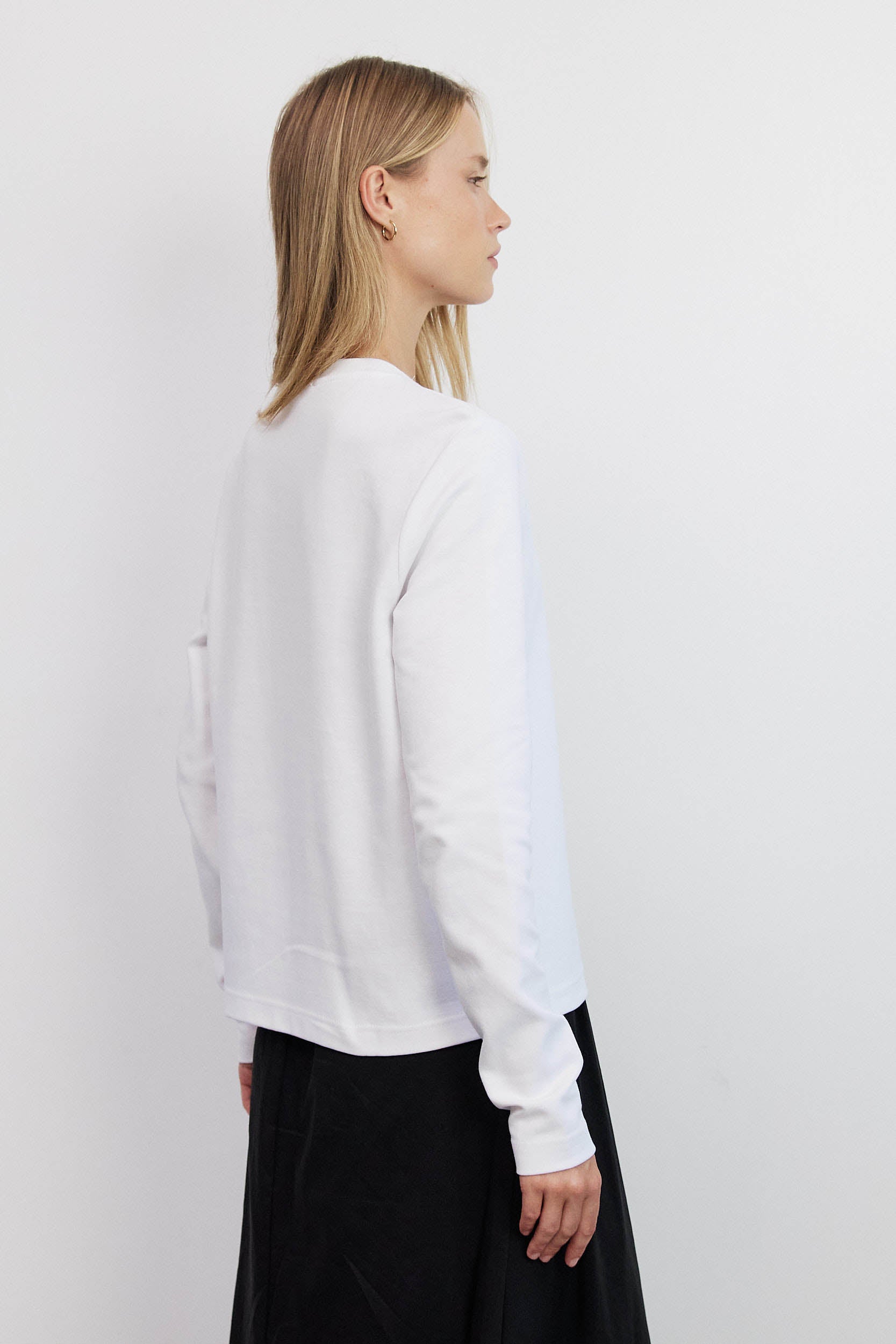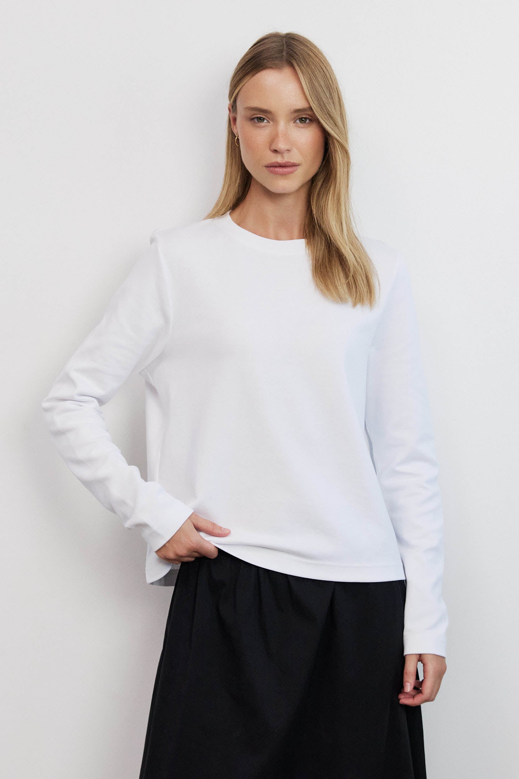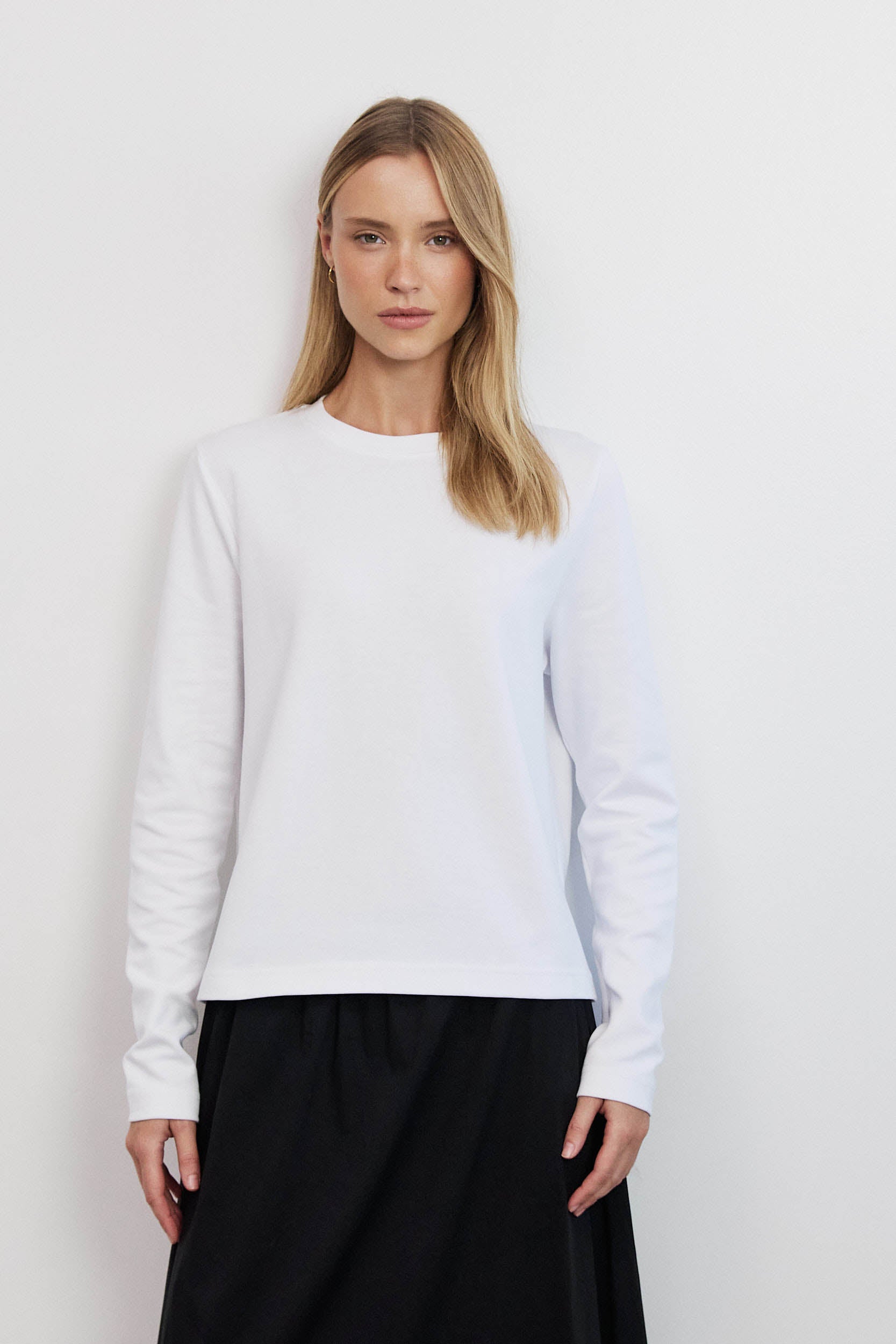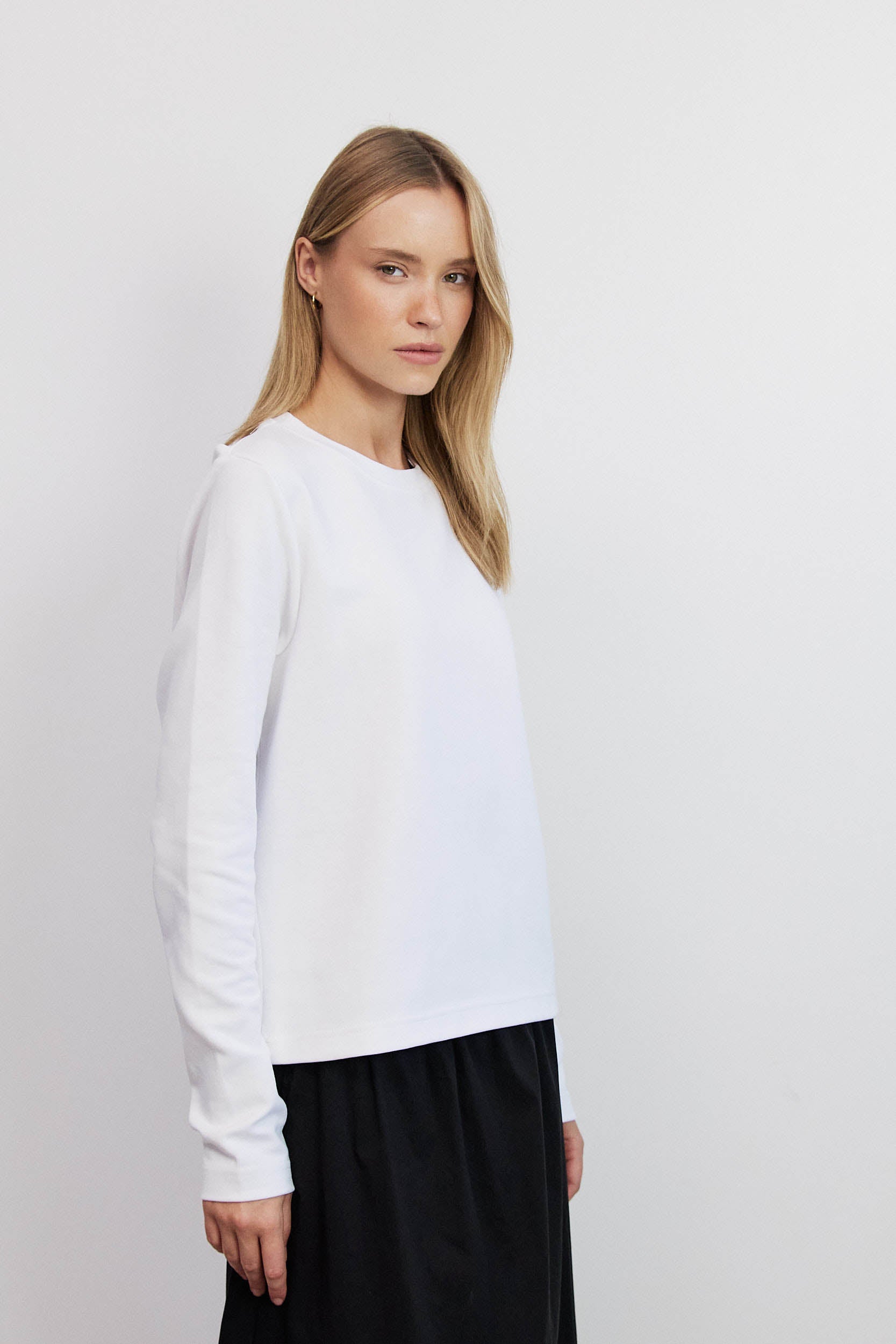 חולצת טי חלקה בגזרה ישרה ומחמיאה עשויה בד רך ,נעים ומעט שקפקף, עם מפתח צוואר עגול קלאסי, בעלת שרוולים ארוכים.