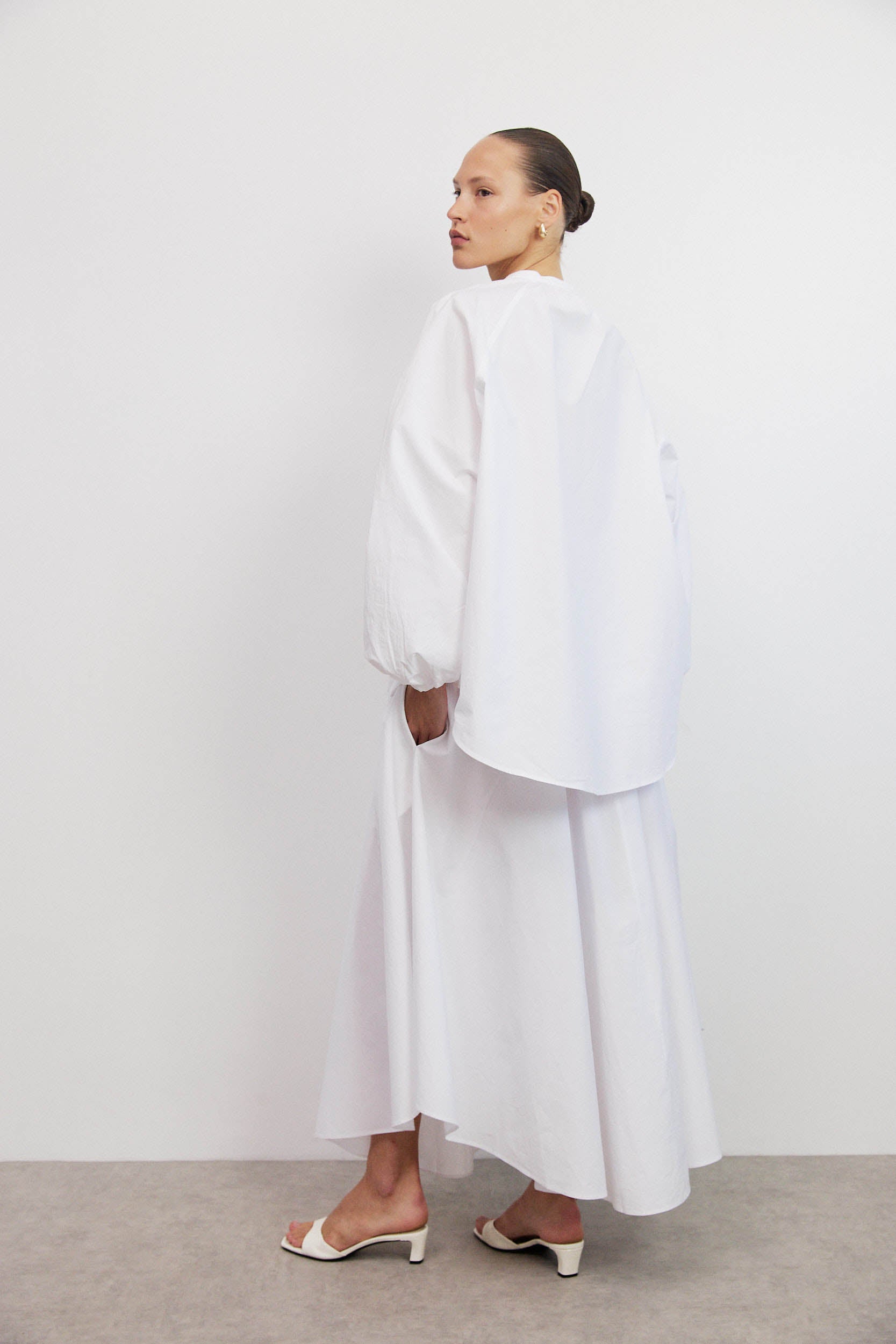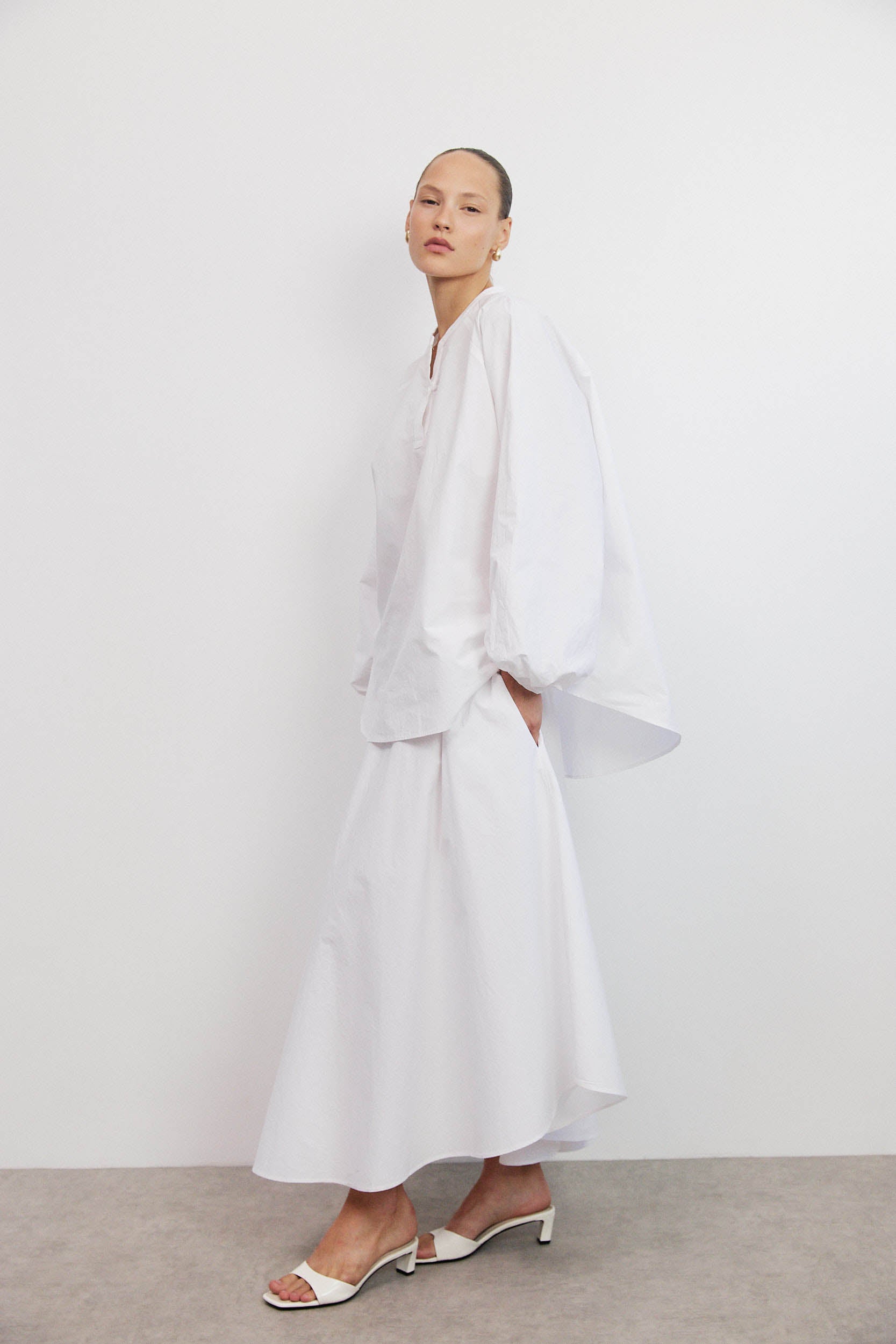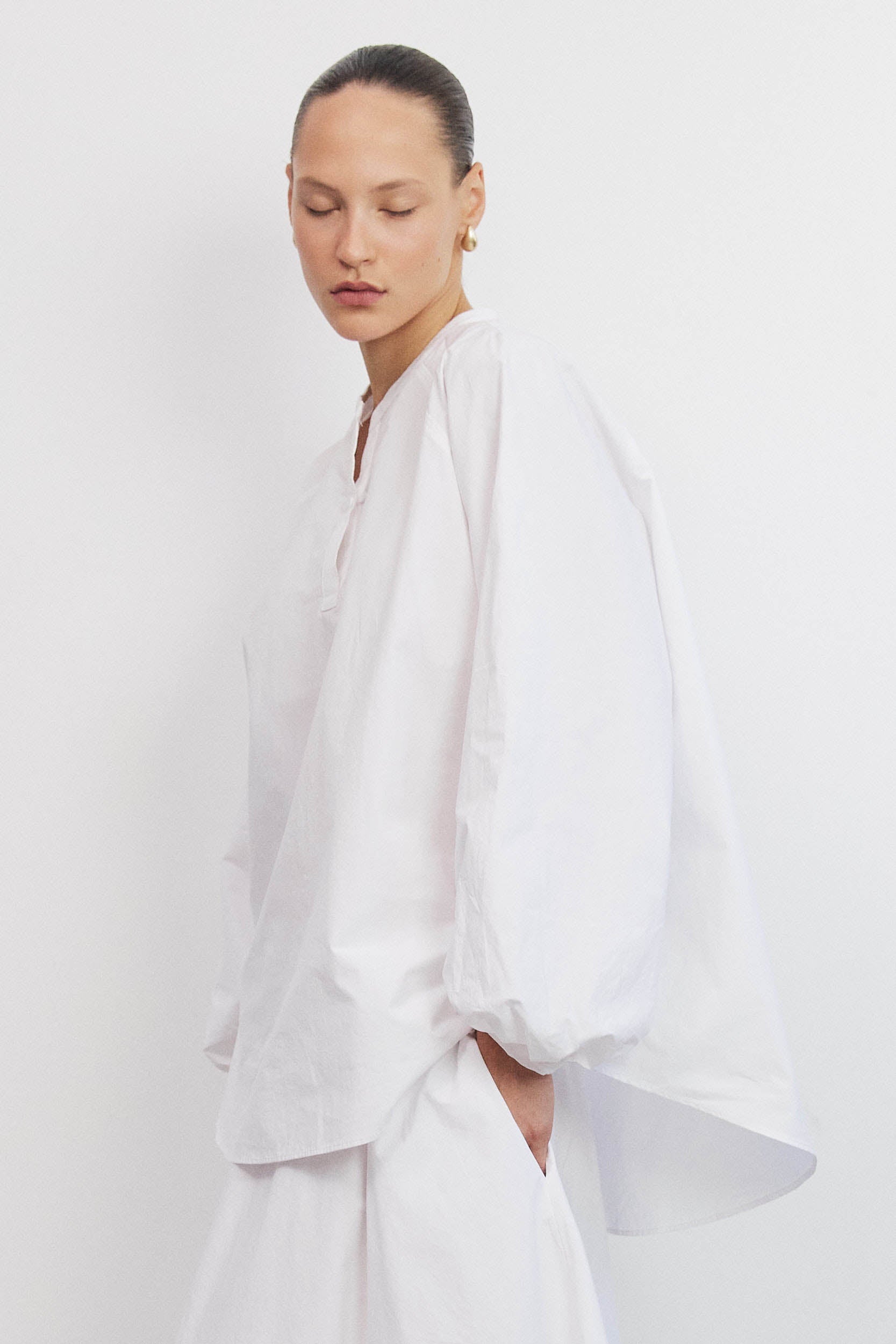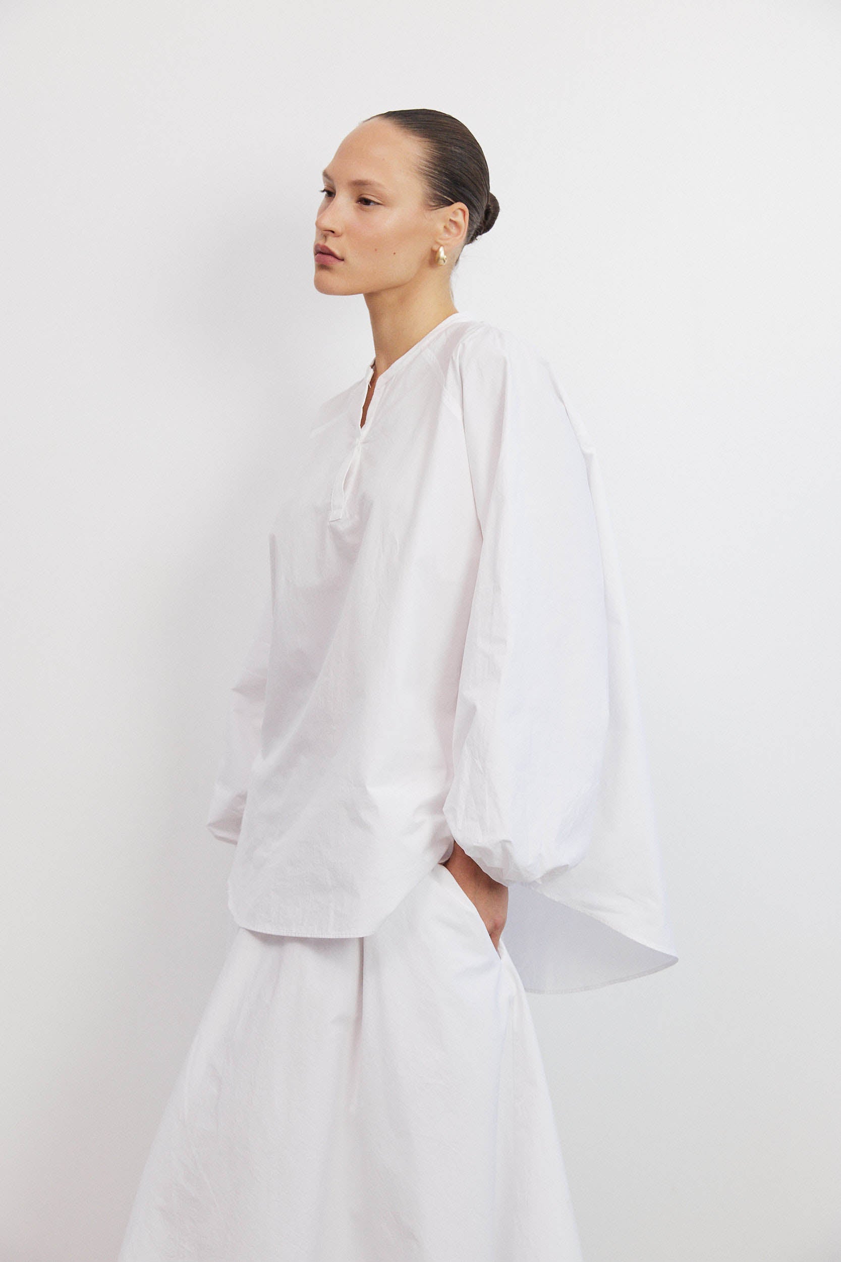 לחולצה שרוולים רחבים באורך מלא המעניקים מראה דרמטי והנפילה החופשית של הבד יוצרת תחושת פלואו ונפח.