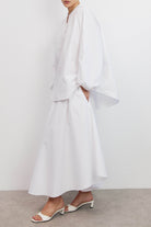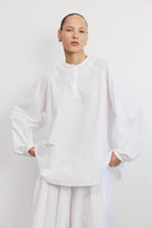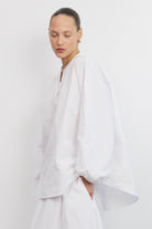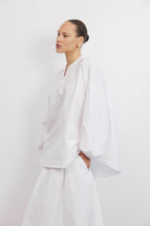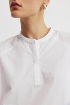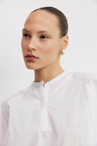 חולצת כותנה לבנה בגזרה רפויה ומודרנית עם מפתח צוואר סיני וכפתרה חלקית בחזית.