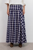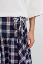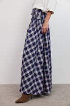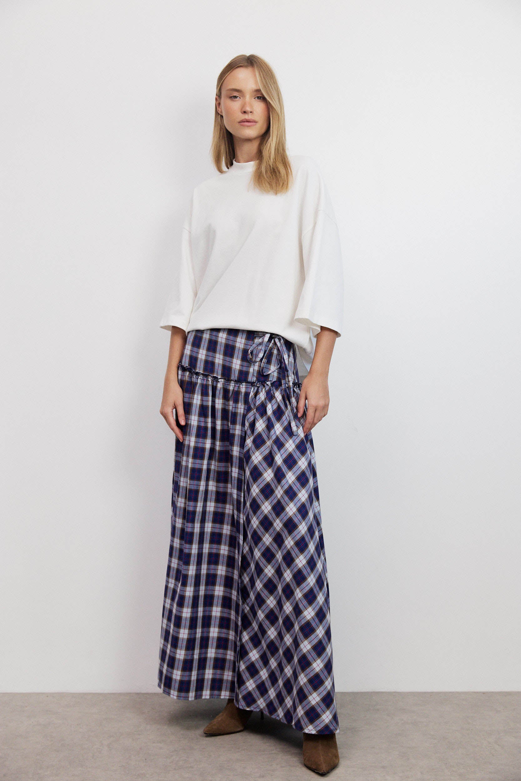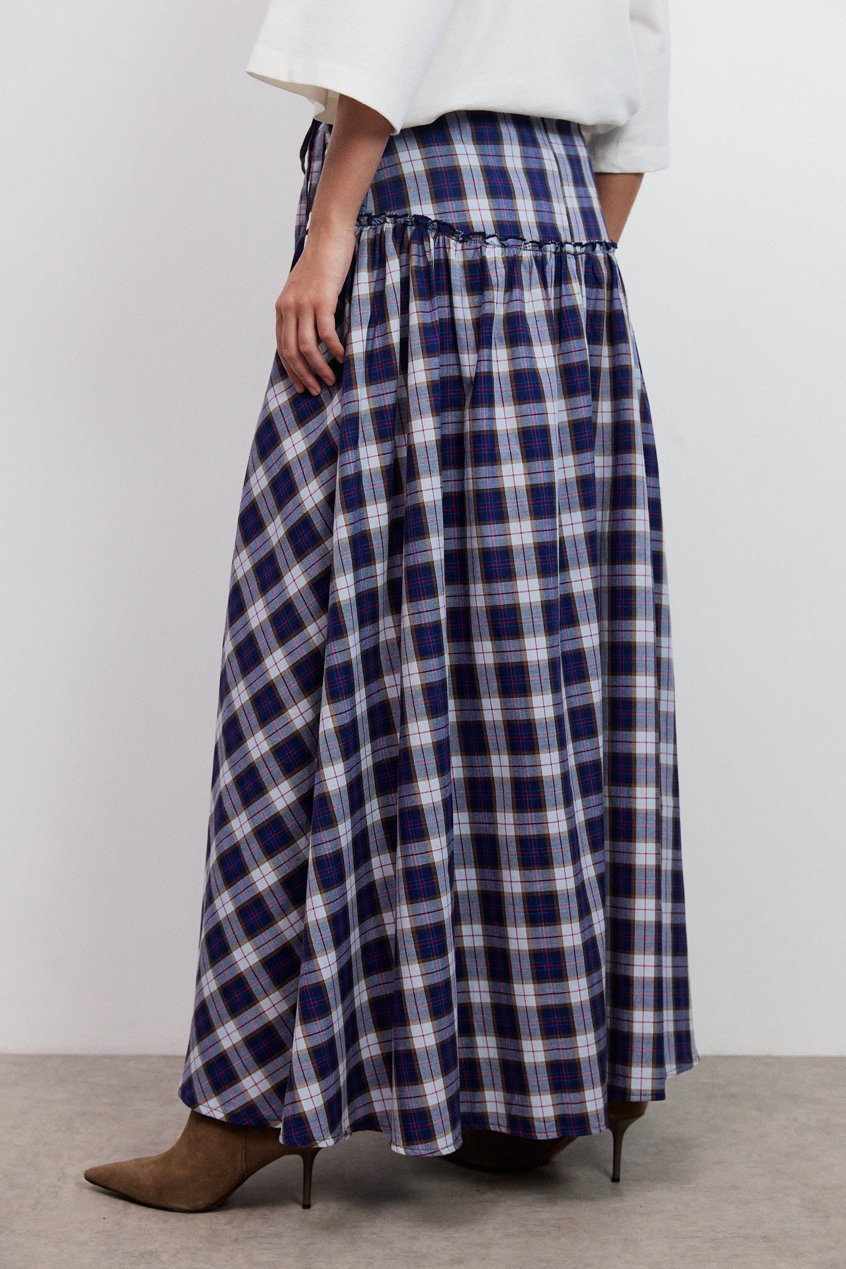 חצאית מקסי בגזרת מעטפת עם נפח רך ותנועה טבעית. החצאית עשויה בד משובץ בסגנון טארטן בגווני כחול ובורגנדי, שמעניקים לה קו קלאסי עם טוויסט מודרני.