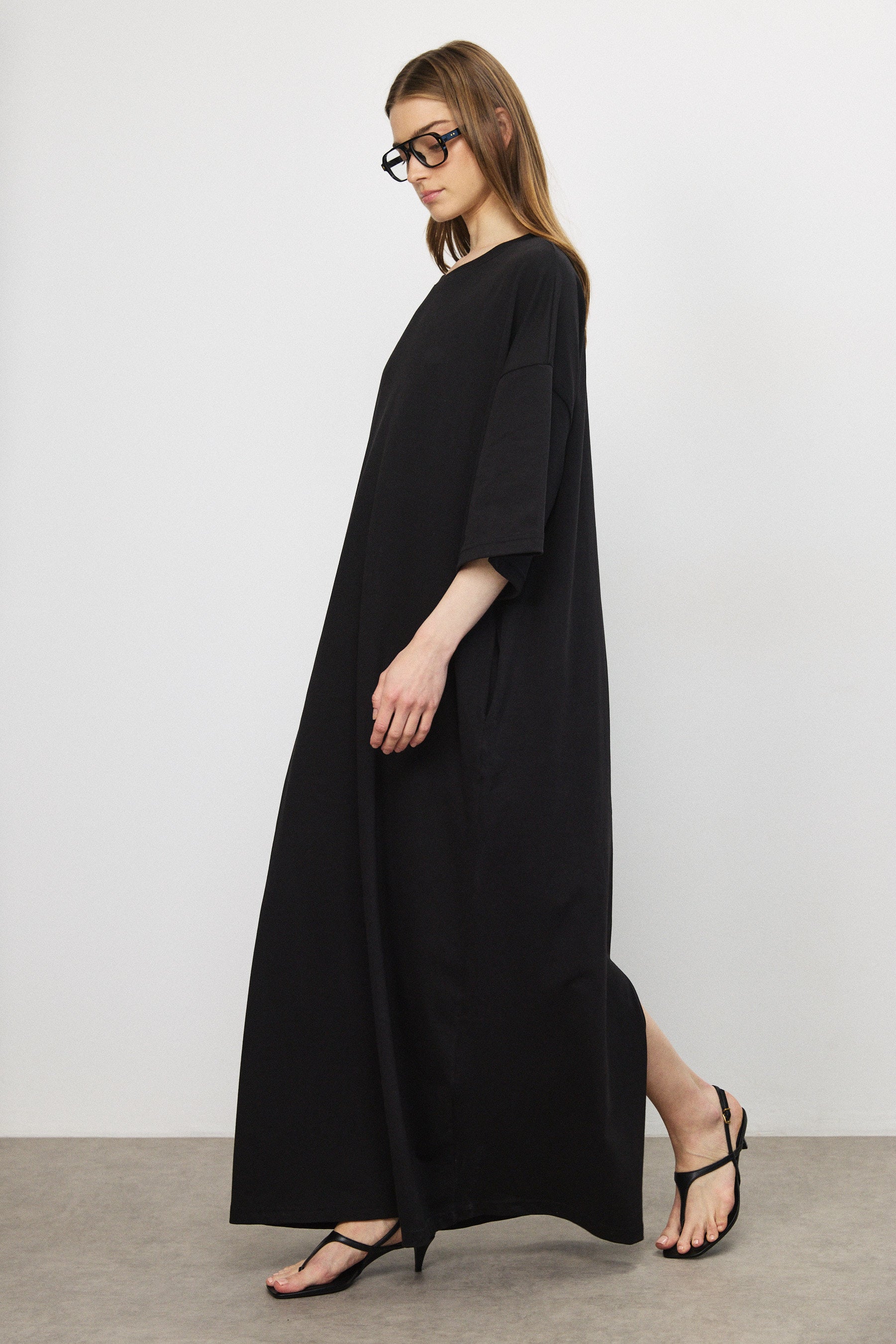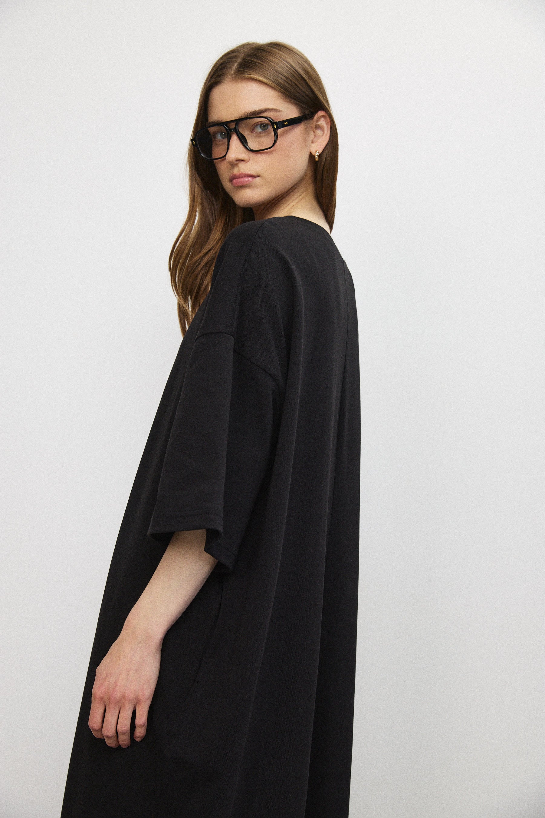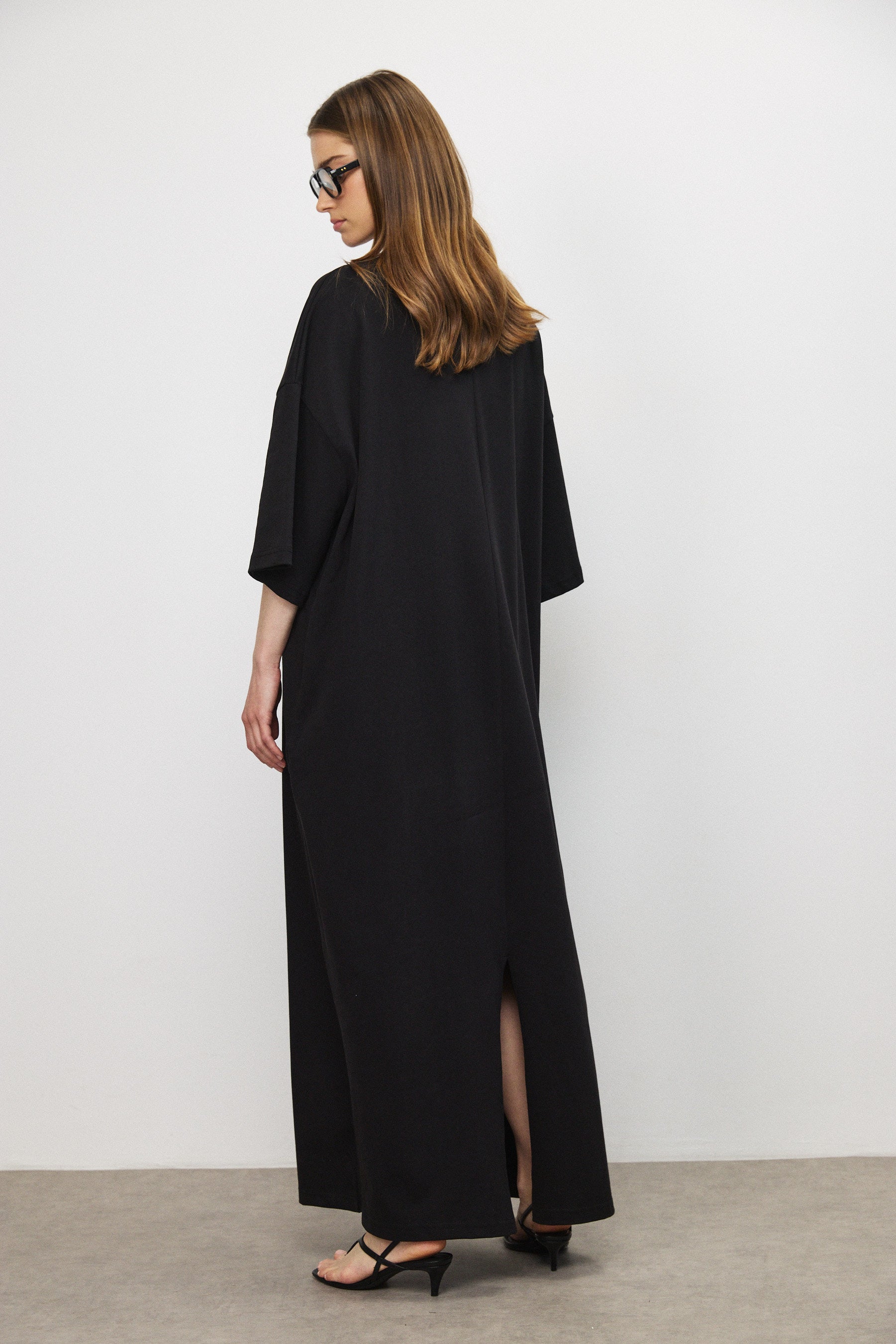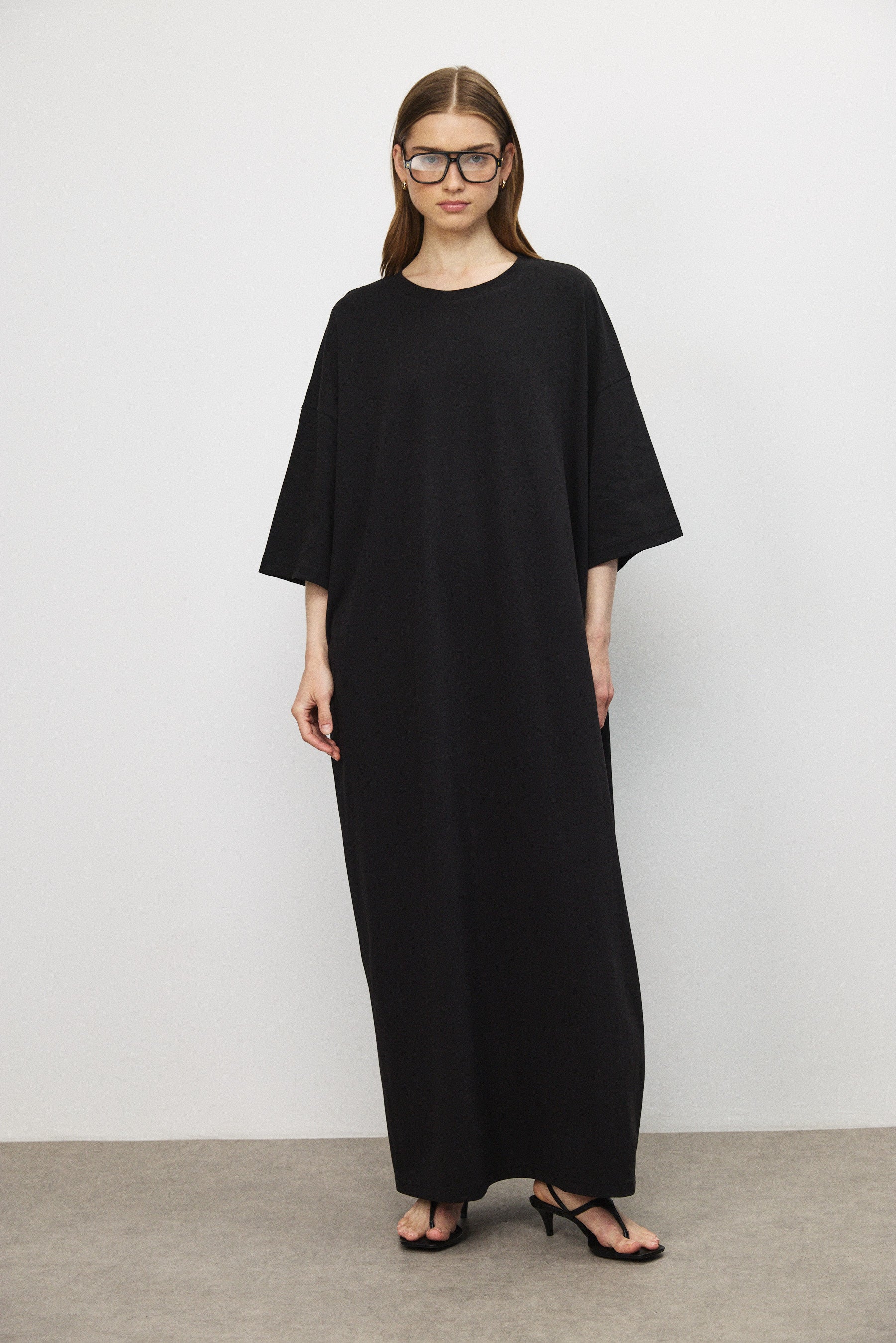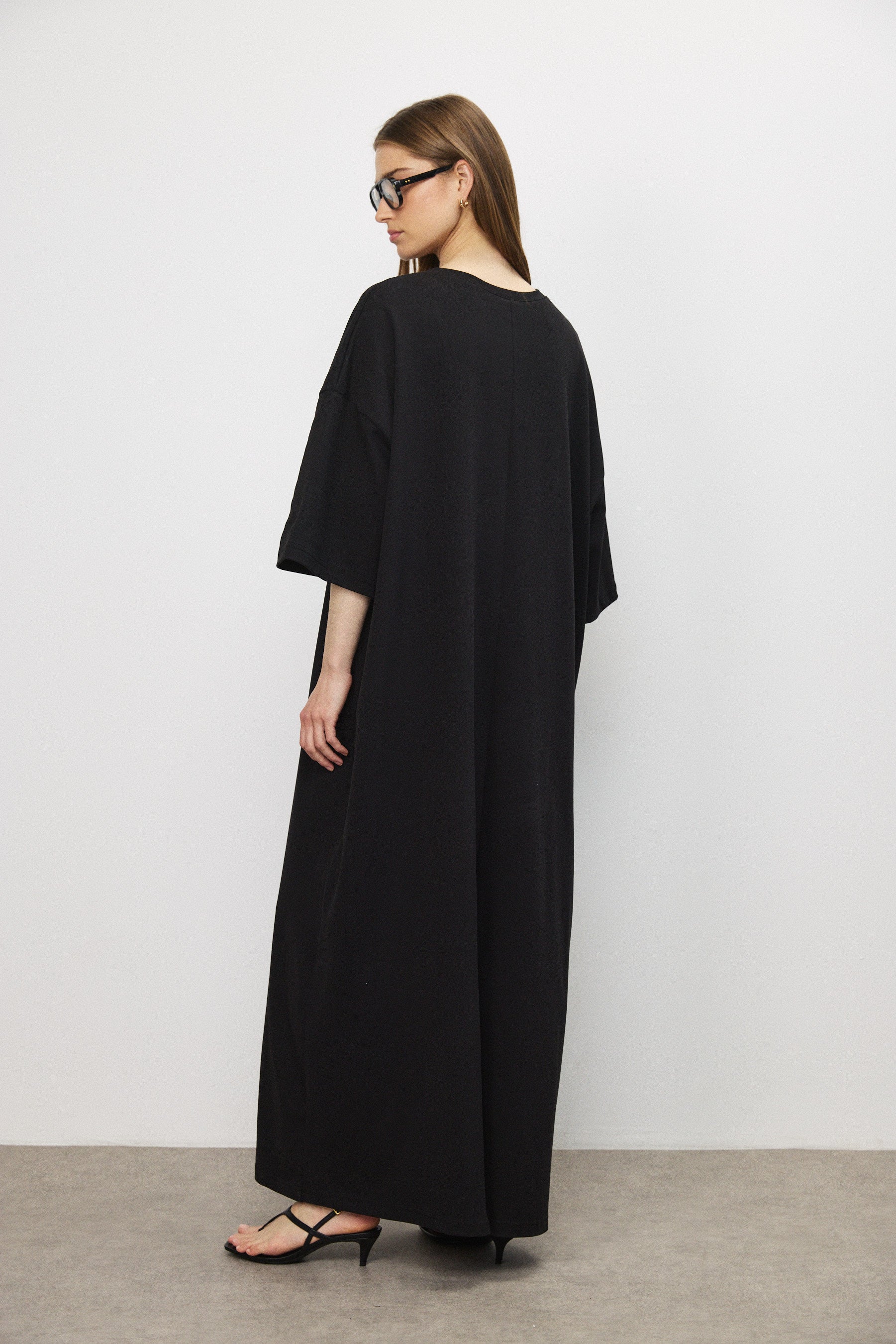 שמלת מקסי בגזרת אוברסייז בעיצוב נקי ומדויק, עשויה בד כותנה עשיר בעל נפילה רכה ותנועה עוטפת. קווים נקיים וקו כתפיים נמוך מעניקים לה נוכחות מודרנית ומאוזנת.