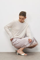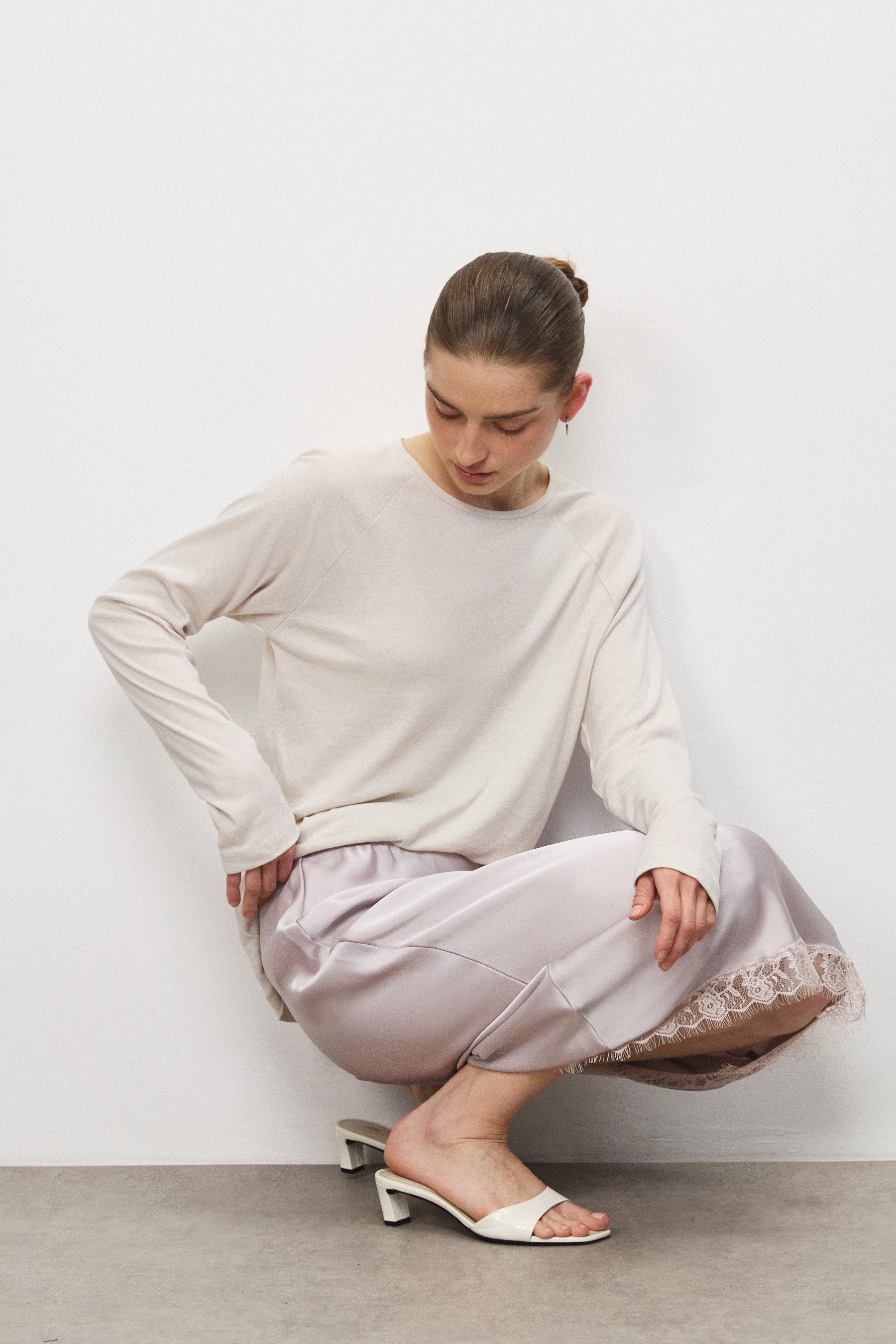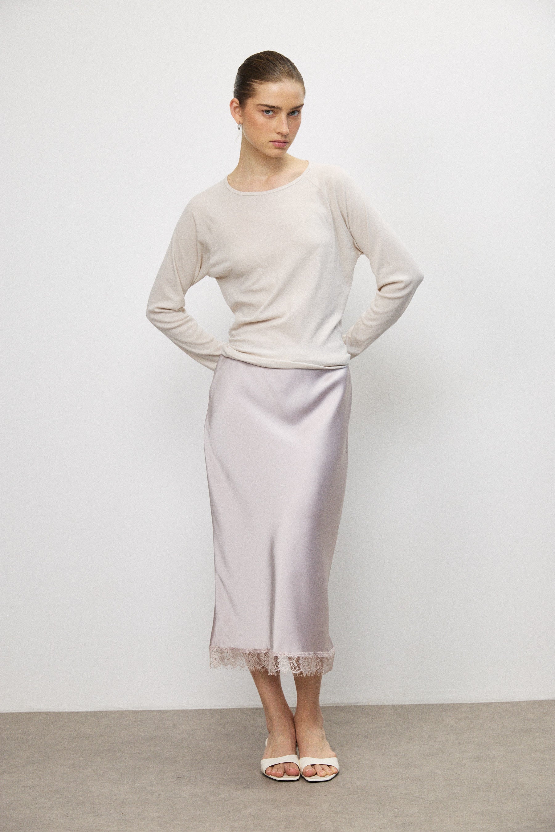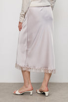חצאית מידי עשויה סאטן איכותי עם מראה חלק ונפילה טבעית. גימור תחרה בחלק התחתון מוסיף טאץ’ מעודן ומדויק. כוללת גומי עדין בקו המותן ללבישה נוחה ולישיבה מאוזנת על הגוף.