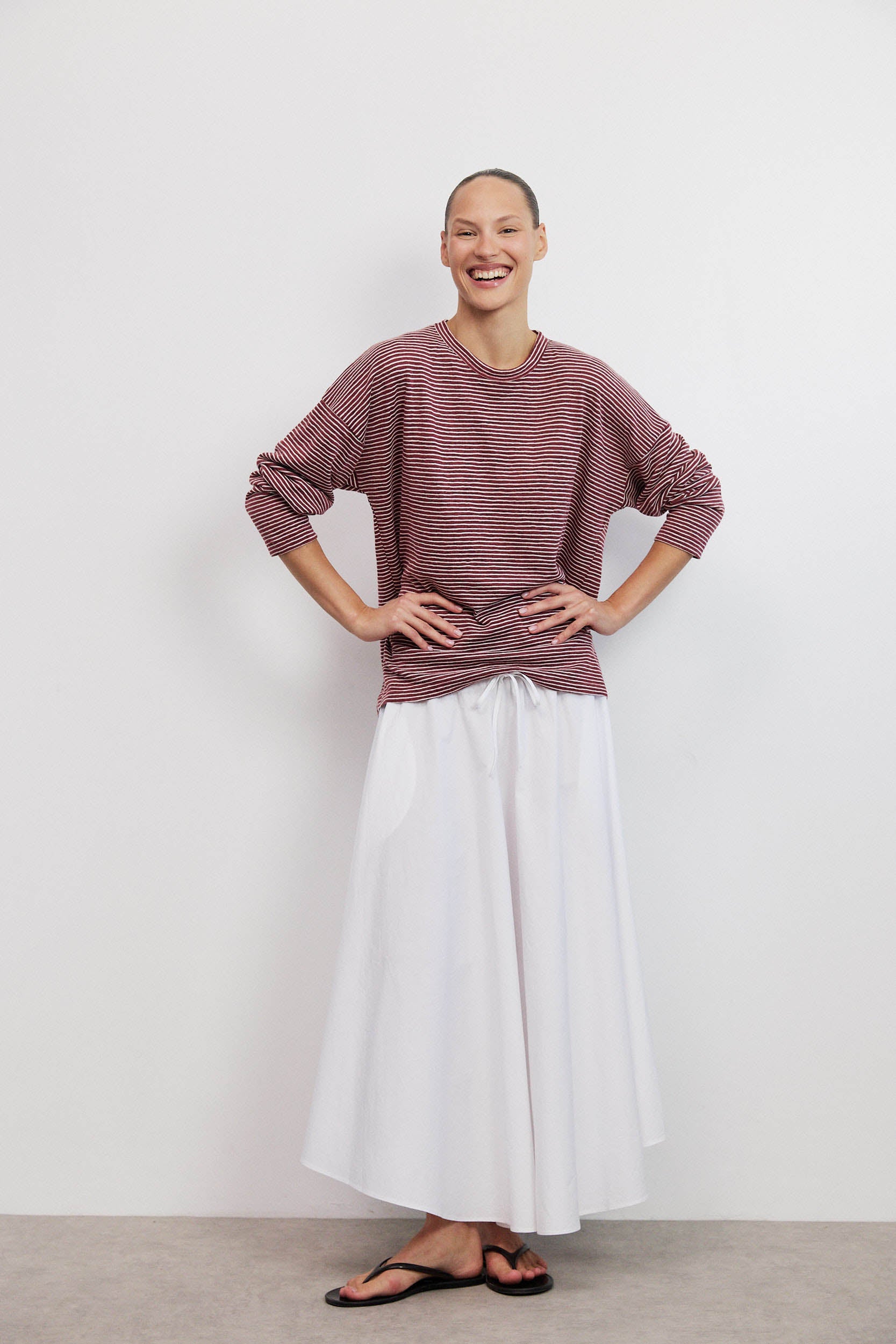 הפסים העדינים בגווני בורדו ואוף ווייט יוצרים מראה קלאסי עם טוויסט מודרני.
