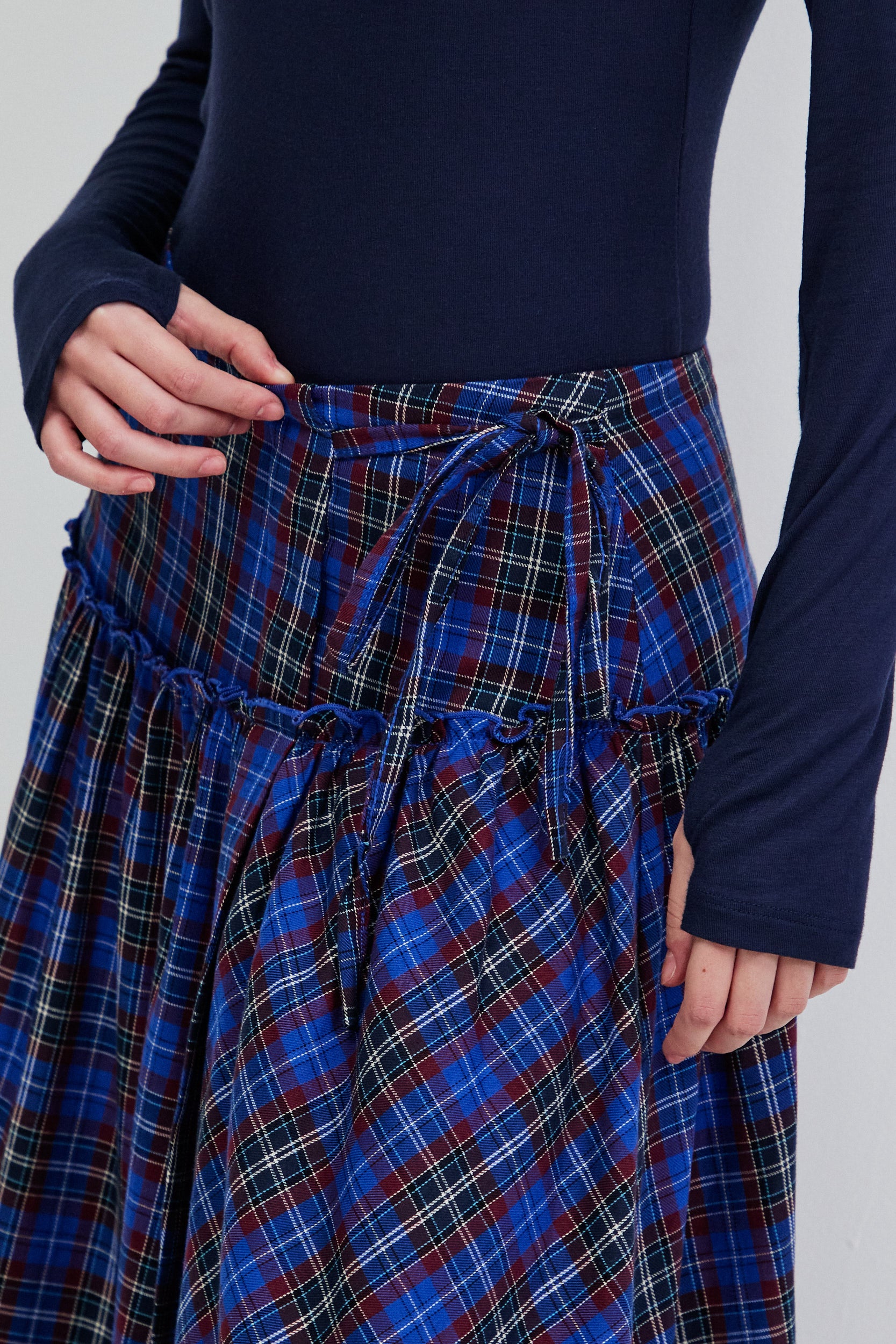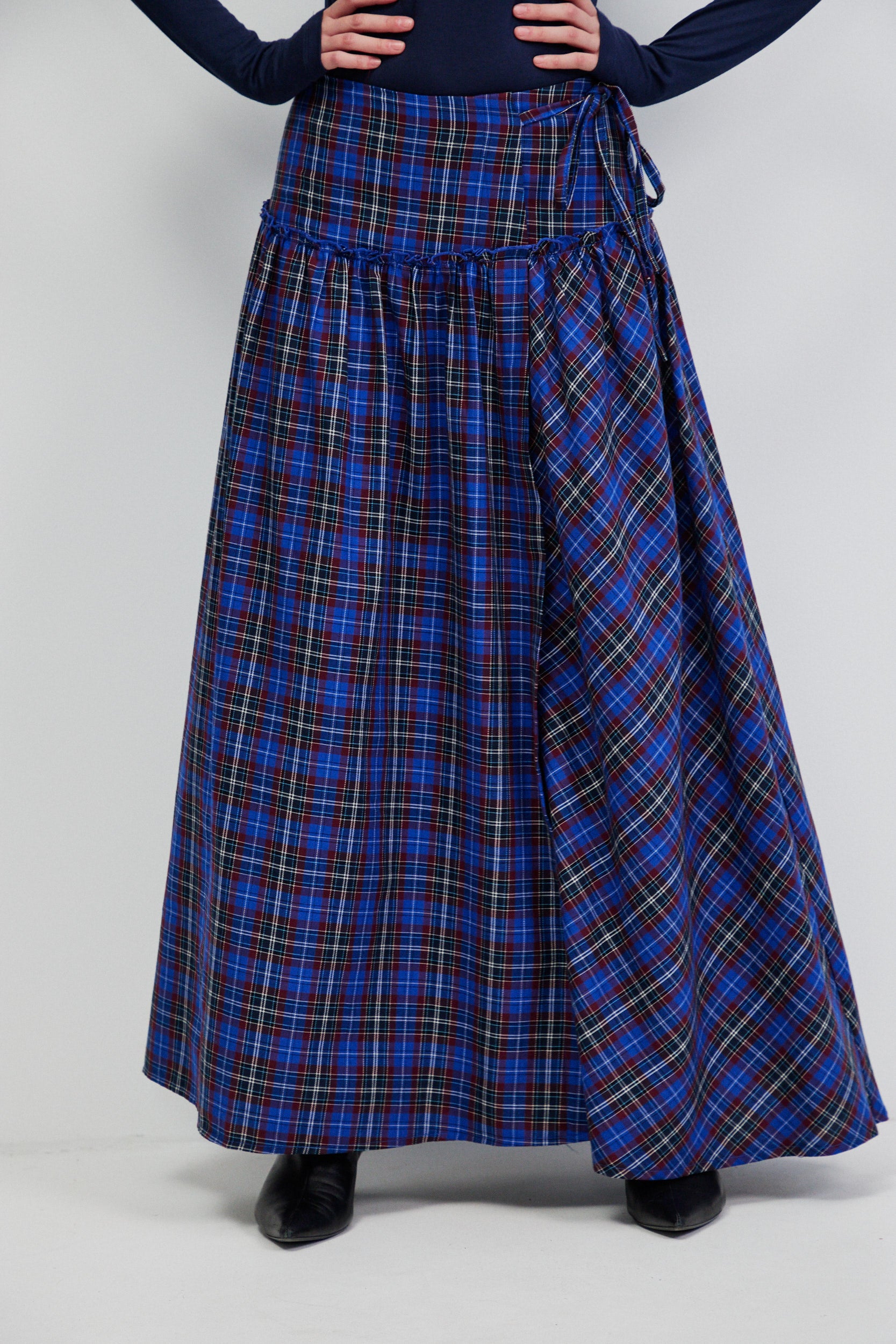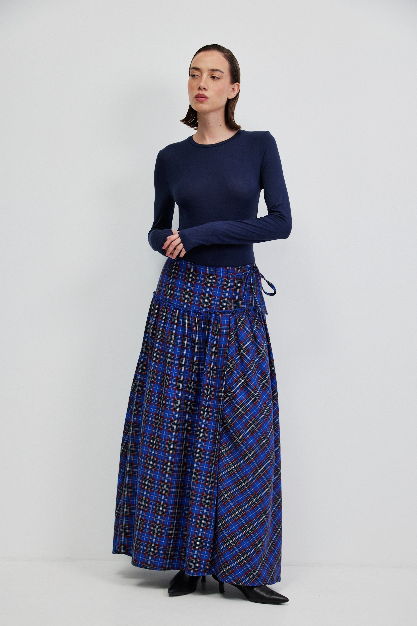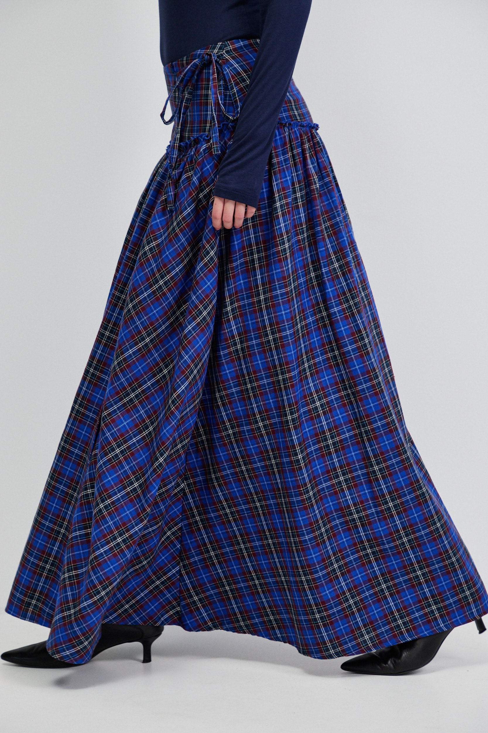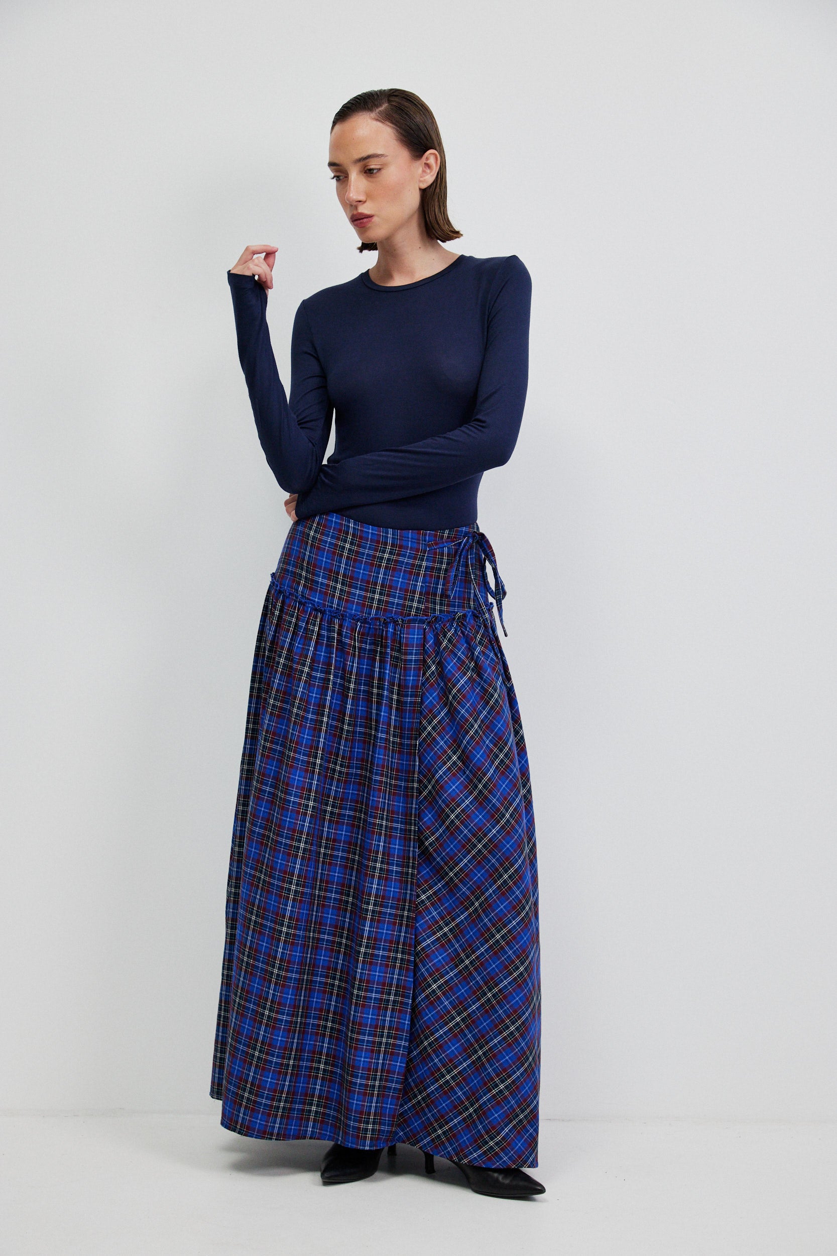 חצאית מקסי בגזרת מעטפת עם נפח רך ותנועה טבעית. החצאית עשויה בד משובץ בסגנון טארטן בגווני כחול רויאל ובורגנדי, שמעניקים לה קו קלאסי עם טוויסט מודרני.