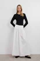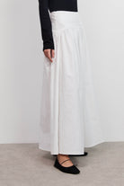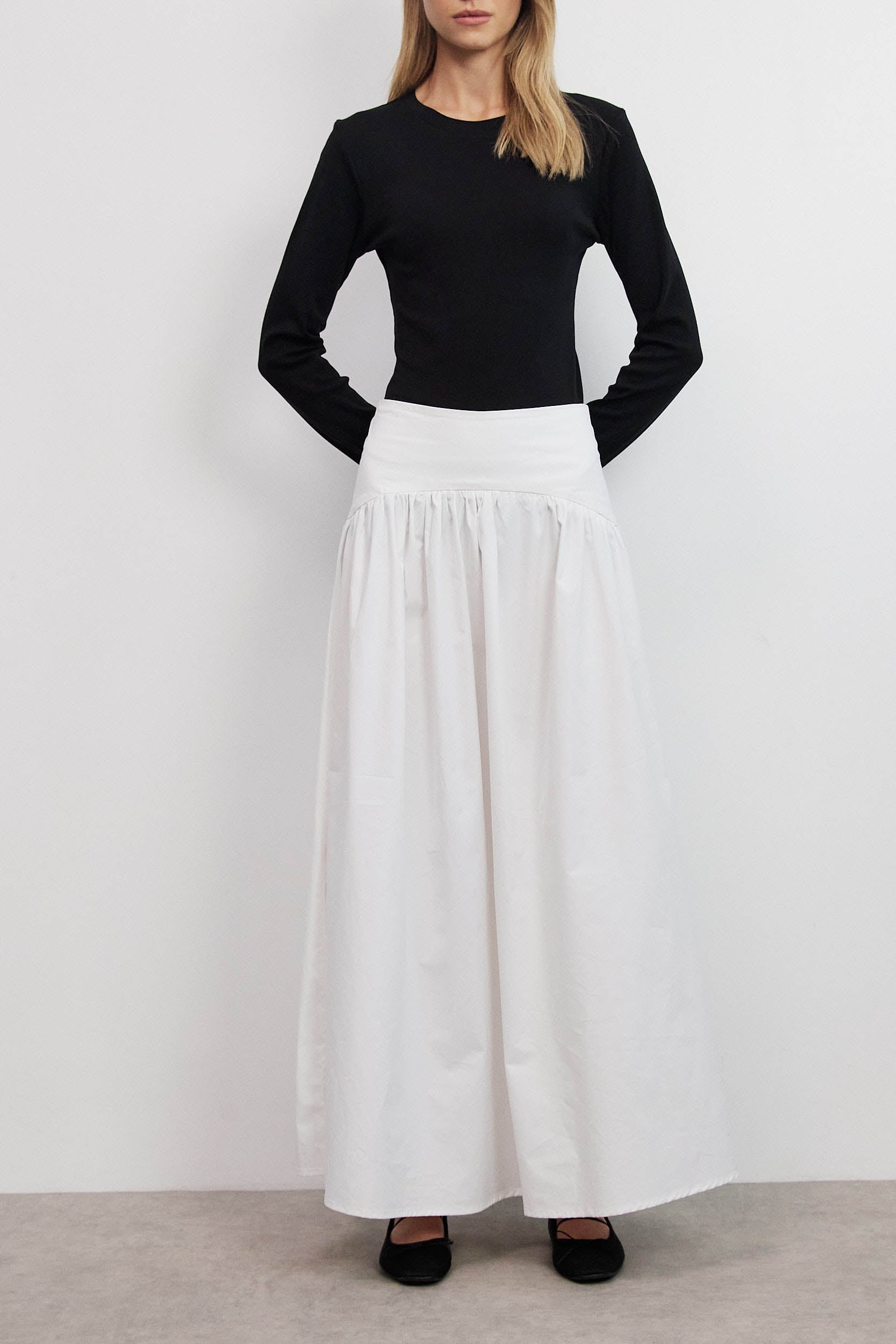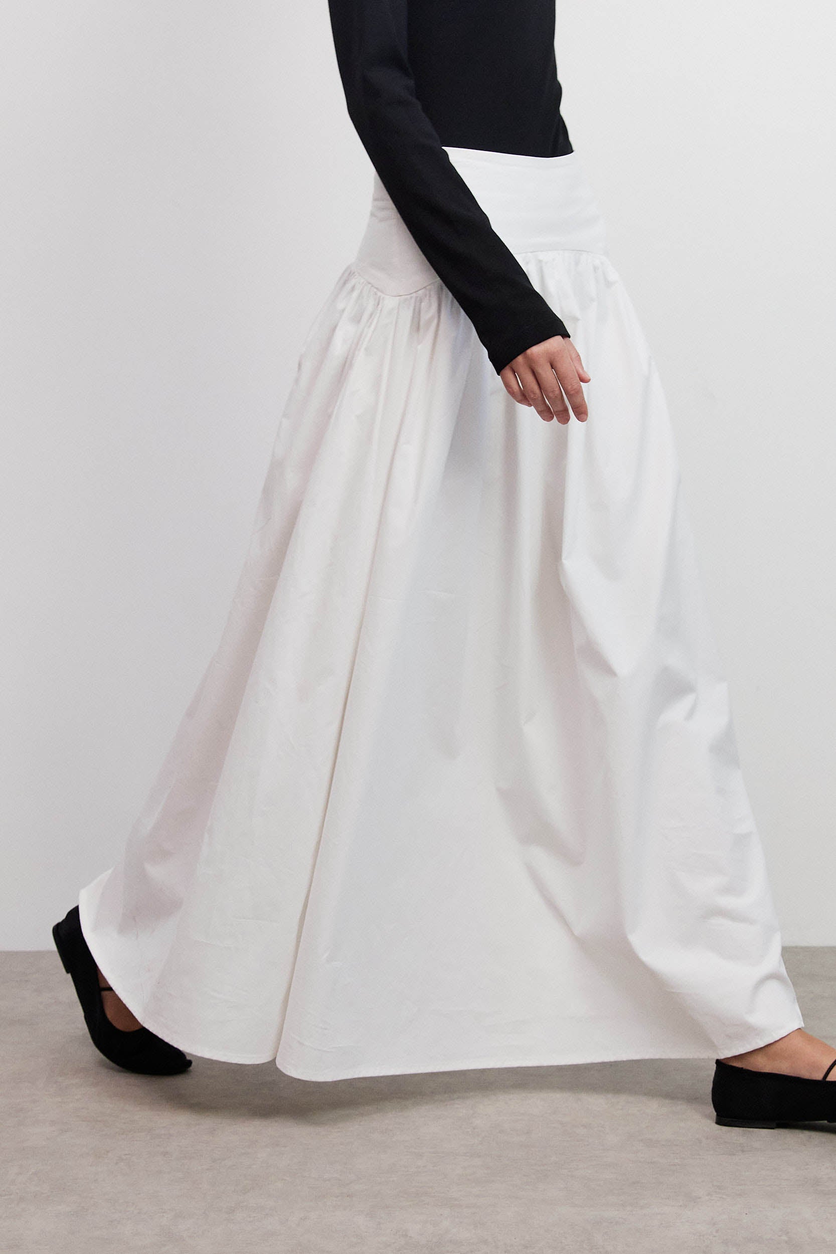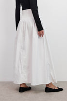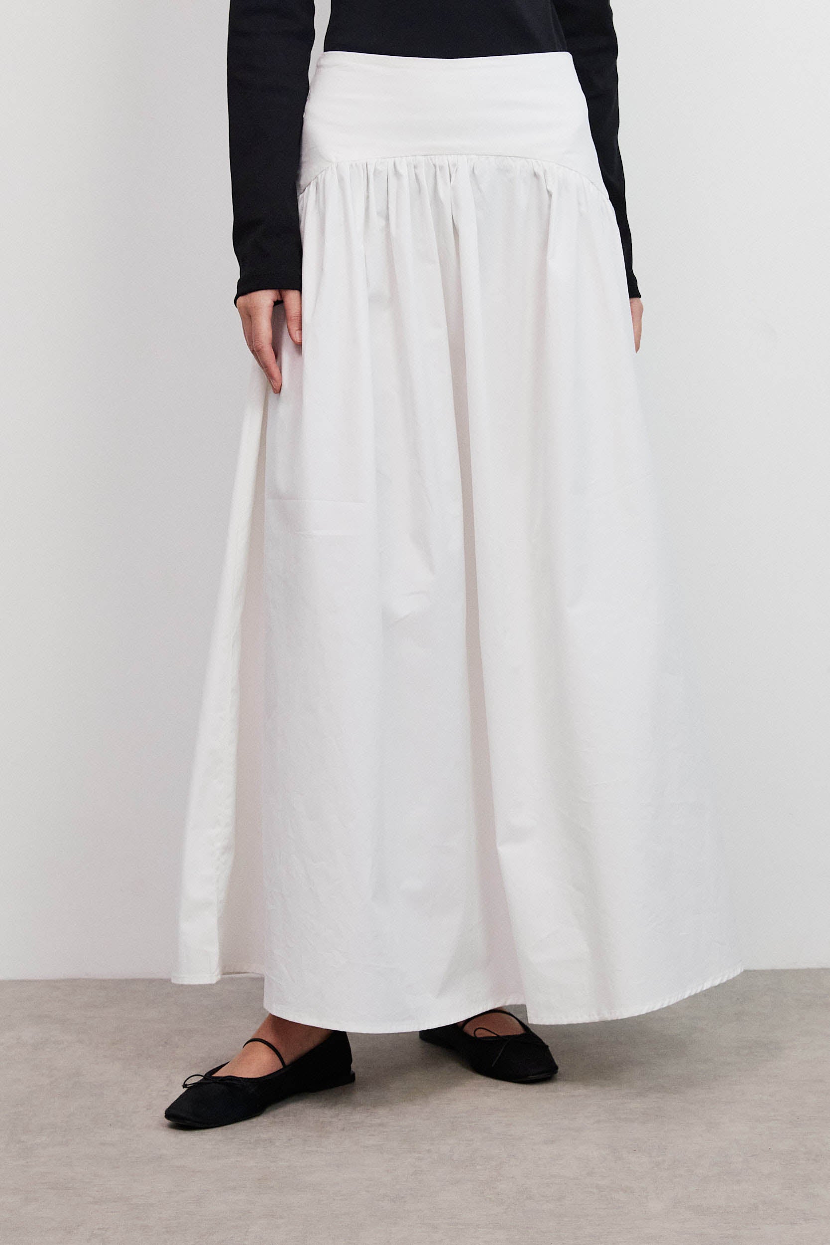 חצאית מקסי לבנה באורך מלא, המעוצבת בקווים נקיים עם נגיעת רומנטיקה מודרנית. החלק העליון יושב בצורה מחמיאה על המותן, וממנו נפתח נפח עשיר של קפלים רכים היוצרים תנועה טבעית ואלגנטית.