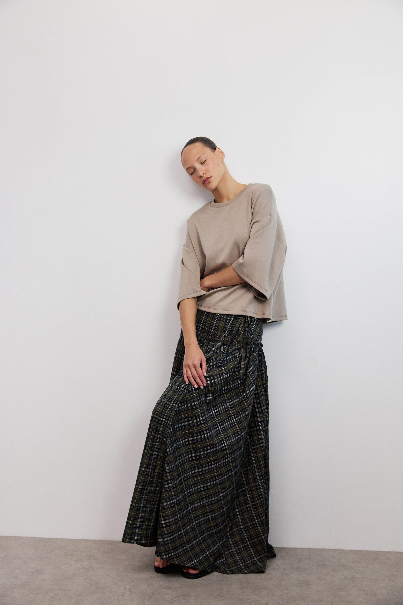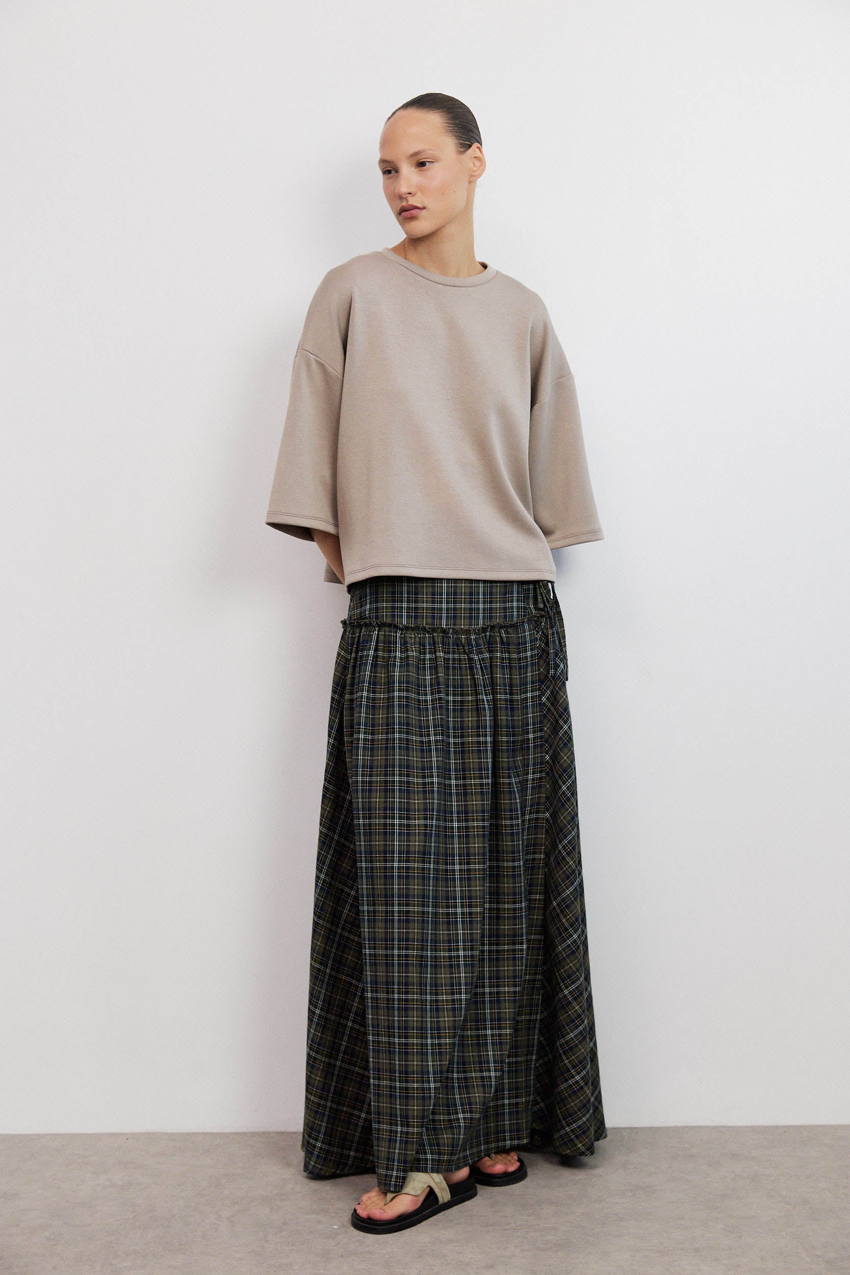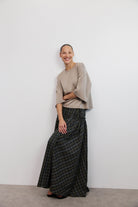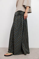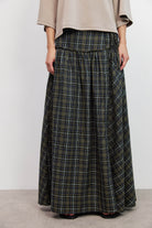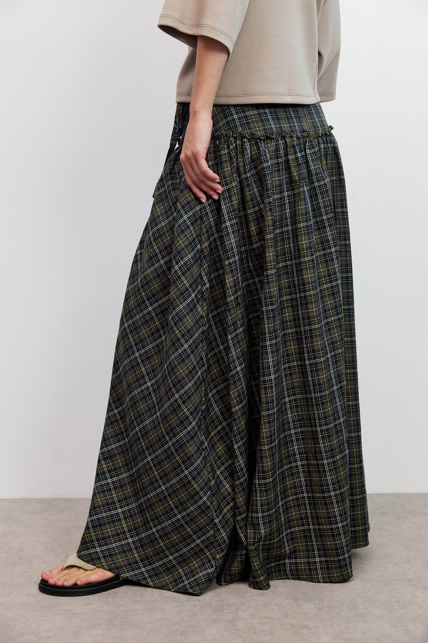 חצאית מקסי בגזרת מעטפת עם נפח רך ותנועה טבעית. החצאית עשויה בד משובץ בסגנון טארטן בגווני זית וכחול, שמעניקים לה קו קלאסי עם טוויסט מודרני.