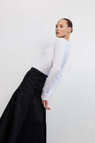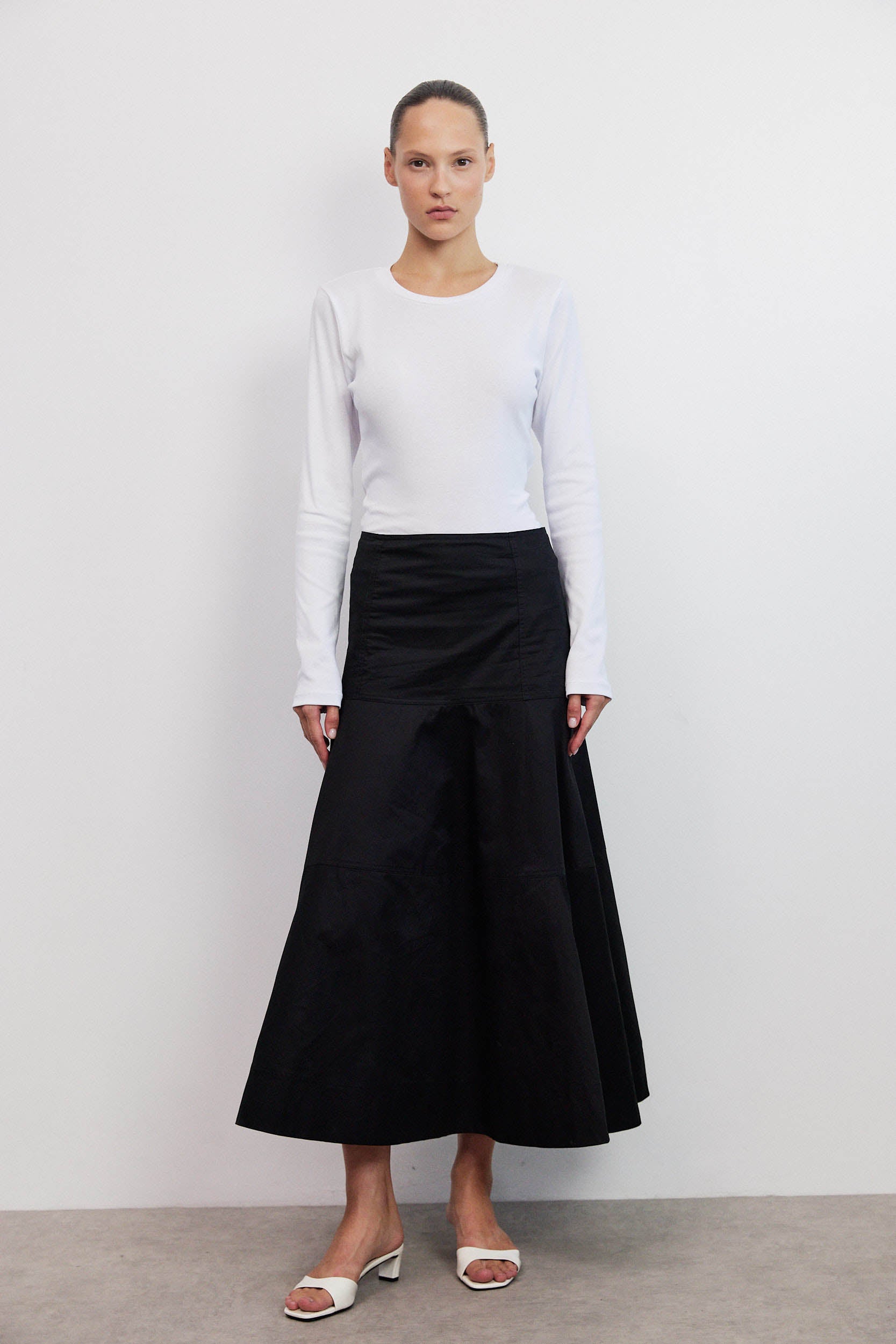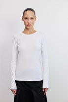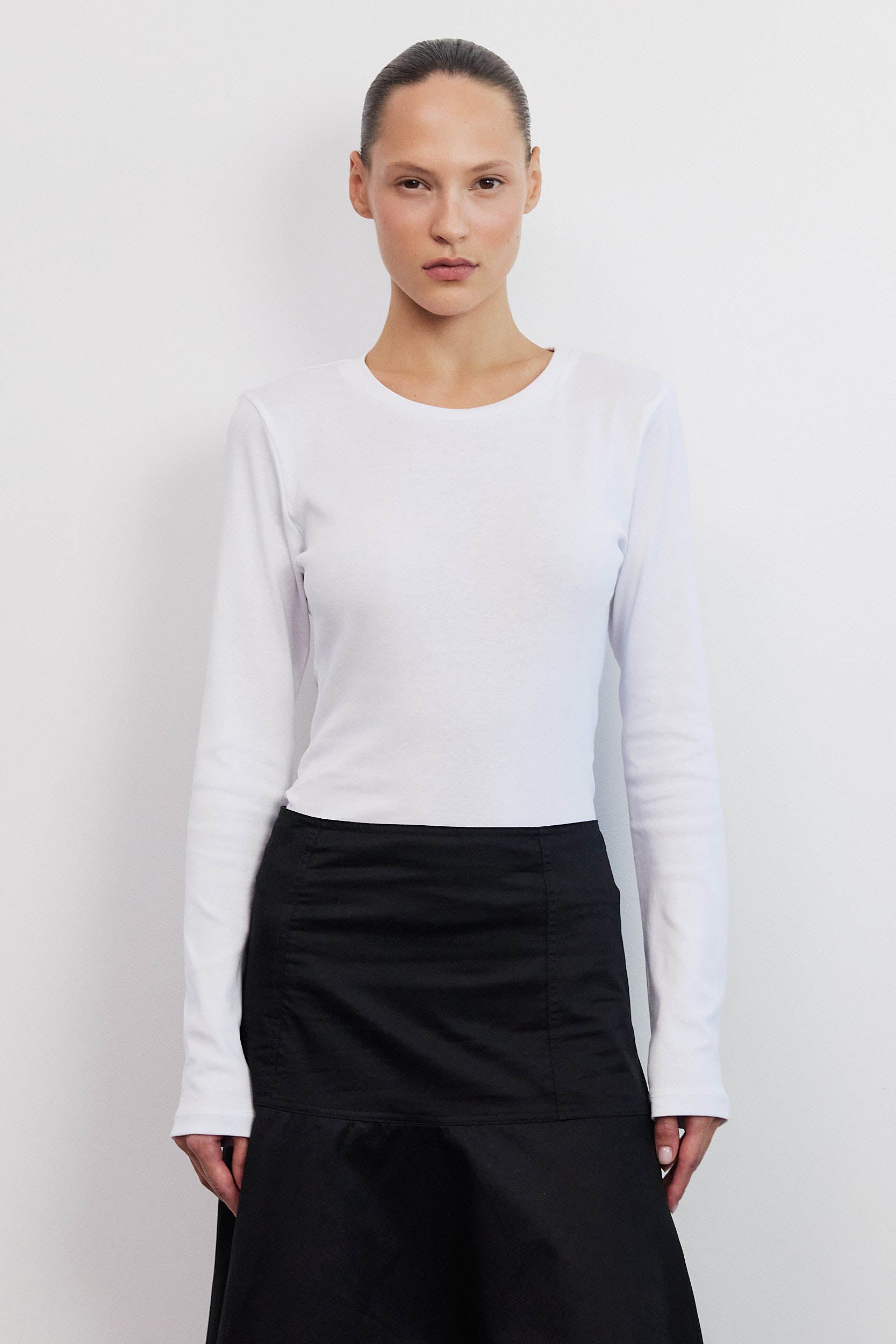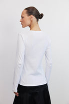 חולצת בייסיק על־זמנית בצבע לבן קלאסי,החולצה עשויה מבד כותנה רכה ואיכותית המקנה לה קו מחמיא ונוח, ובעלת צווארון עגול קלאסי ושרוולים ארוכים המעניקים לכל הלוק מראה נקי ומעודן.