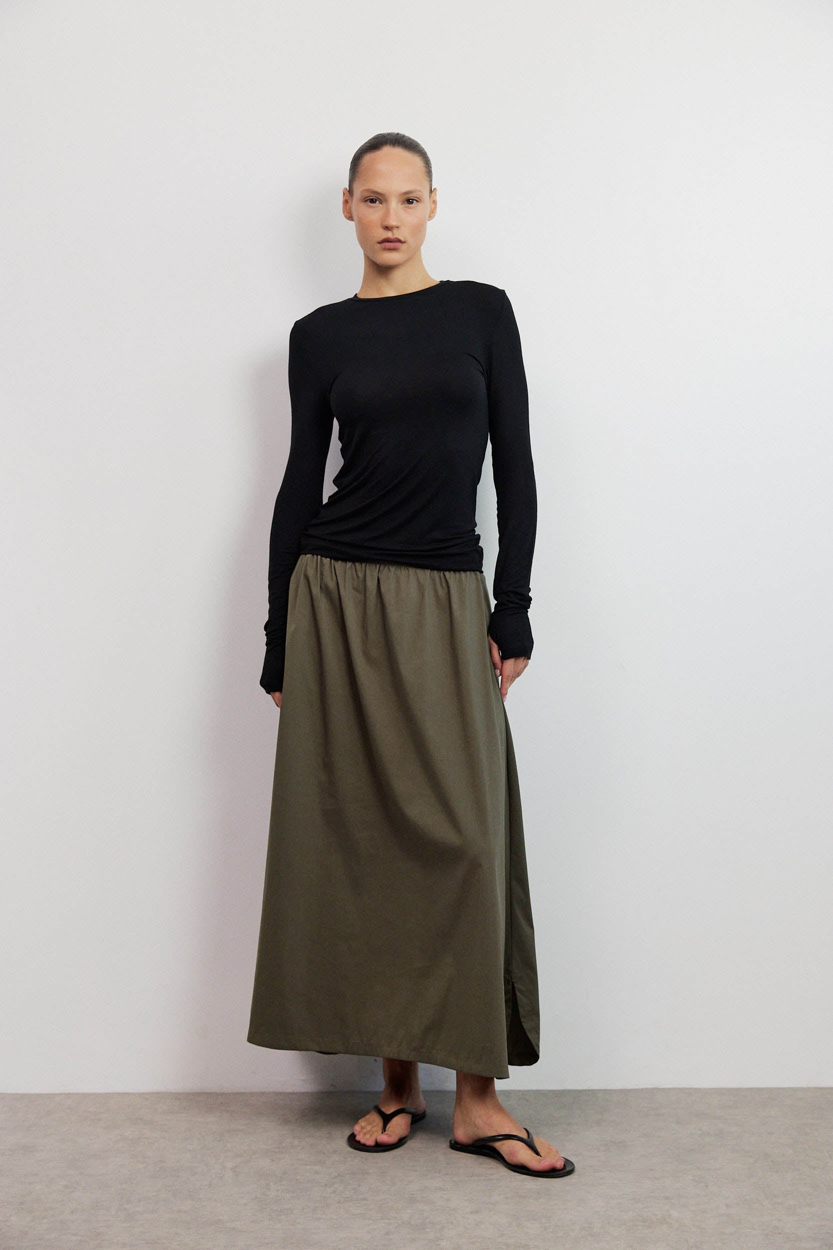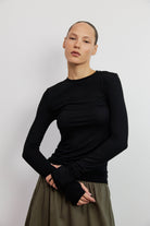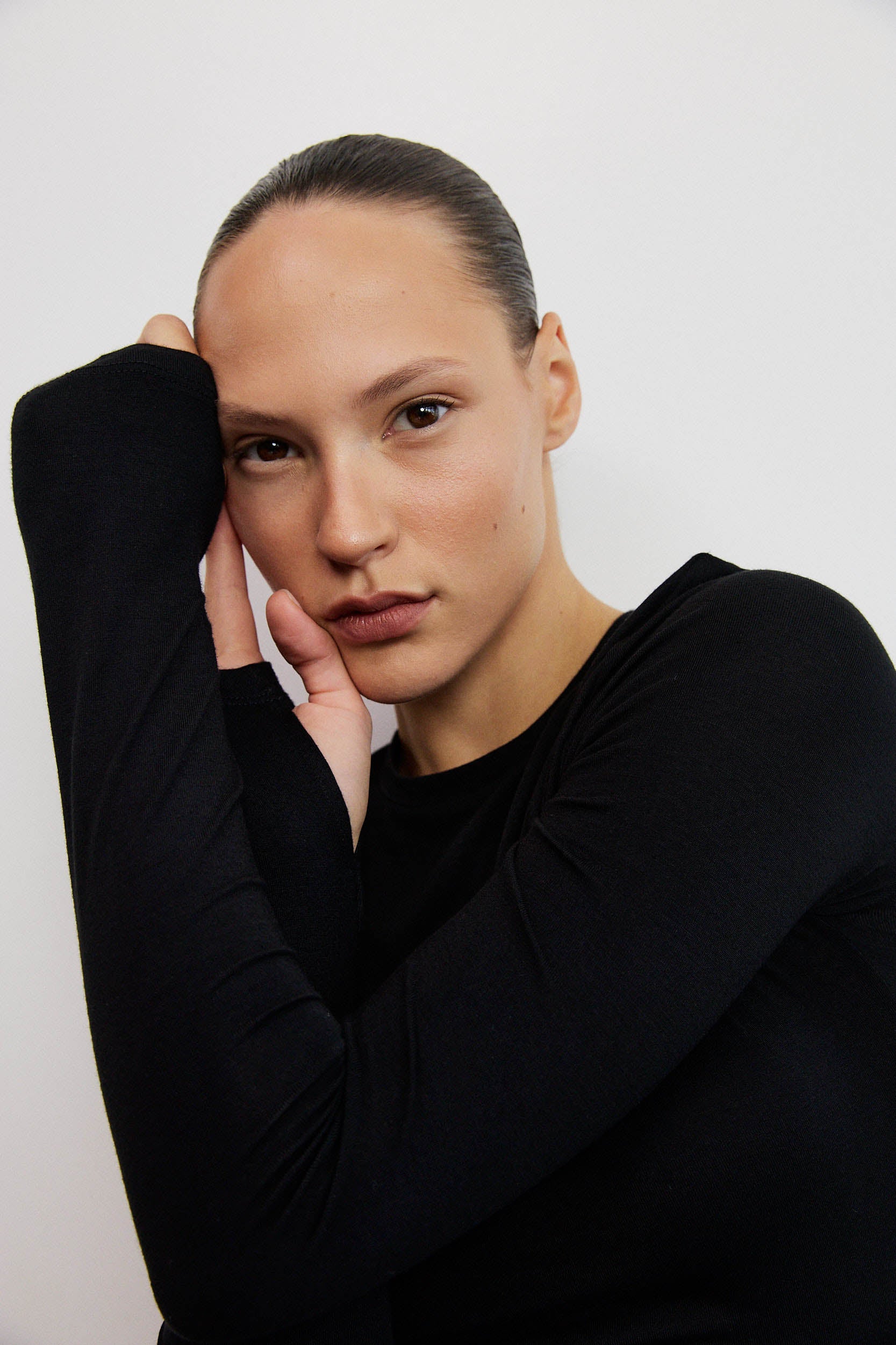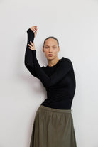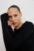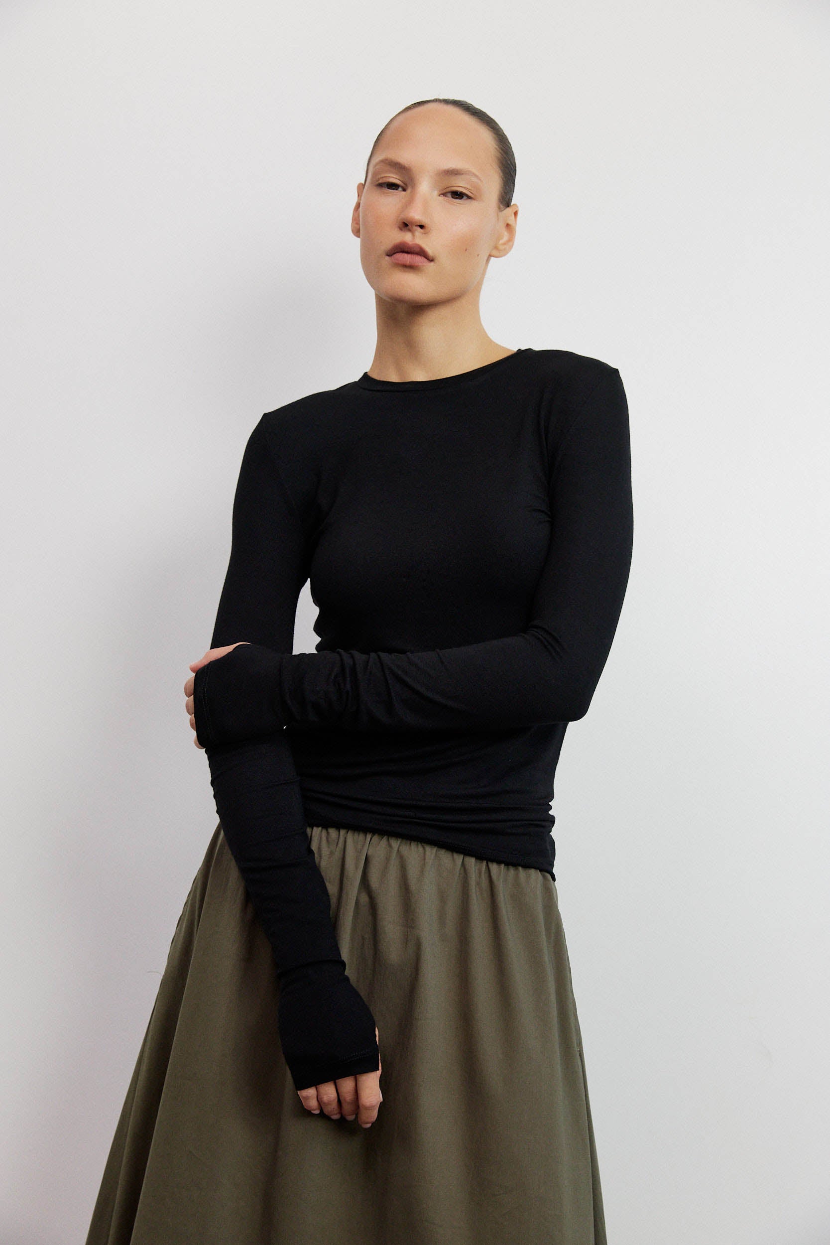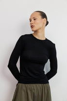 חולצה קלאסית בגזרת סלים מינימליסטית, עשויה מבד קליל ונעים למגע. לחולצה מפתח צוואר עגול ומחמיא, שרוולים ארוכים צמודים קלות, ליצירת מראה מוקפד ומעודן בסיומת כפפה.
