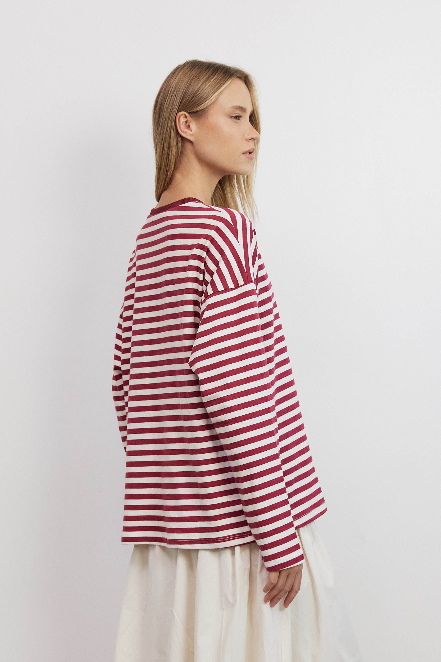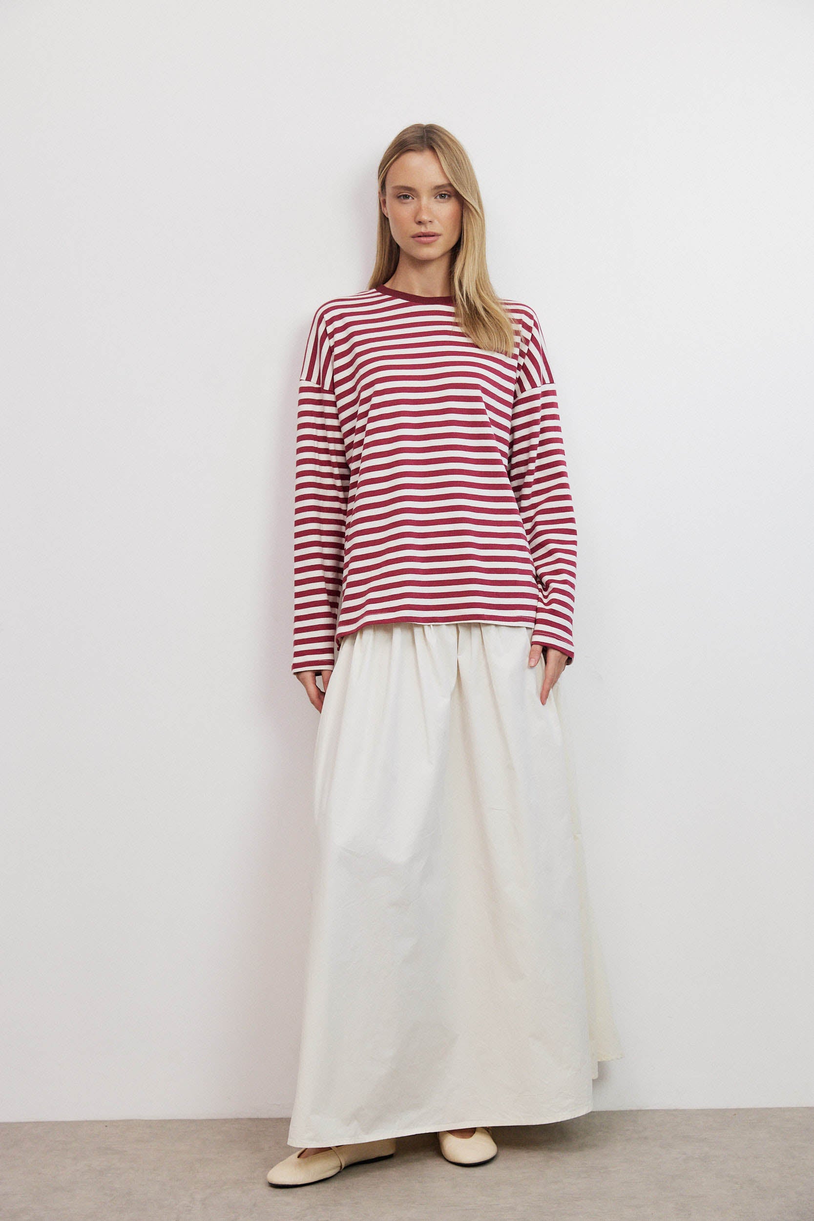 חולצת פסים קלאסית ארוכה, בגזרה רפויה וישרה עם נפילה חופשית, בעלת מפתח צוואר עגול, תפרי כתף עדינים ושרוולים מלאים, מה שמעניק לה קו מודרני ושימושי.