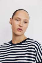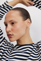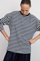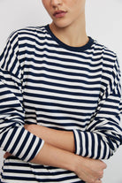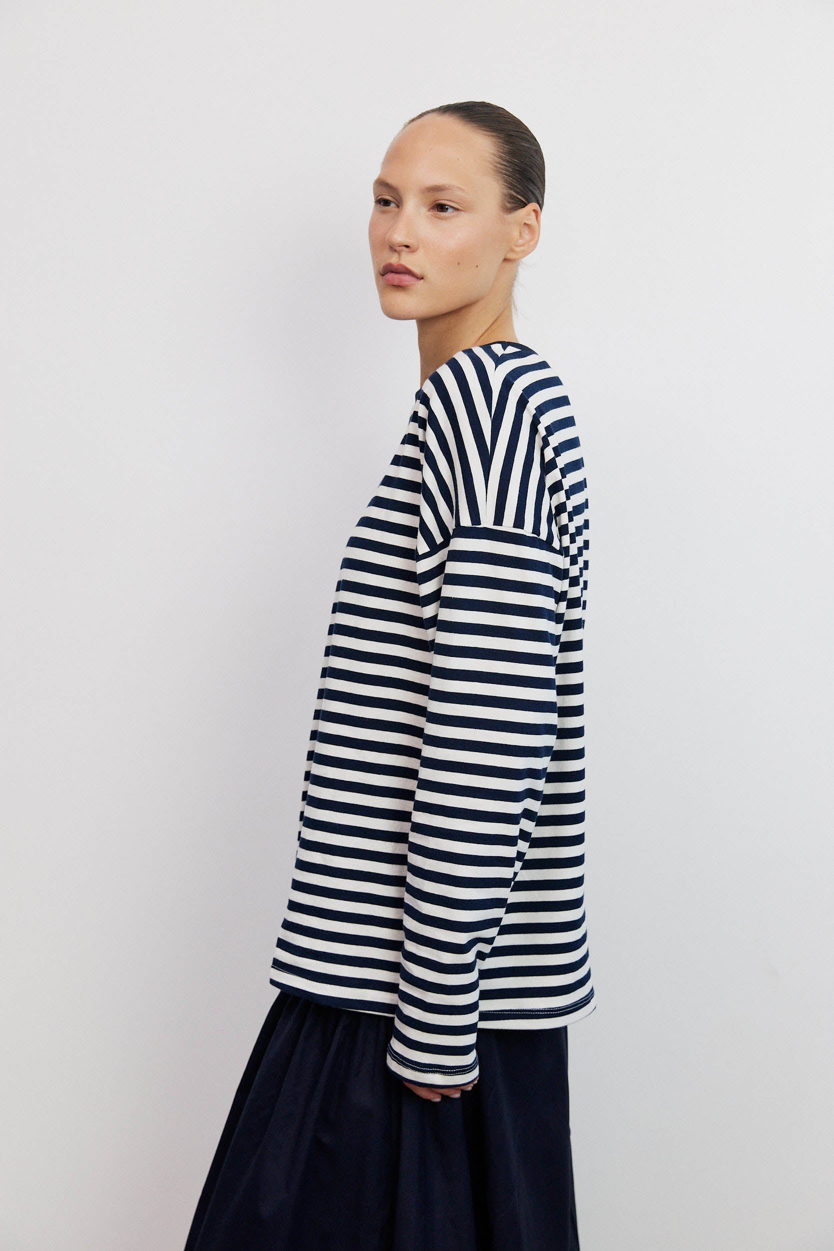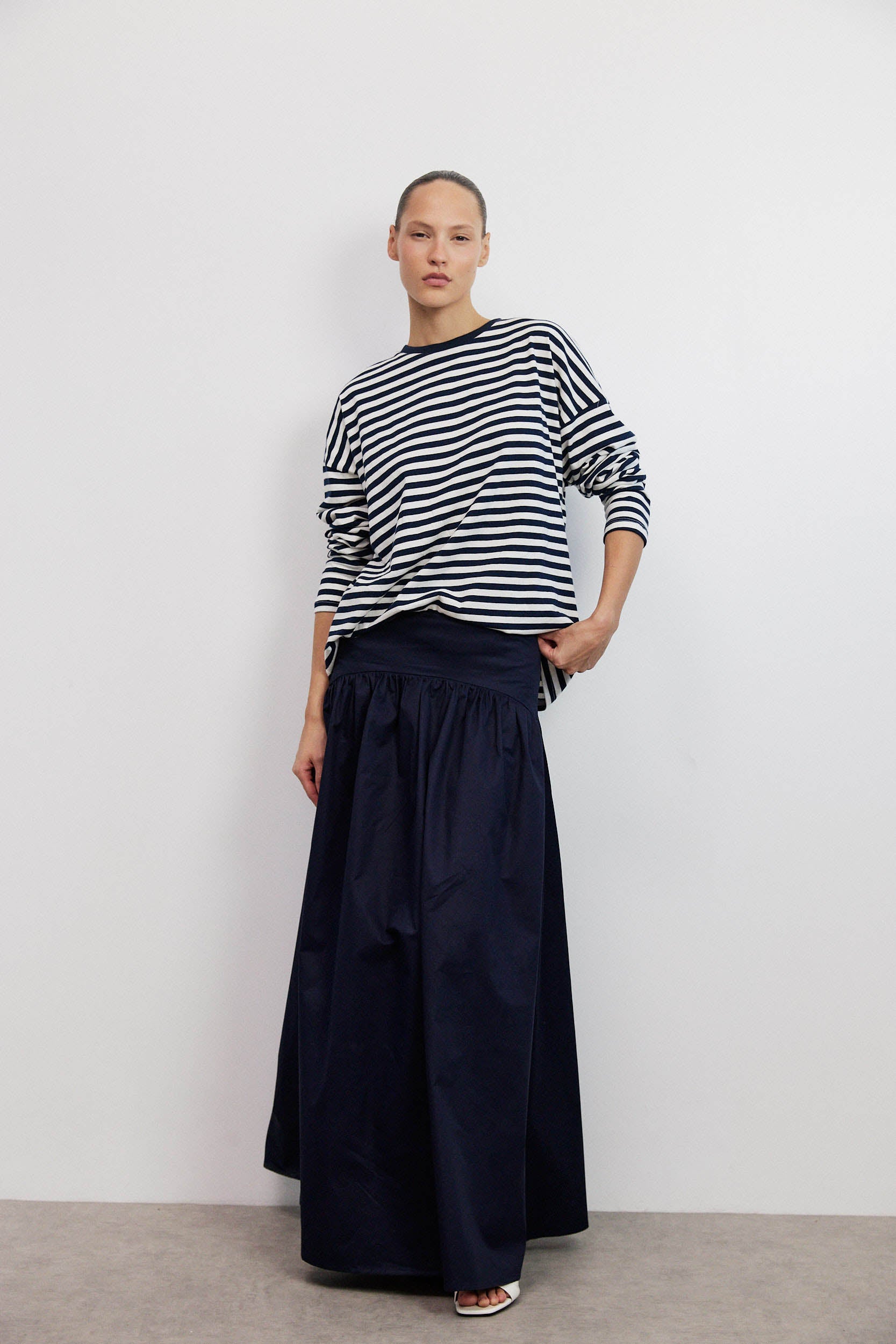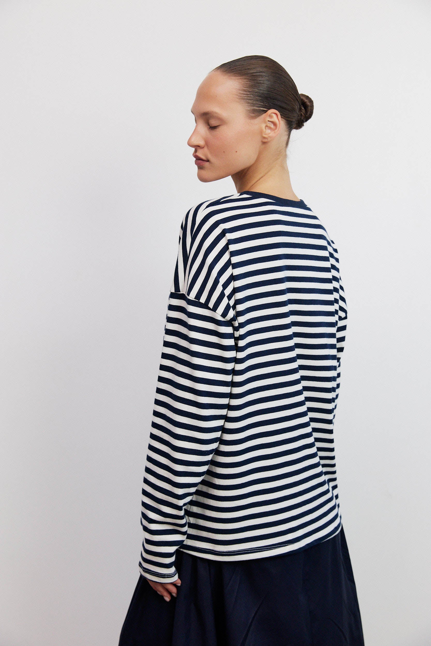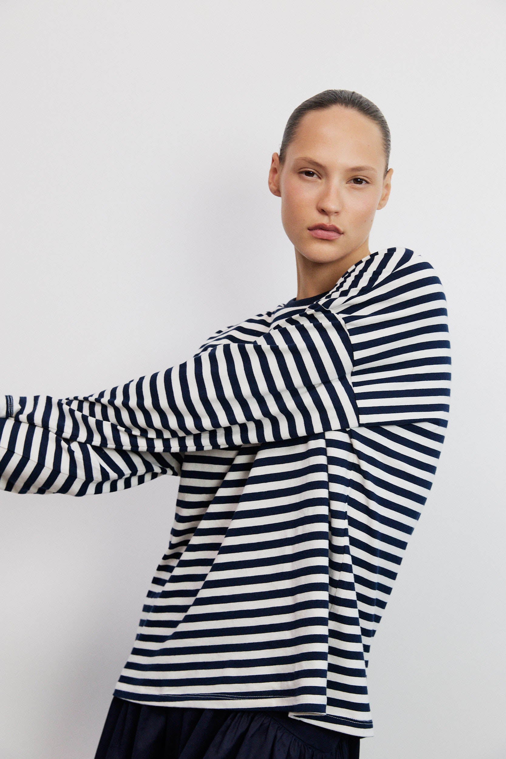 חולצת פסים קלאסית ארוכה, בגזרה רפויה וישרה עם נפילה חופשית, בעלת מפתח צוואר עגול, תפרי כתף עדינים ושרוולים מלאים, מה שמעניק לה קו מודרני ושימושי.