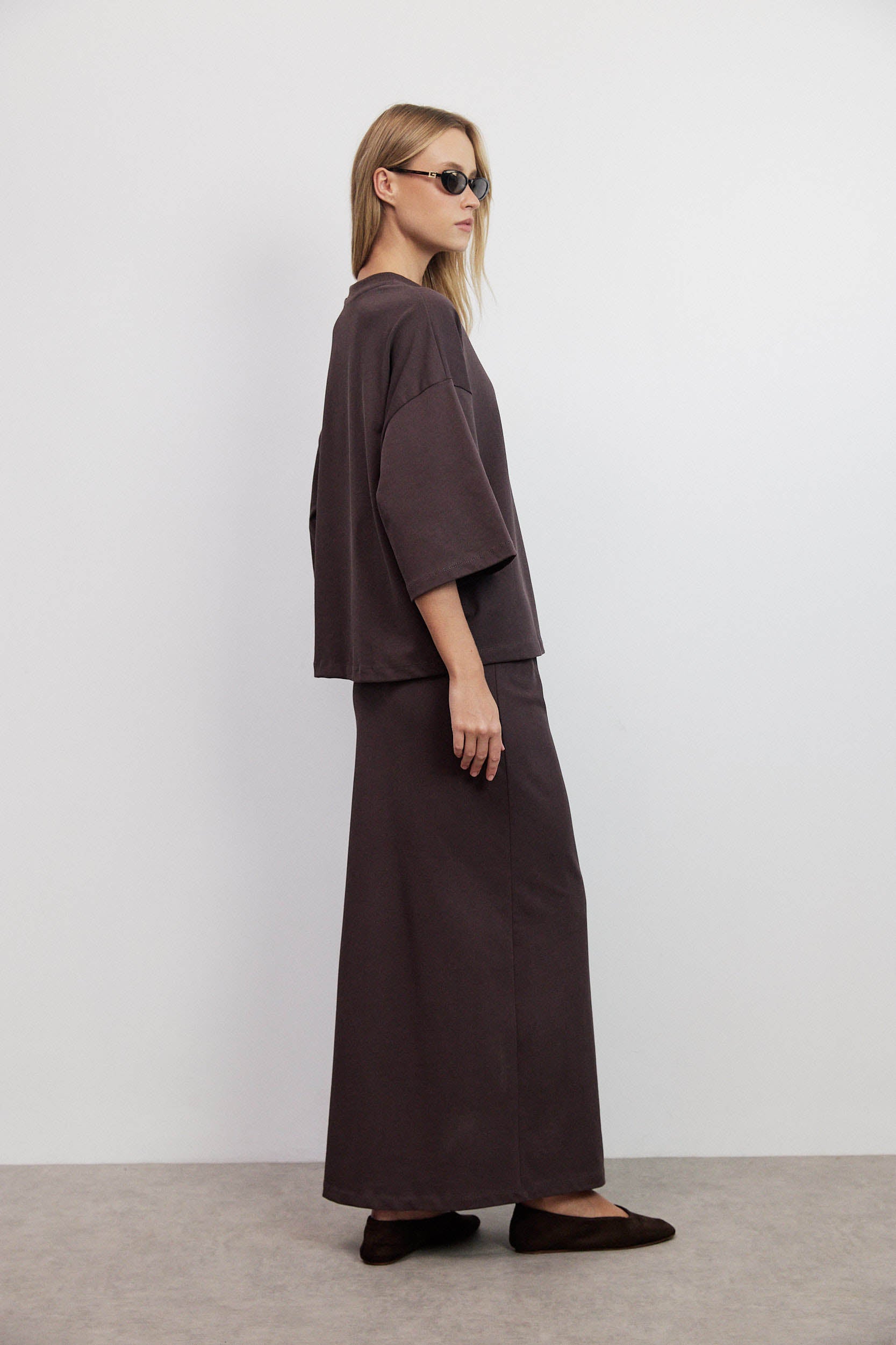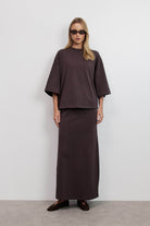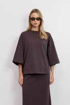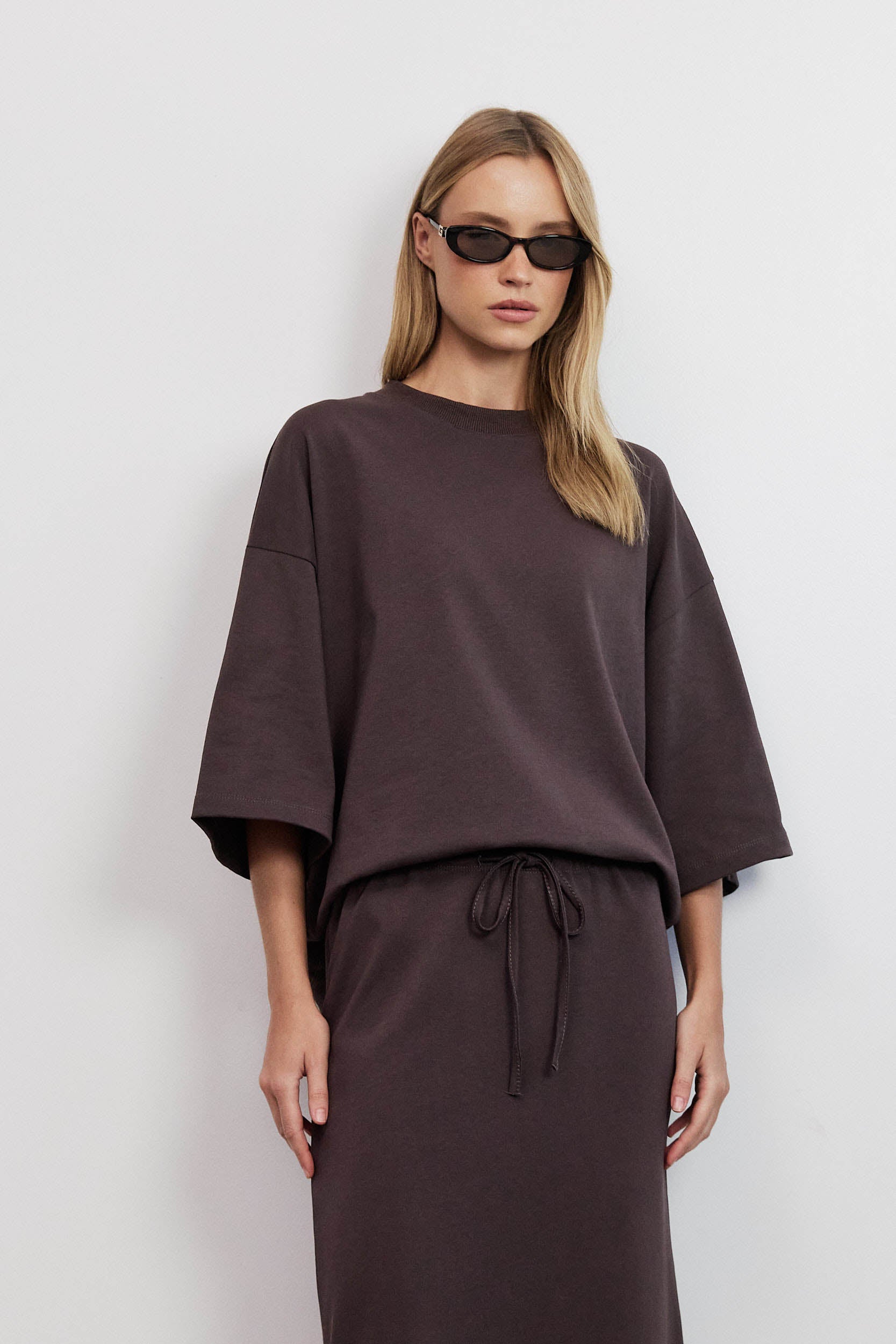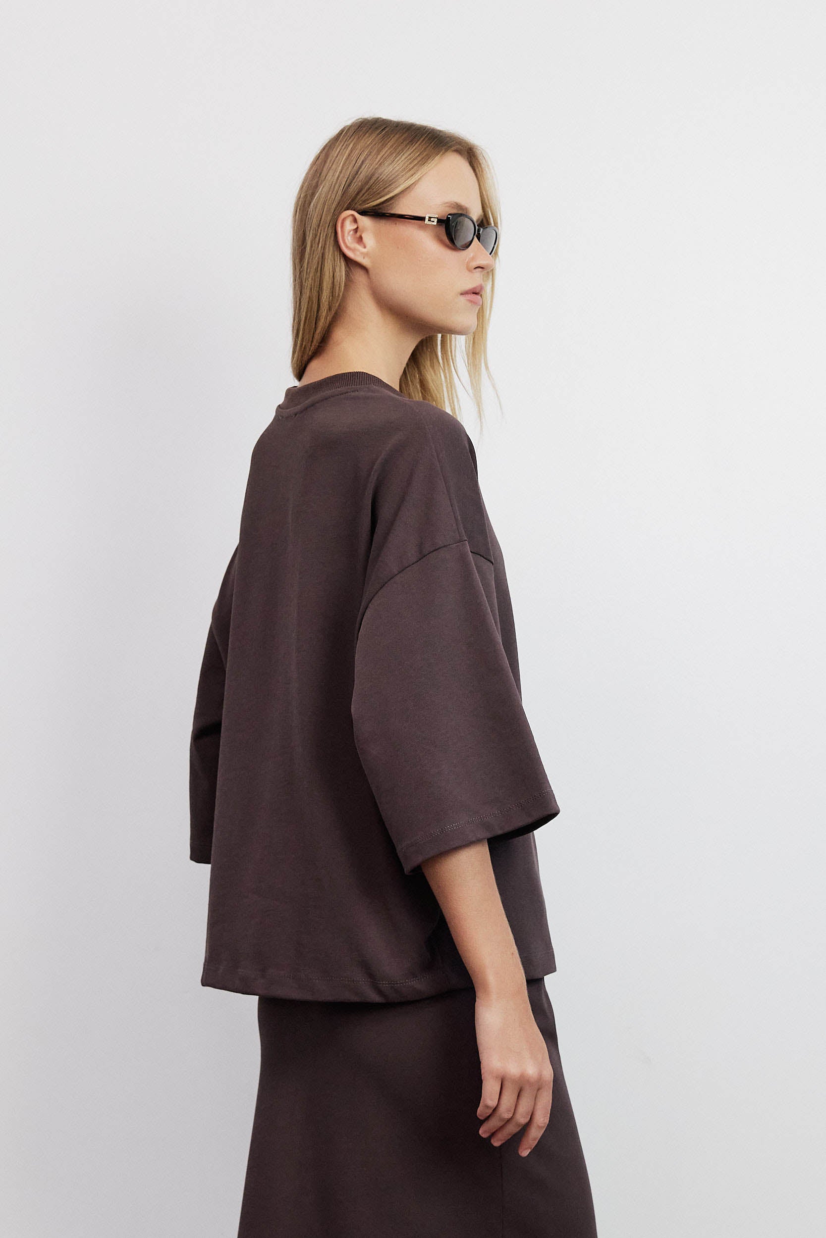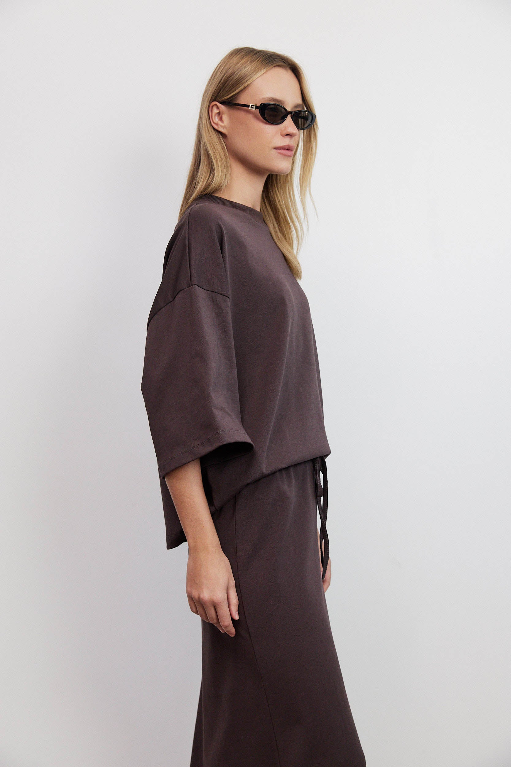 הבד רך ונשפך בעדינות על הגוף, ויוצר מראה נינוח אך מתוחכם. השרוולים רחבים באורך 3/4 עם כתפיים שמוטות, מה שמוסיף קו אדריכלי וסילואט עכשווי. המפתח עגול וסגור, שמעניק תחושת פשטות אלגנטית.