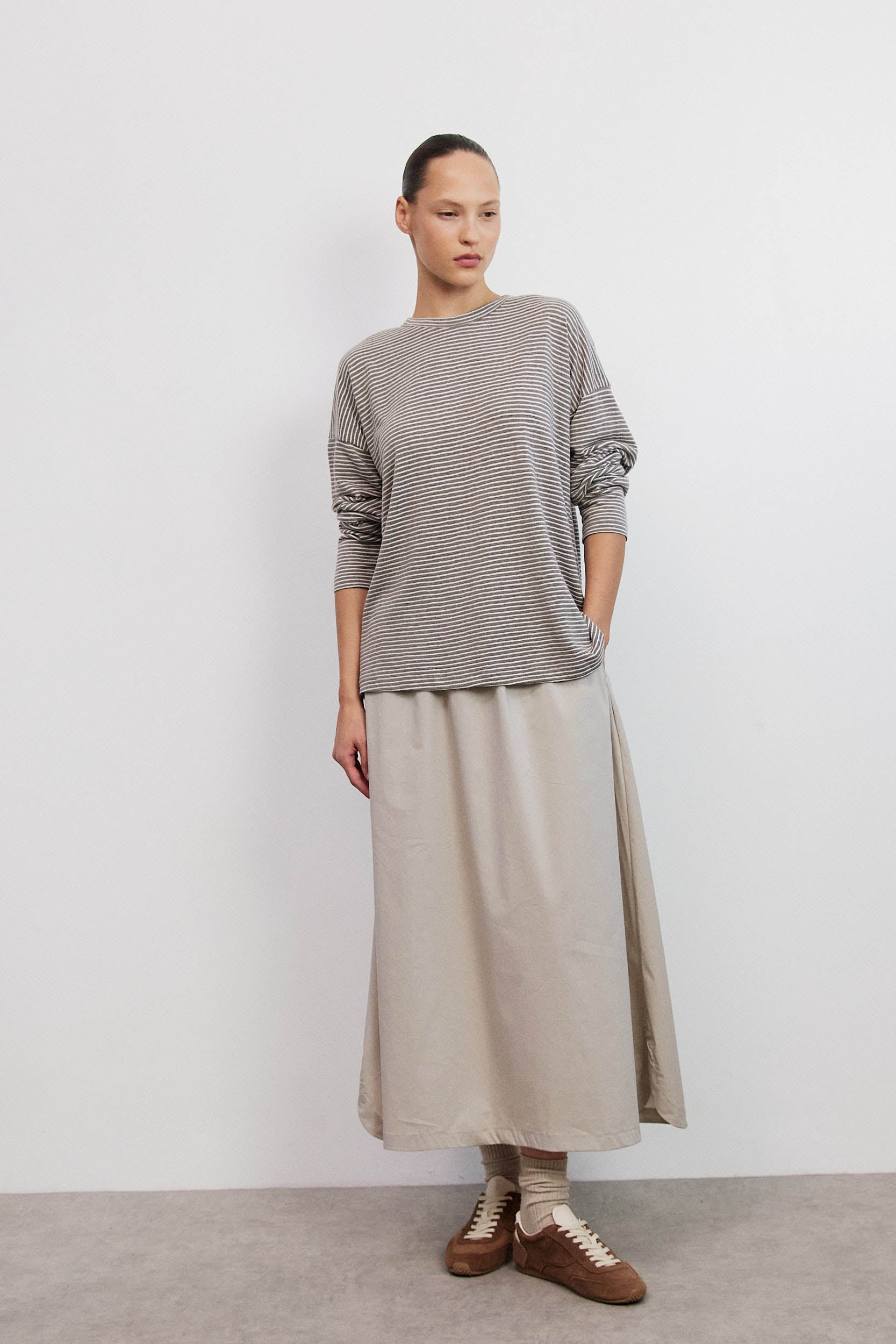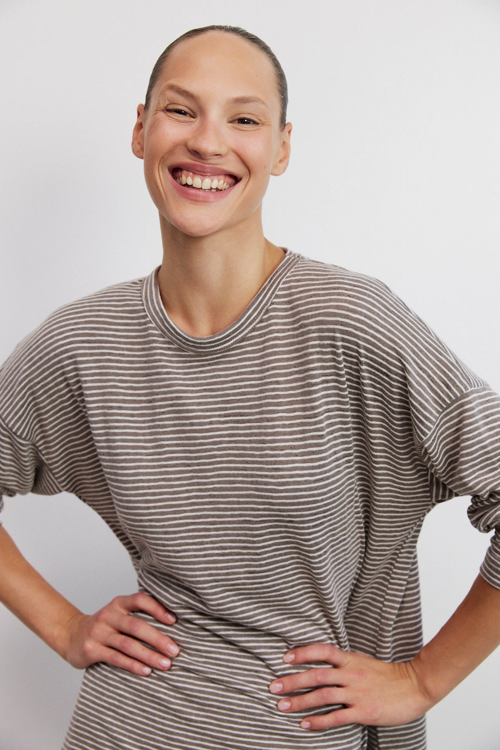 חולצת פסים בייסיק בגזרה רפויה, עשויה בד קליל ונעים למגע עם שרוולים ארוכים ומפתח צוואר עגול וקלאסי.