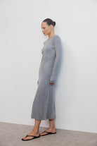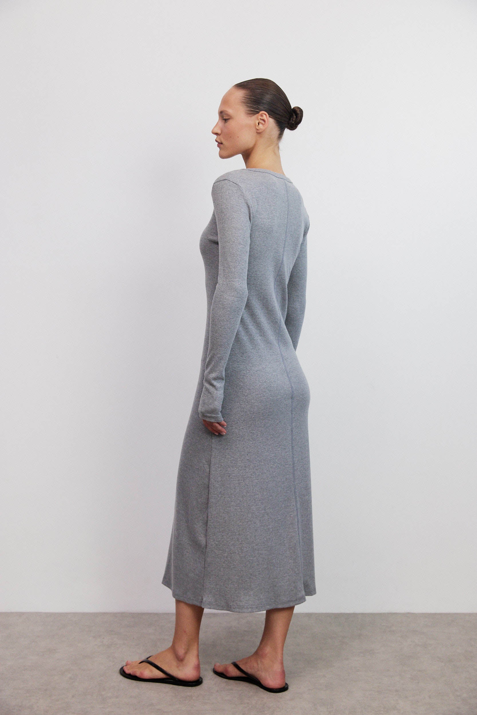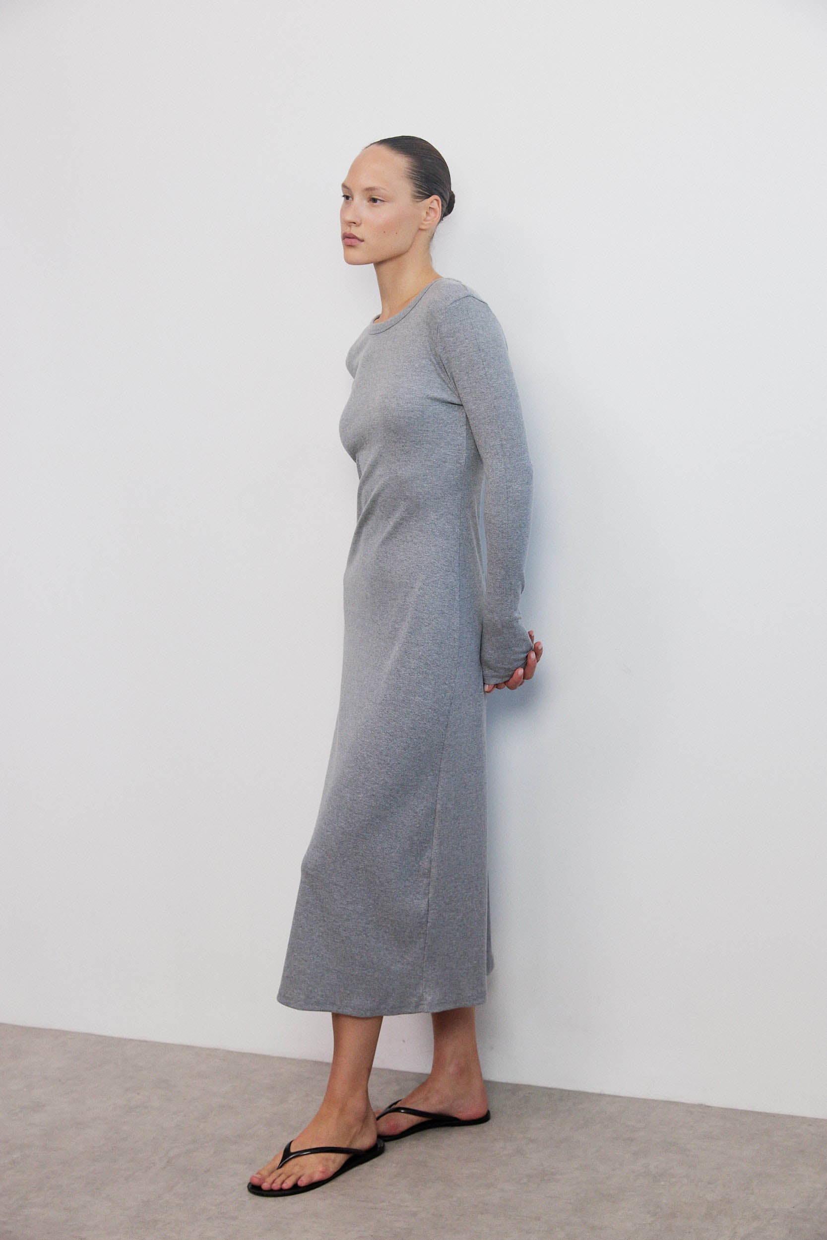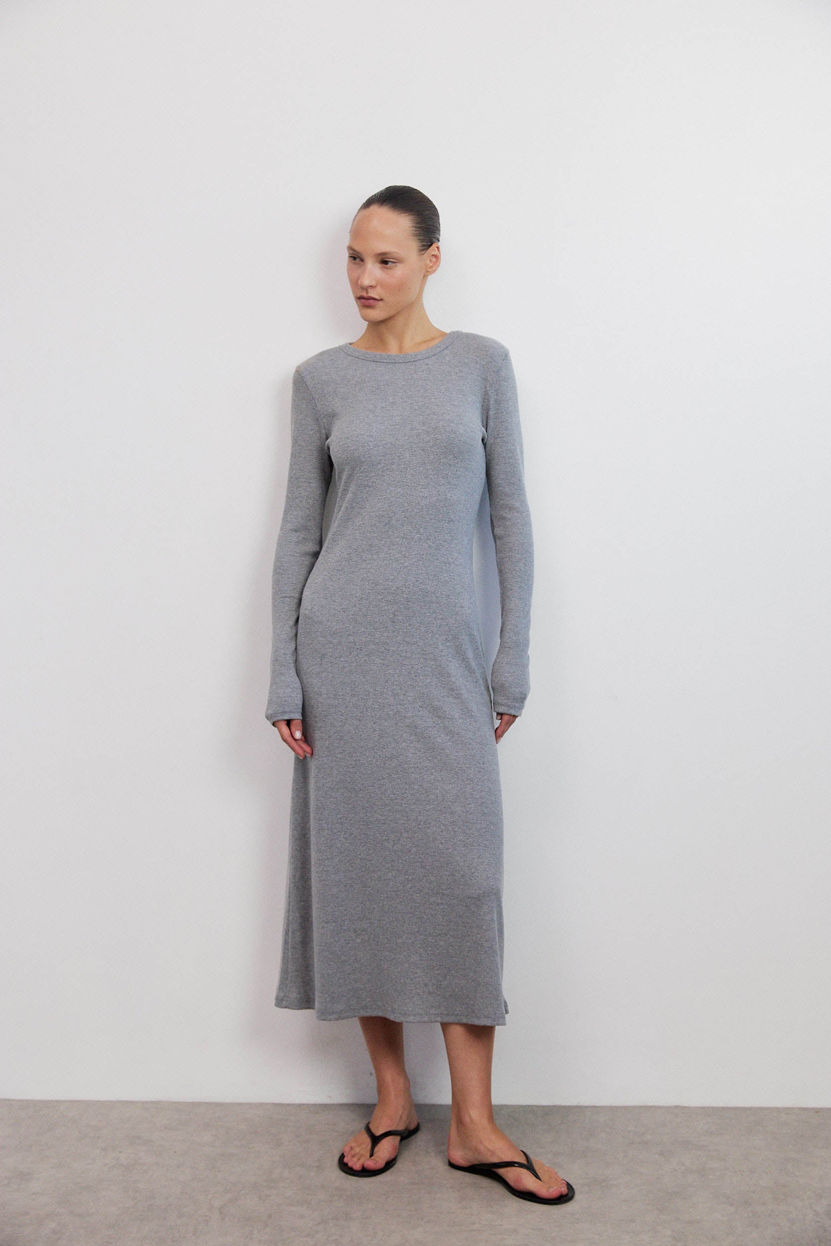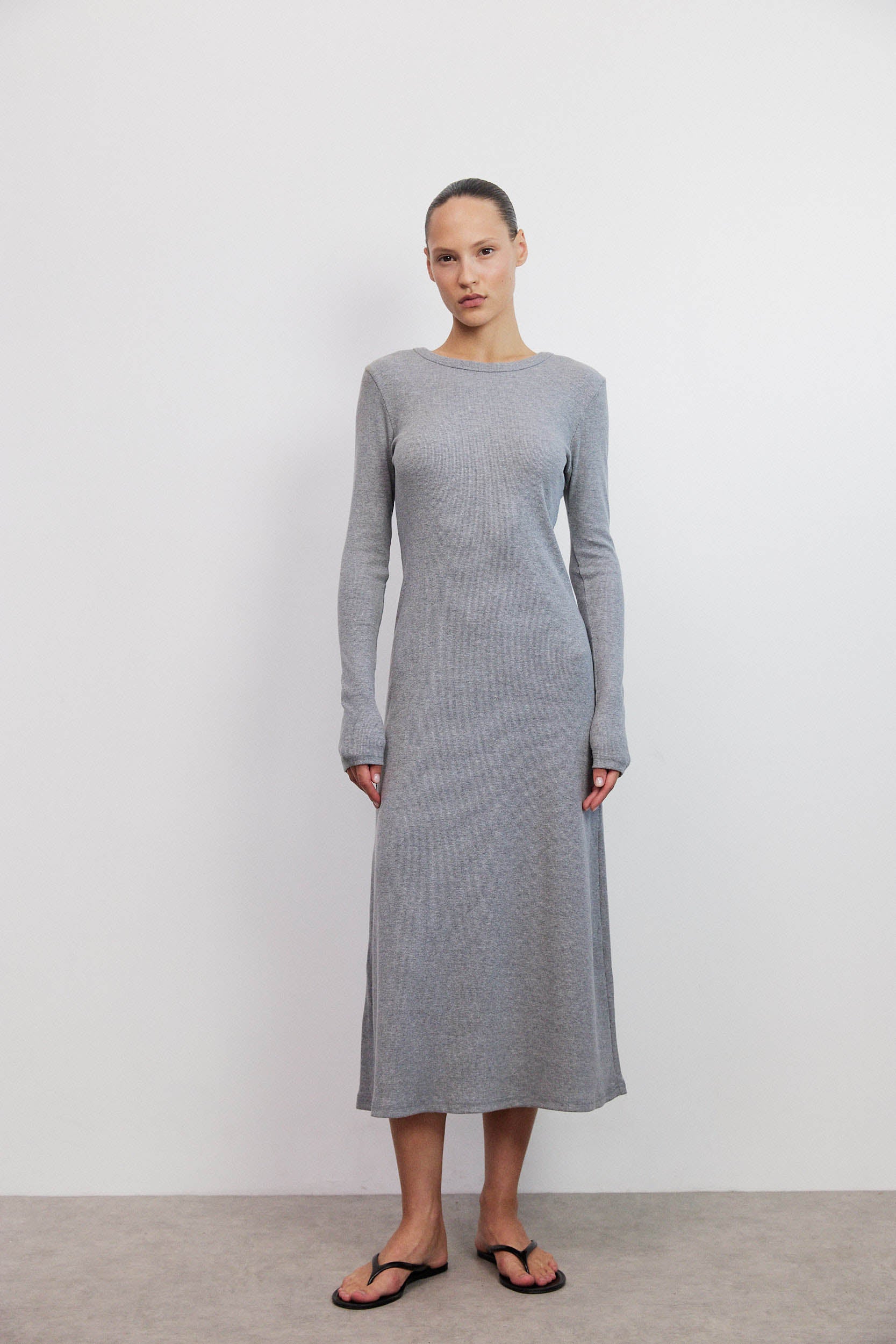 שמלת מקסי ארוכה, מינימליסטית ומדויקת בגזרה צמודה אך משוחררת, בעלת בד רך ונושם עם שרוולים ארוכים ומפתח צוואר עגול.
