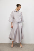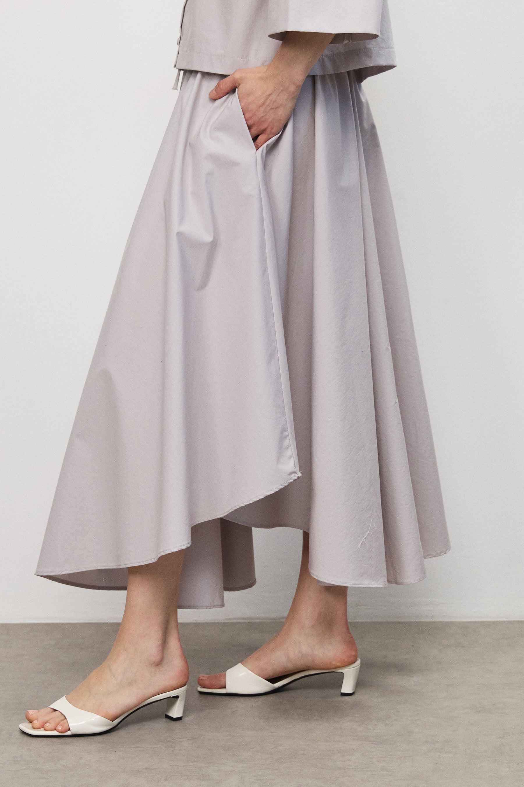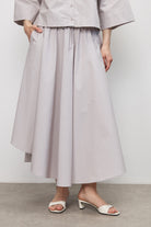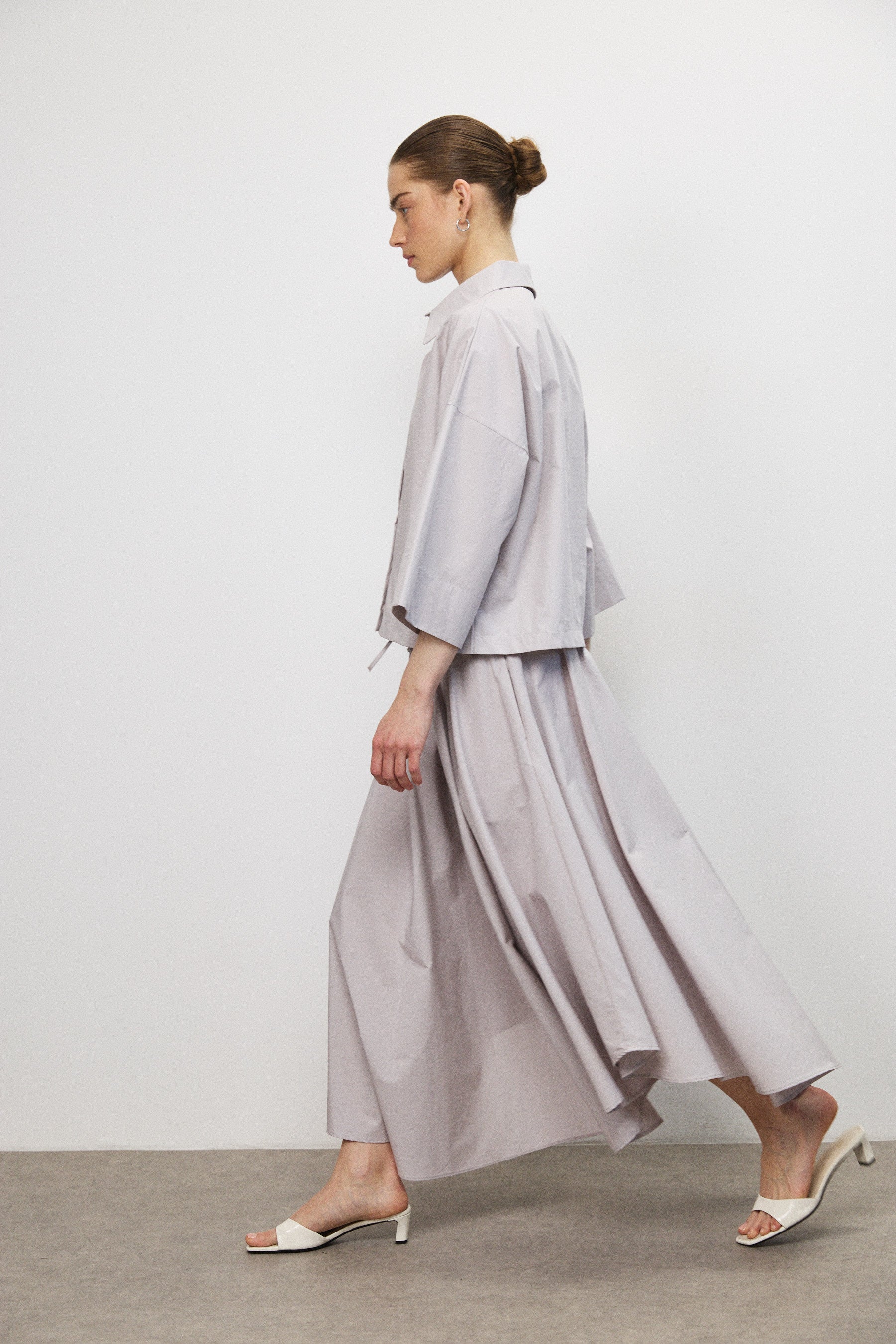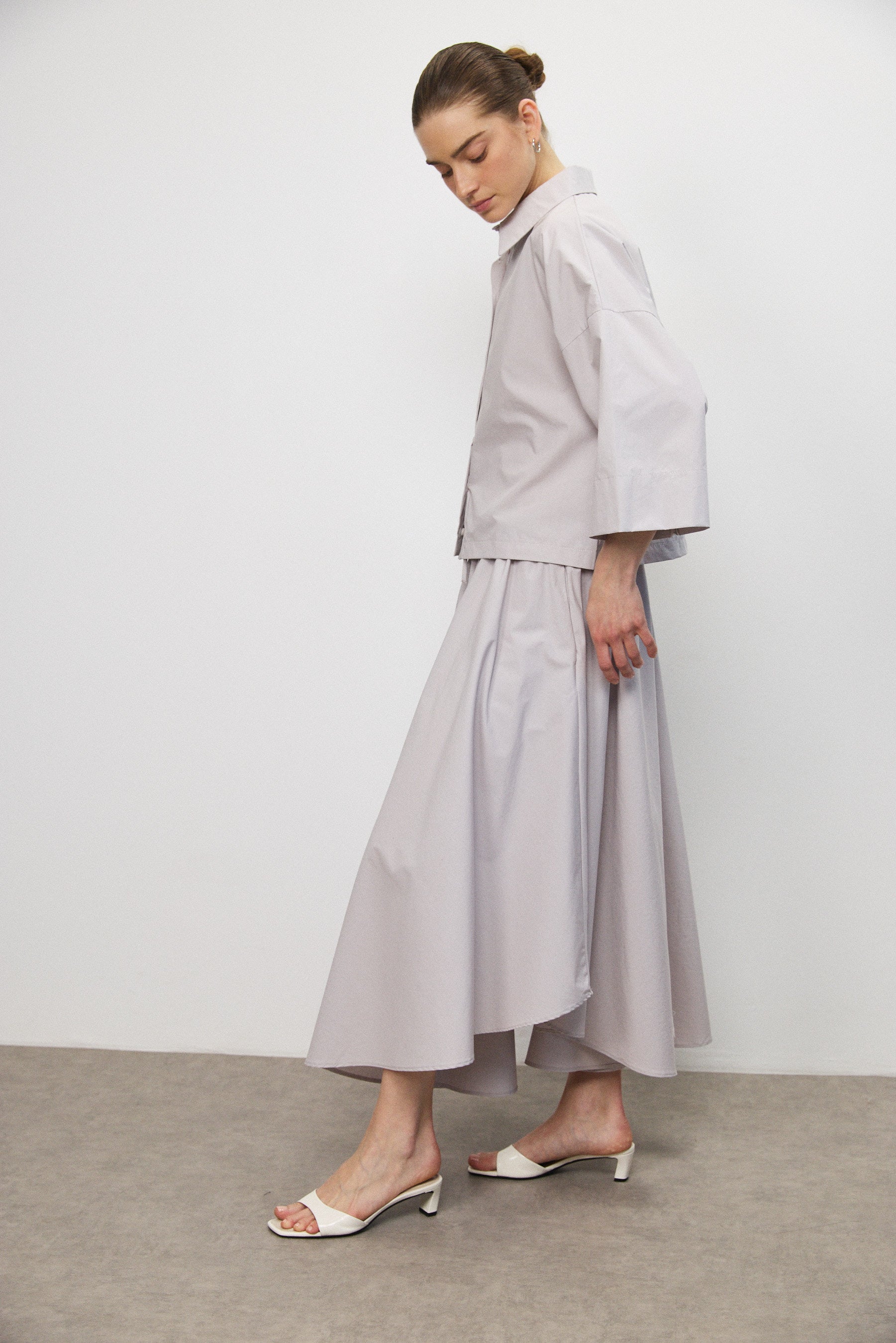 חצאית קלילה ונשפכת, עשויה בד כותנה אוורירי בגזרה רחבה ומשוחררת. כוללת חיתוך א־סימטרי עדין בתחתית וקו מותן אלסטי עם שרוך מתכוונן להתאמה נוחה ומדויקת. משתלבת באופן טבעי עם חולצת עלמה להשלמת סט הרמוני ומוקפד.