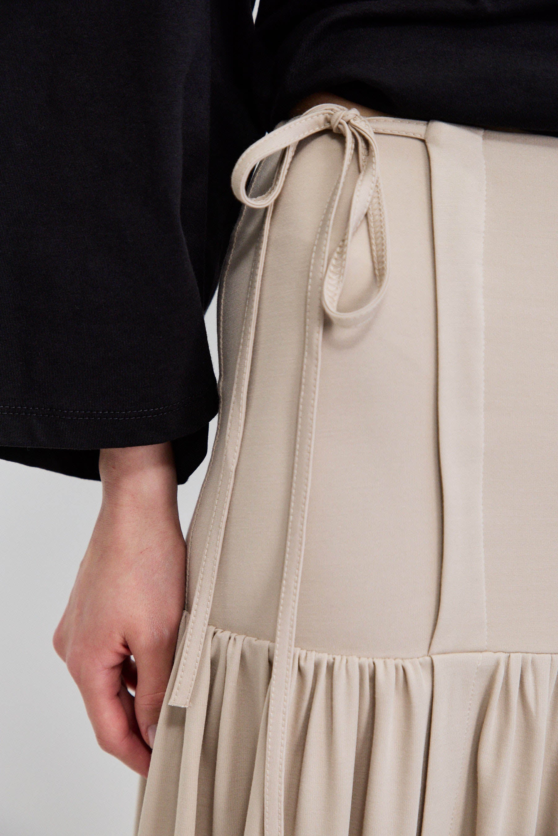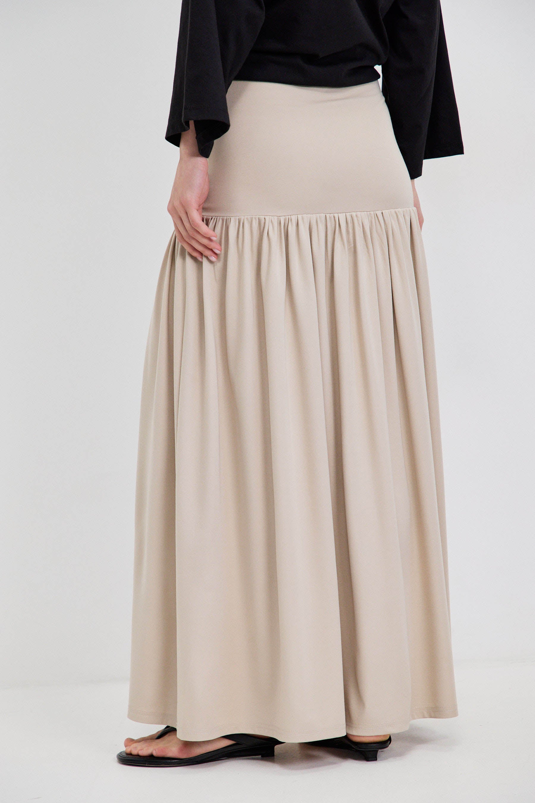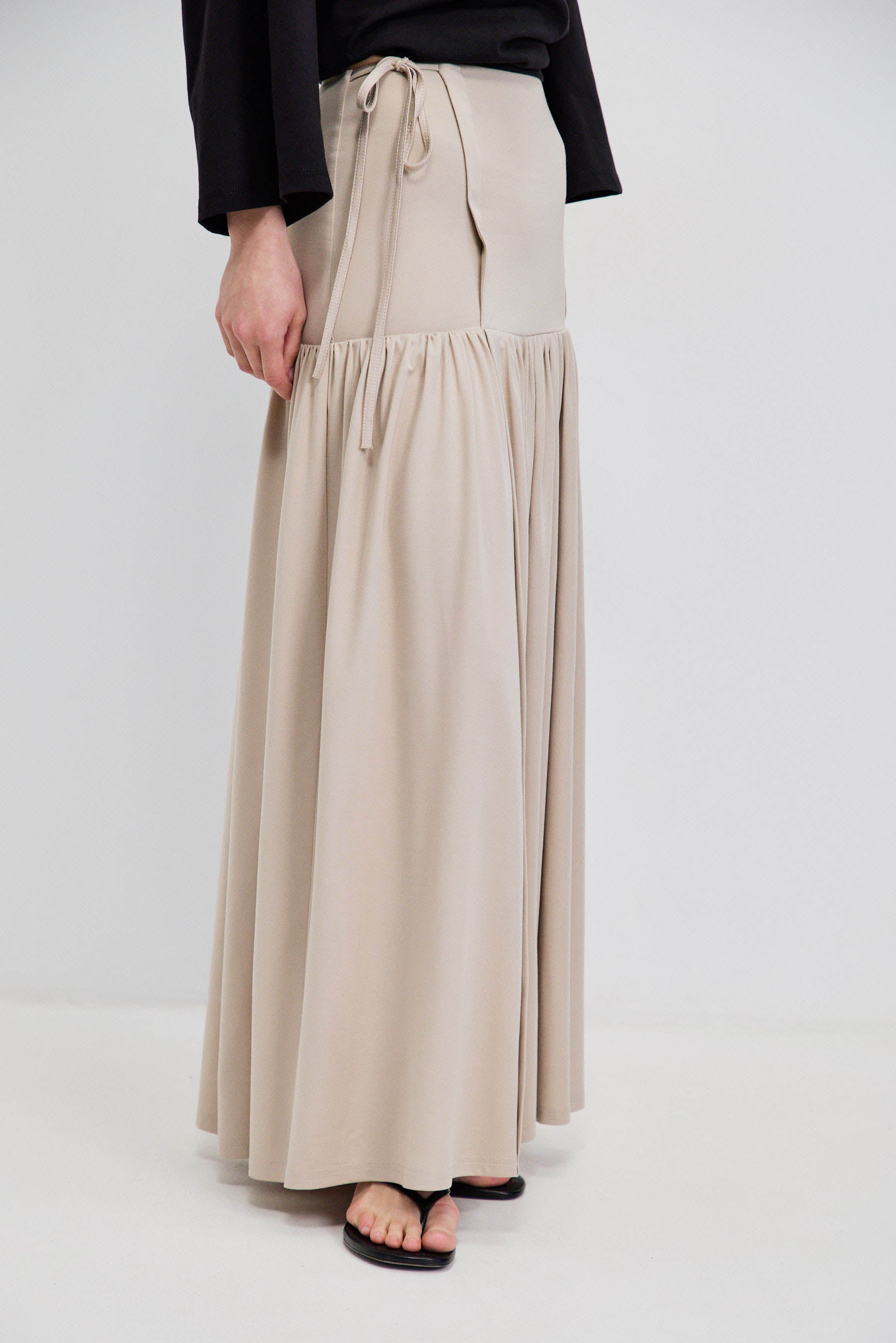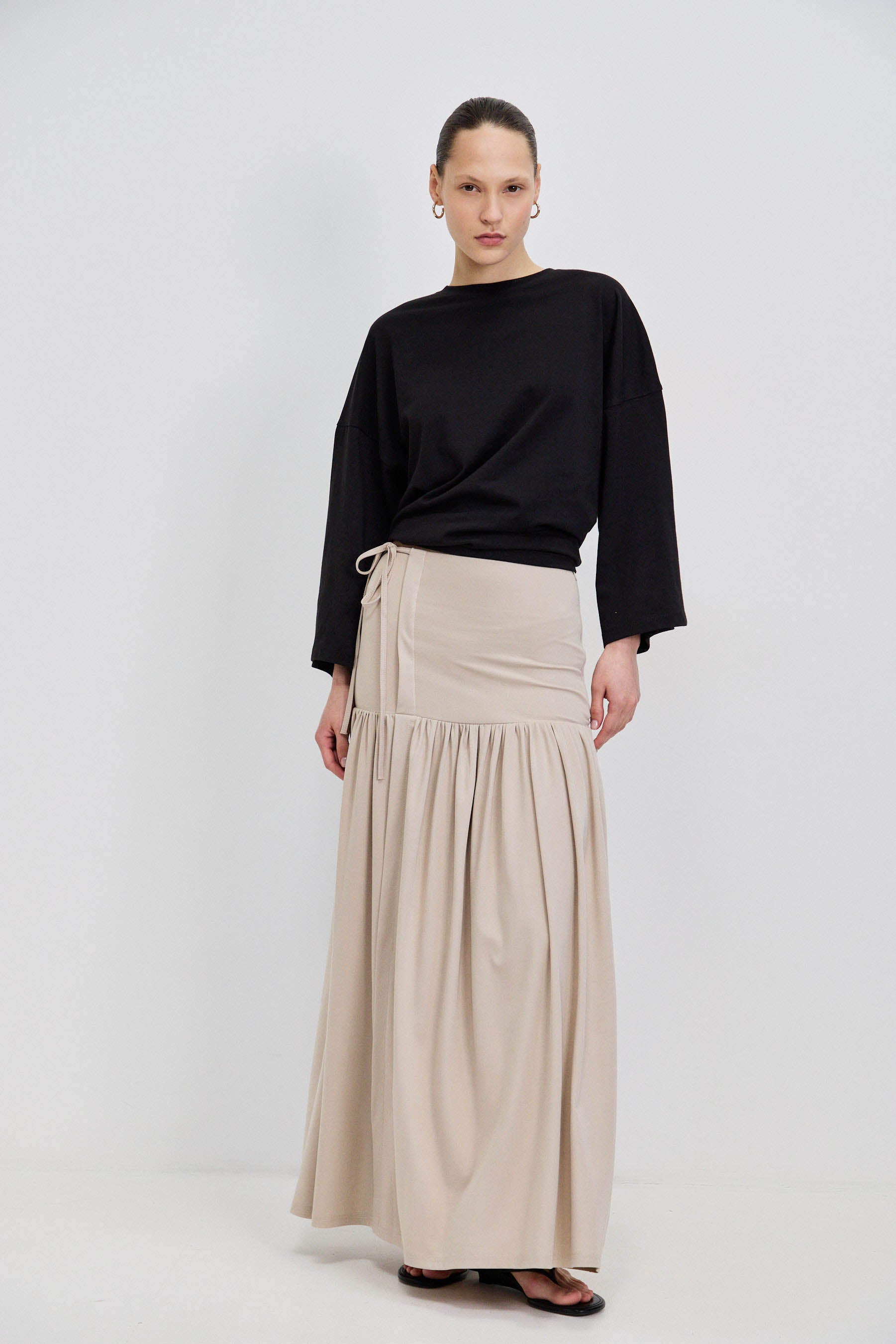 חצאית מקסי בגזרה נקייה עם חלק עליון מאוזן וישיבה מדויקת על המותן. מתחת לקו הירך נפתח נפח עדין היוצר תנועה רכה וזורמת. קו המותן כולל שרוך קשירה למראה טבעי ומעט לא מתאמץ. כוללת רוכסן צידי נסתר לשמירה על מראה מוקפד ואחיד.