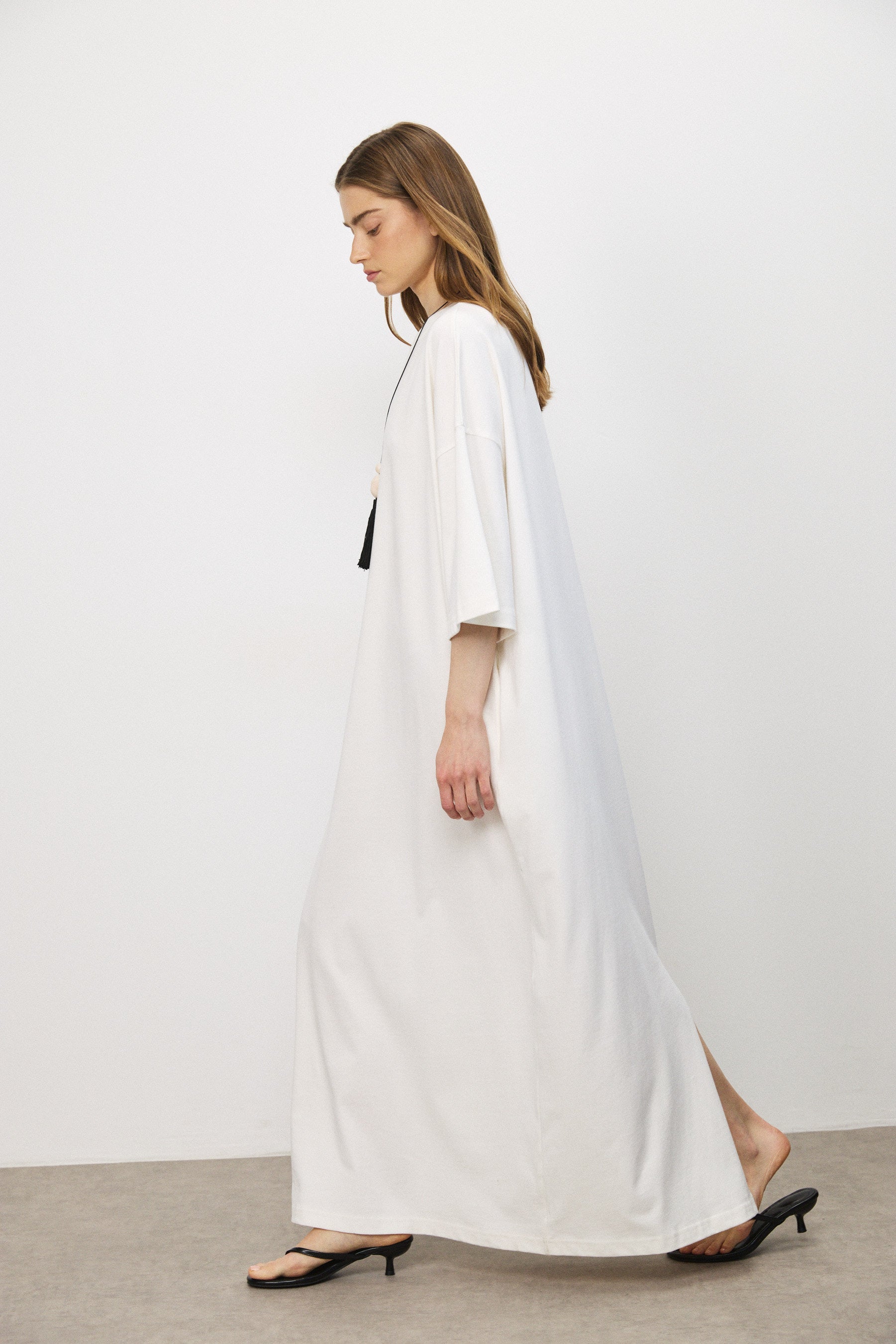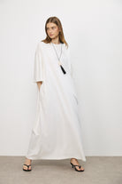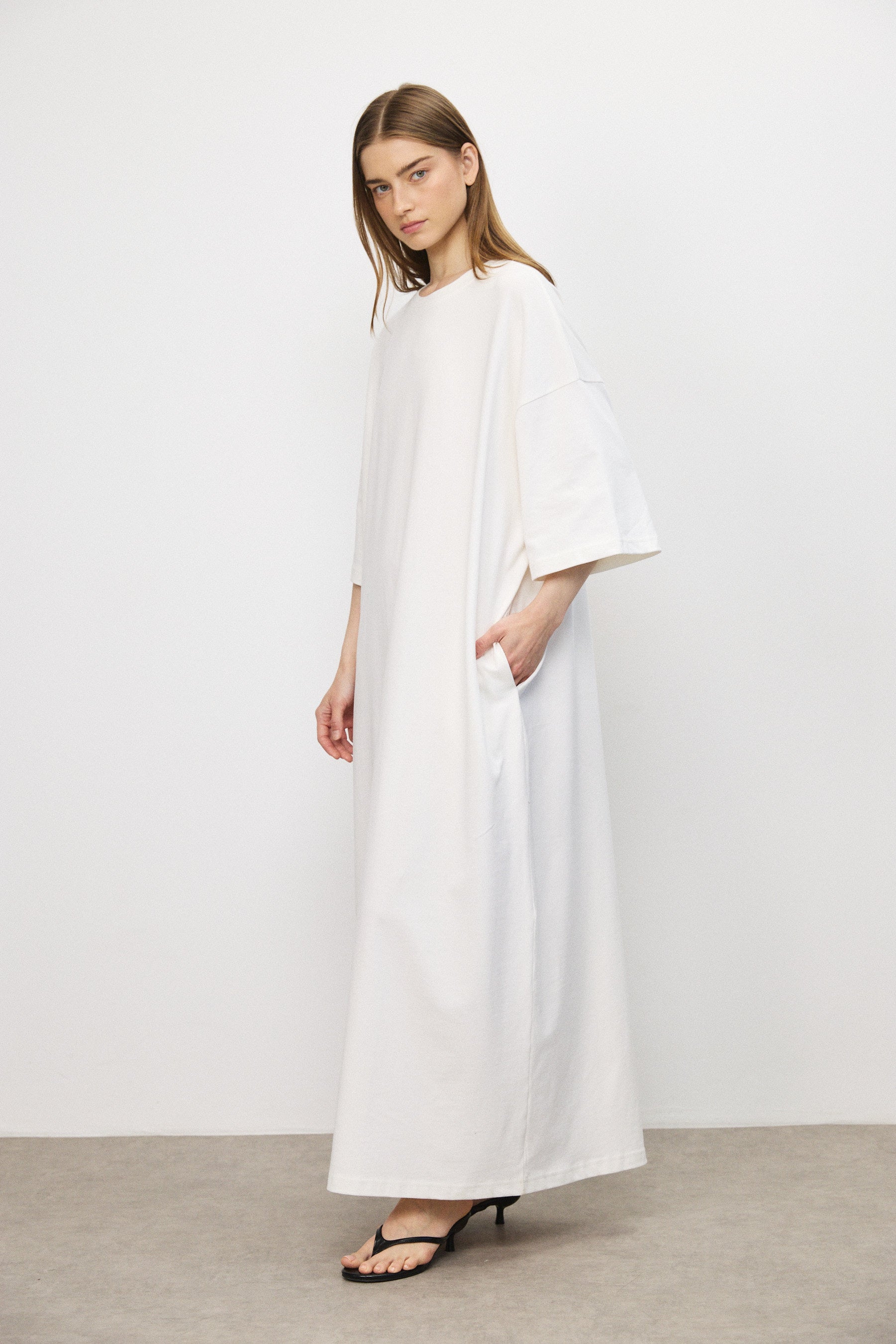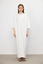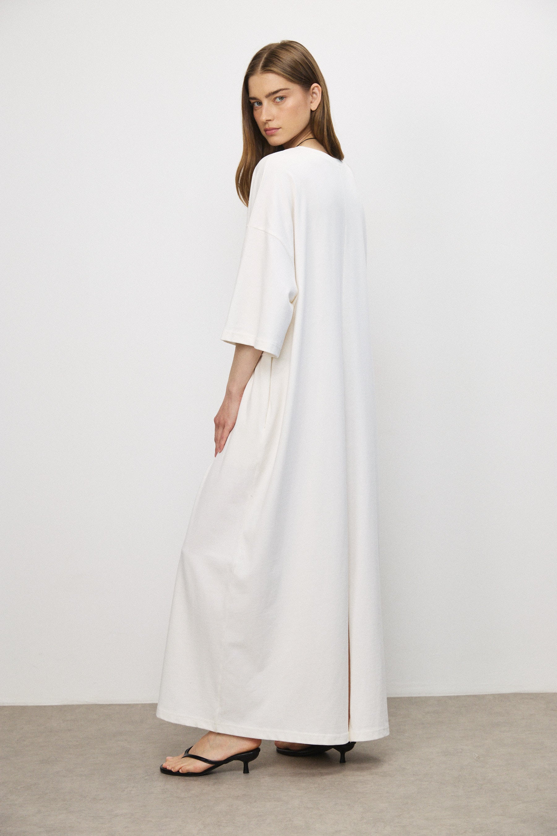 שמלת מקסי בגזרת אוברסייז בעיצוב נקי ומדויק, עשויה בד כותנה עשיר בעל נפילה רכה ותנועה עוטפת. קווים נקיים וקו כתפיים נמוך מעניקים לה נוכחות מודרנית ומאוזנת.