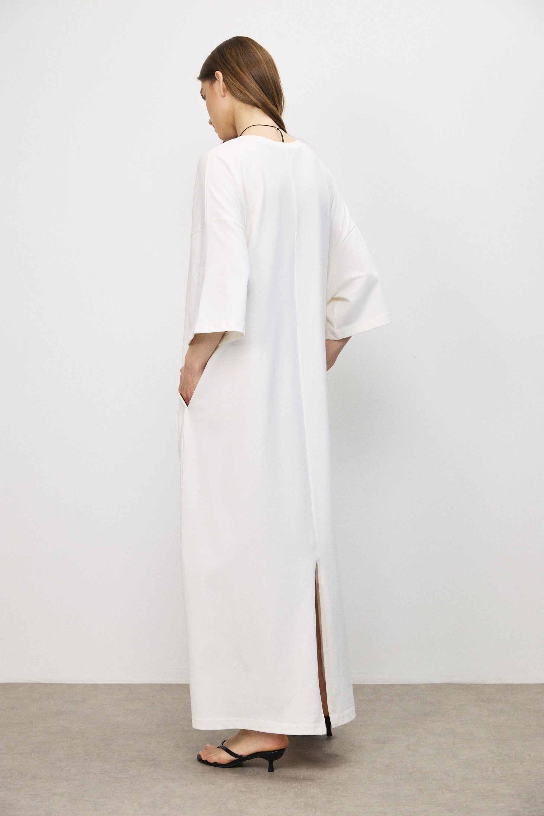 לשמלה מפתח צוואר מינימליסטי, שרוולי שלושה רבעים בעלי נפח עדין ושסע אחורי המאפשר תנועה נוחה וזורמת. מתאימה ללוק יומיומי מוקפד ולערב לא מתאמץ.