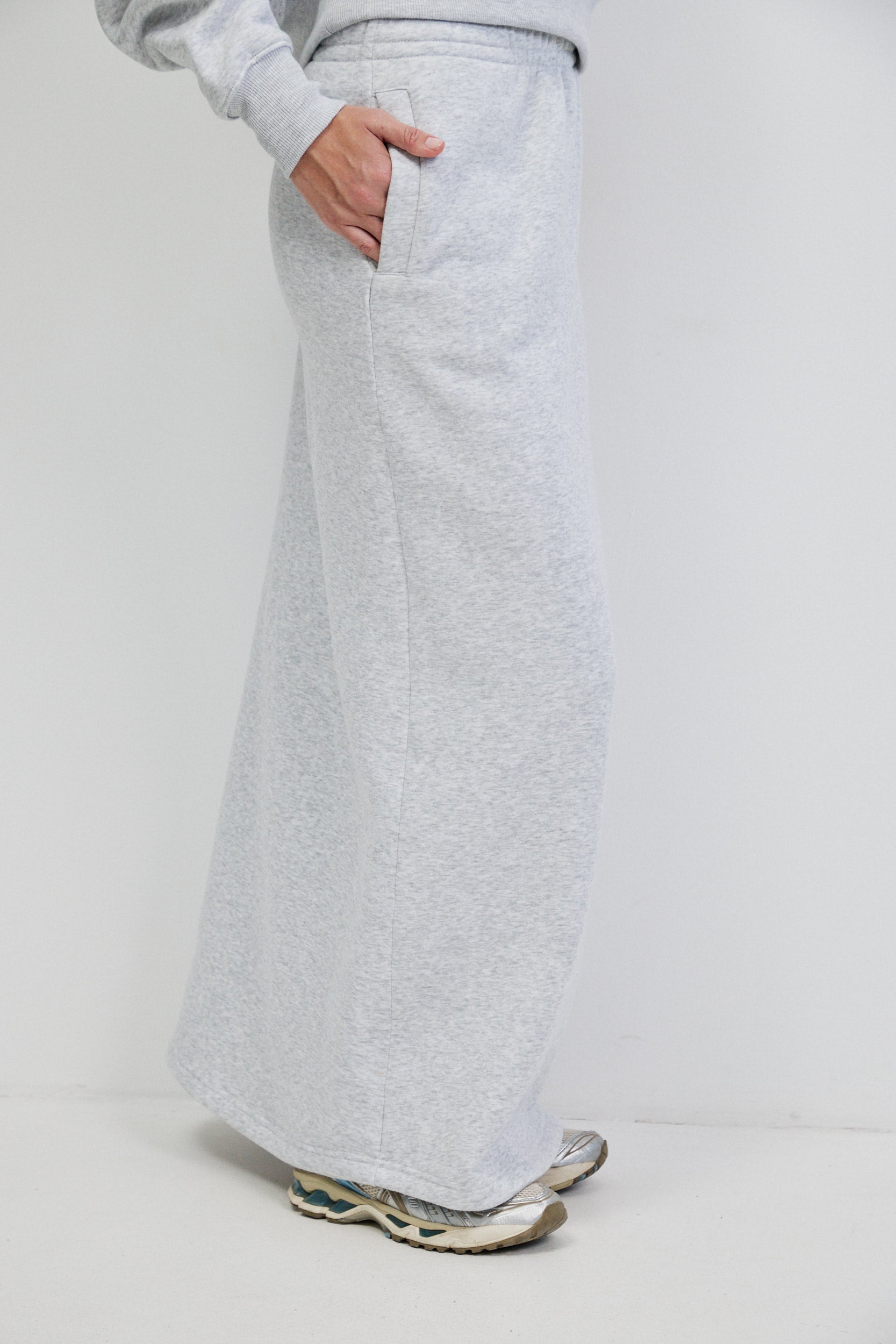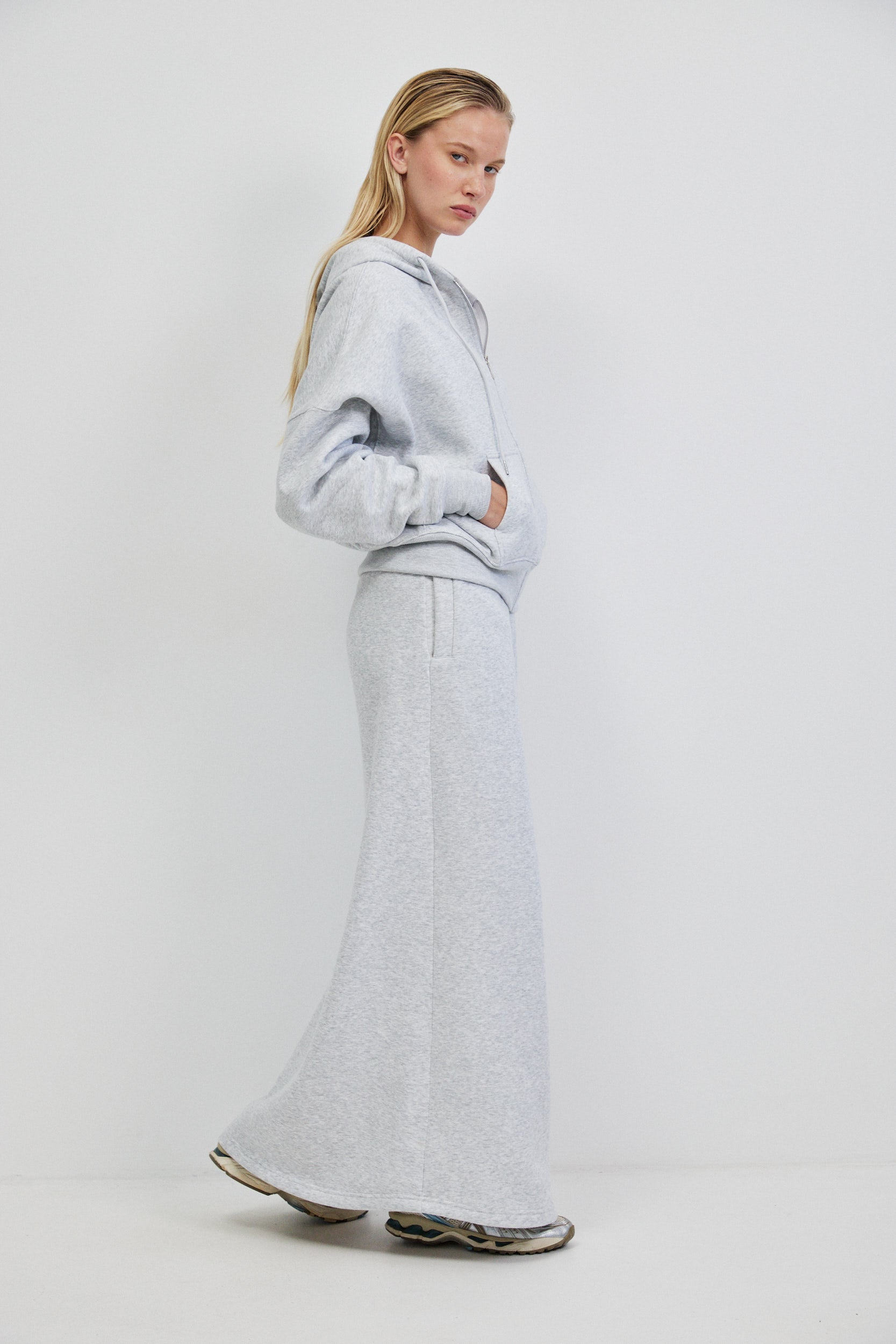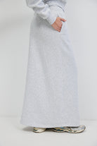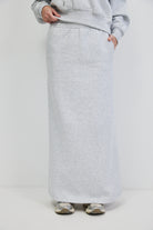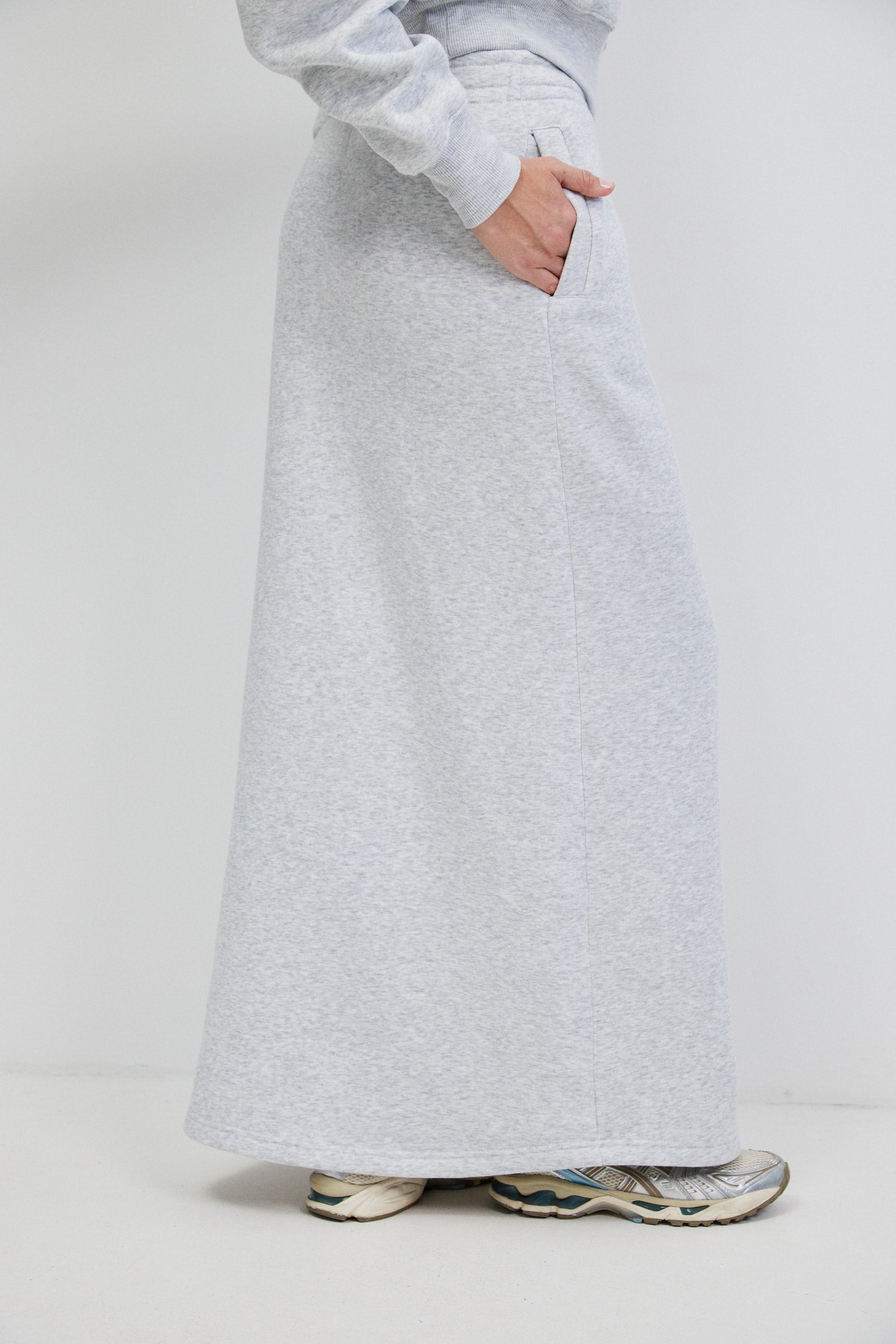 חצאית מקסי בגוון אפור מלאנז' מבד פוטר עבה ורך, בגזרה ישרה ומדויקת. לחצאית מותן עם רצועת גומי רחבה בעלת נוכחות נקייה וכיסים צידיים המשולבים בקו מינימליסטי.