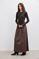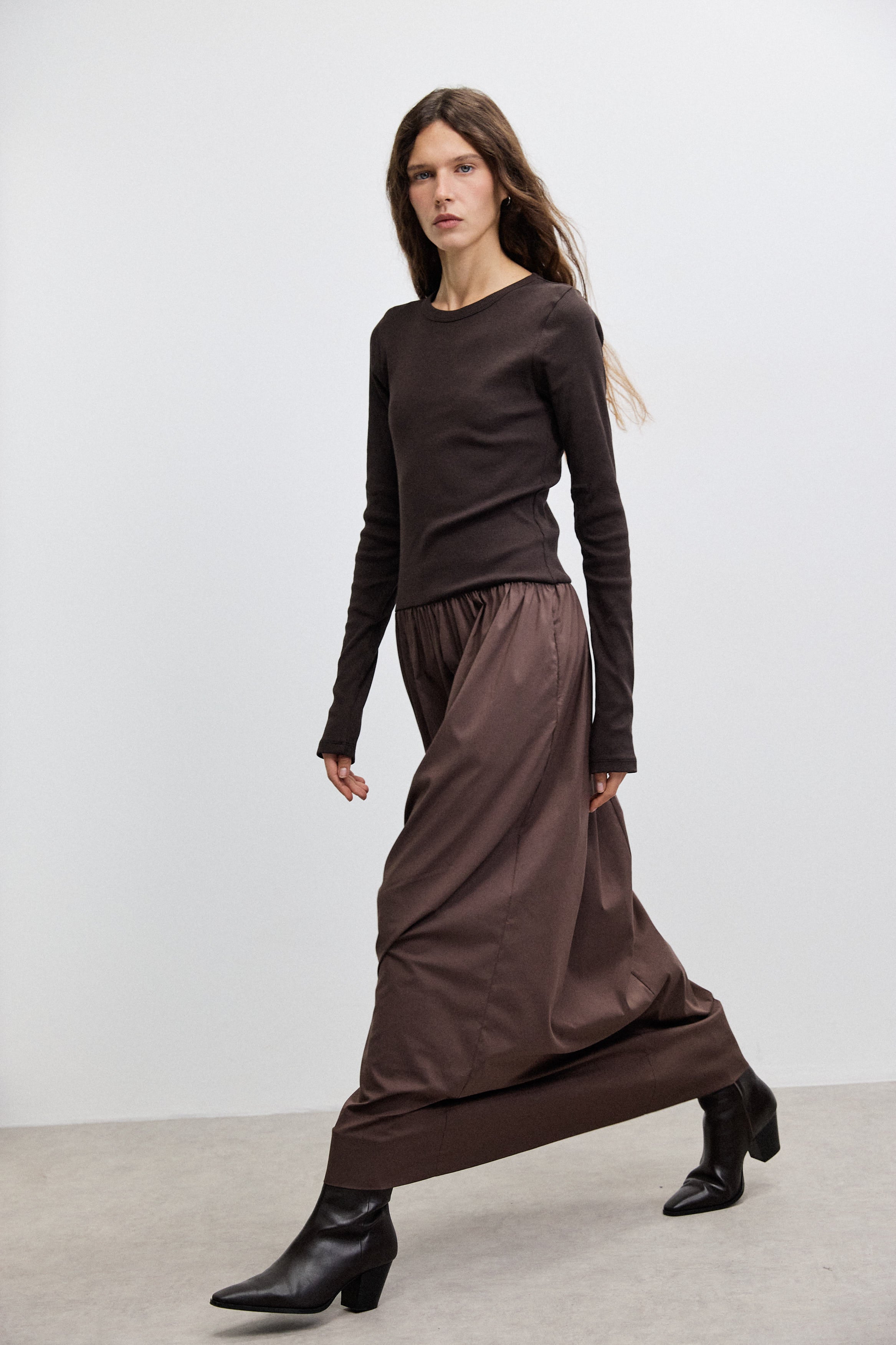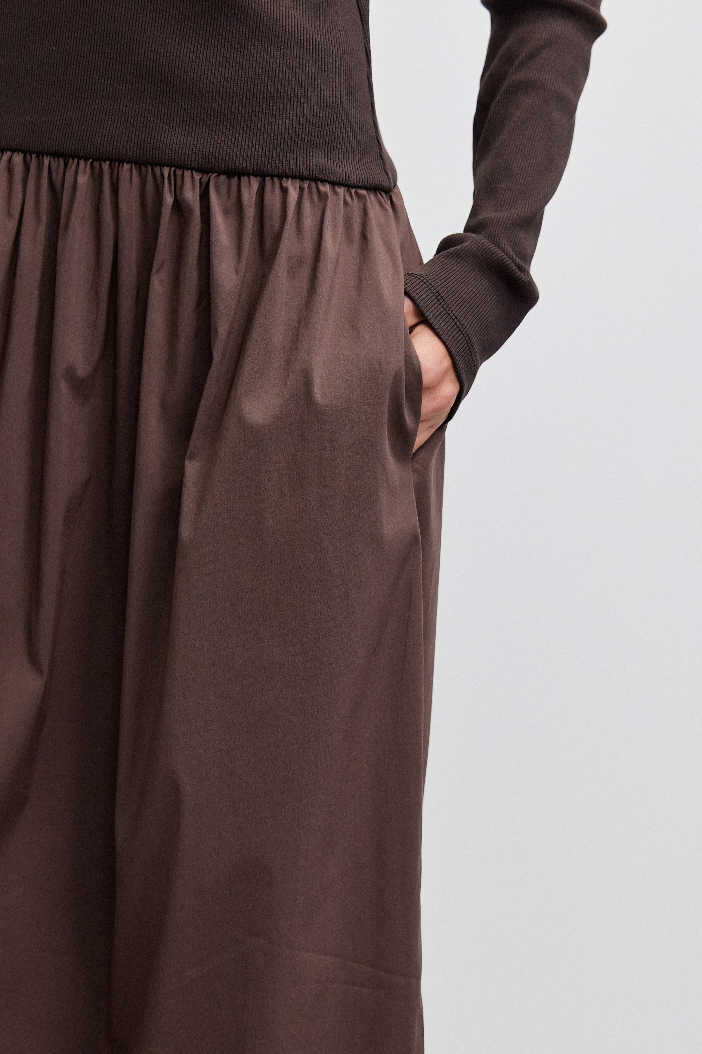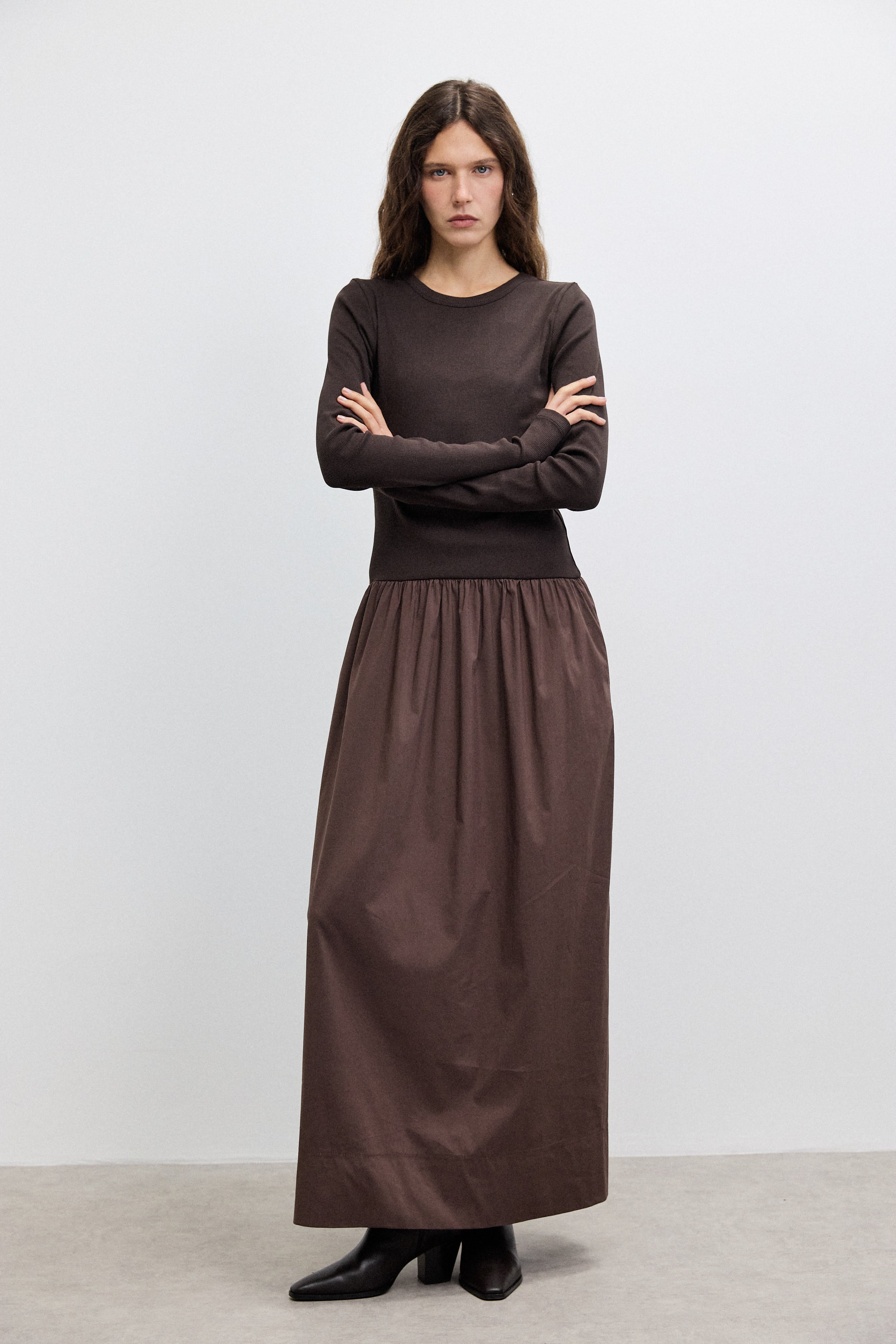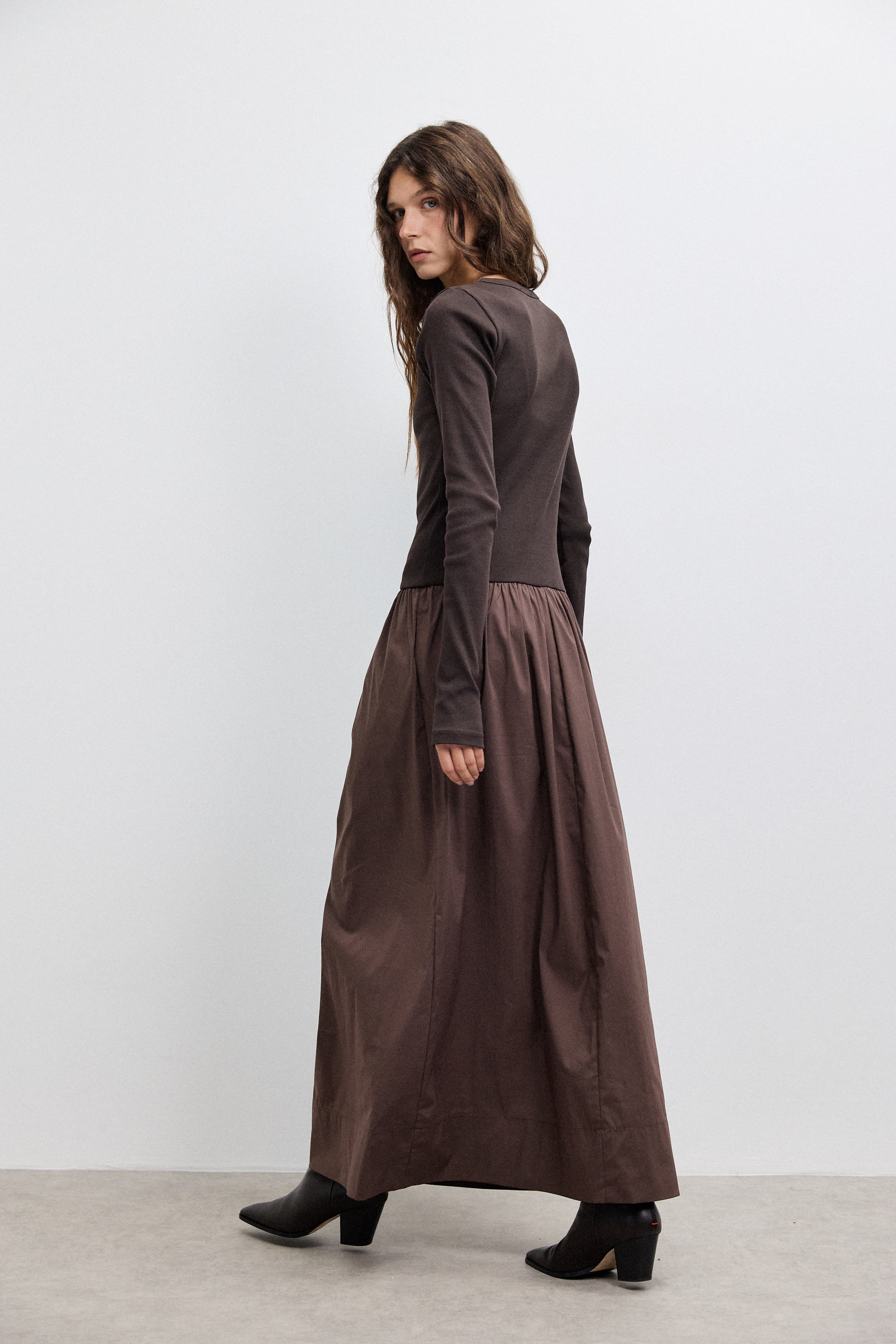 שמלת מקסי בשילוב מוקפד של שני בדים: חלק עליון מבד ריב 100% כותנה וחלק תחתון מאריג כותנה איכותי. הגזרה יוצרת איזון טבעי בין נוחות ליופי, עם נפילה מחמיאה ותנועה חופשית. כוללת כיסים פונקציונליים ומפתח צוואר בגזרת ניקי, למראה נשי, נקי ומעודן שמתאים ליום ולערב.