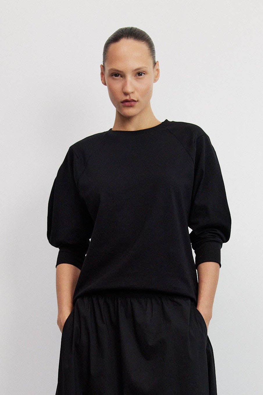 חולצה נקייה וקלאסית בעלת שרוולים באורך ביניים עם נפח קל בכתפיים וגימור אלסטי בקצה השרוול, בעלת מפתח צוואר עגול קלאסי.