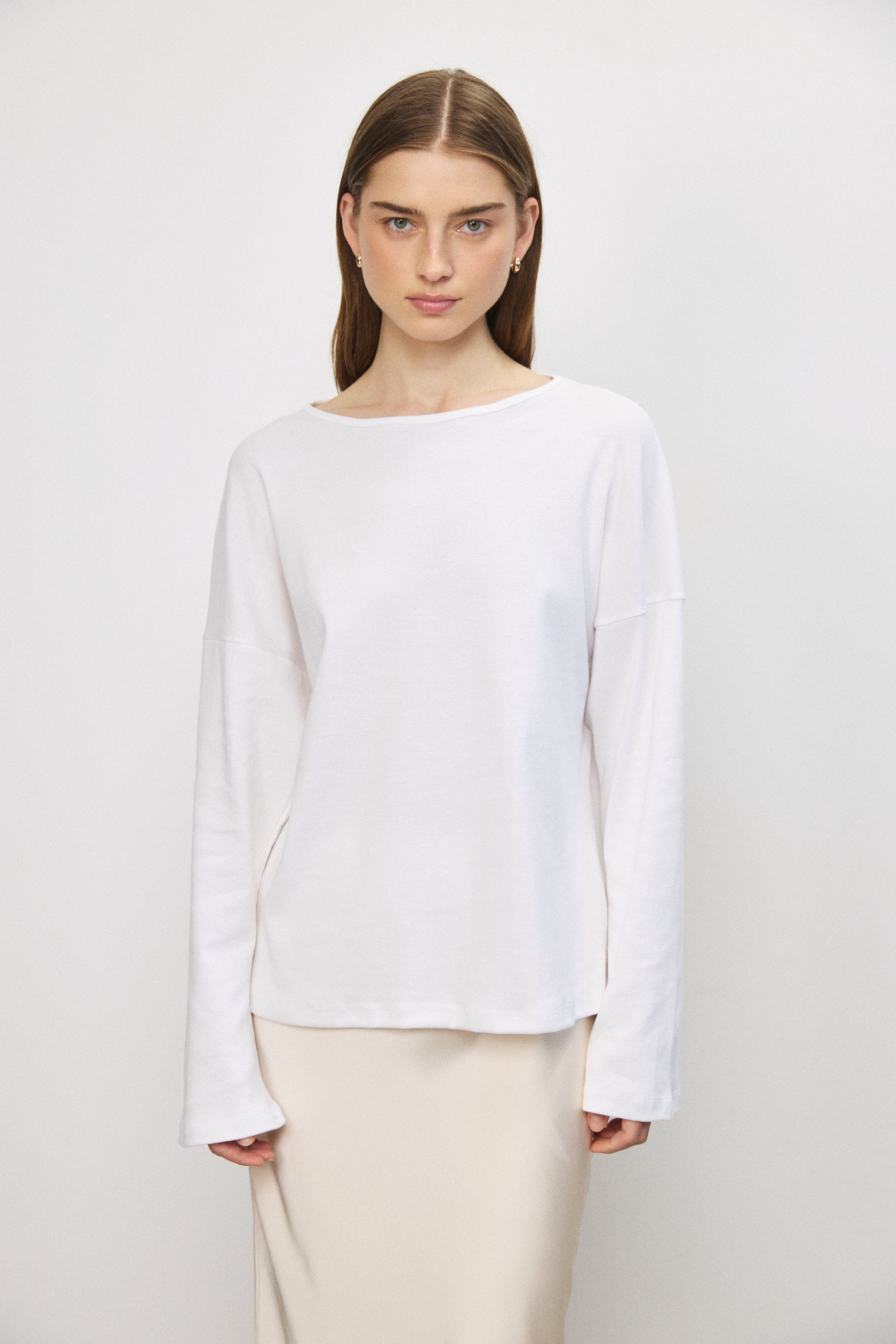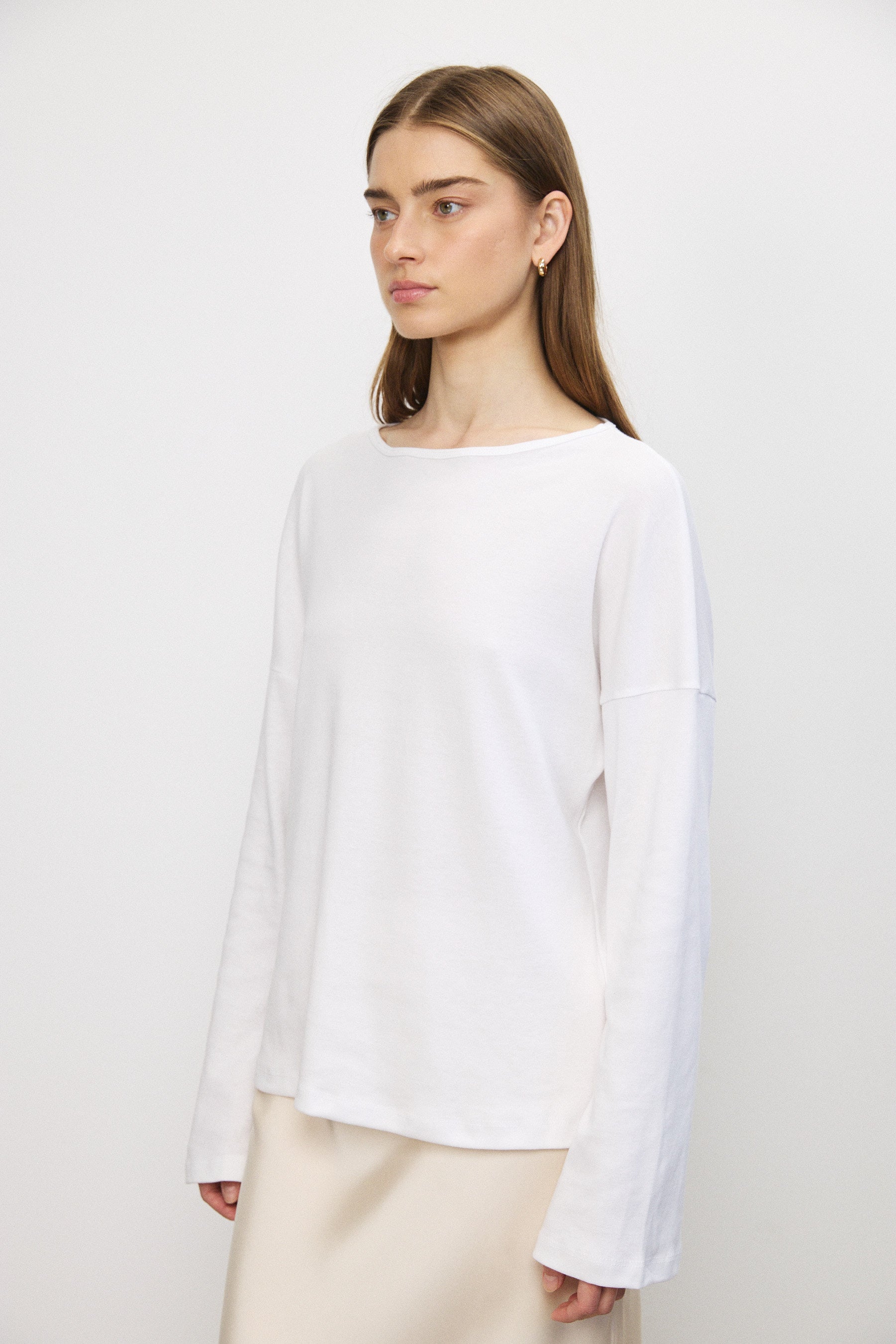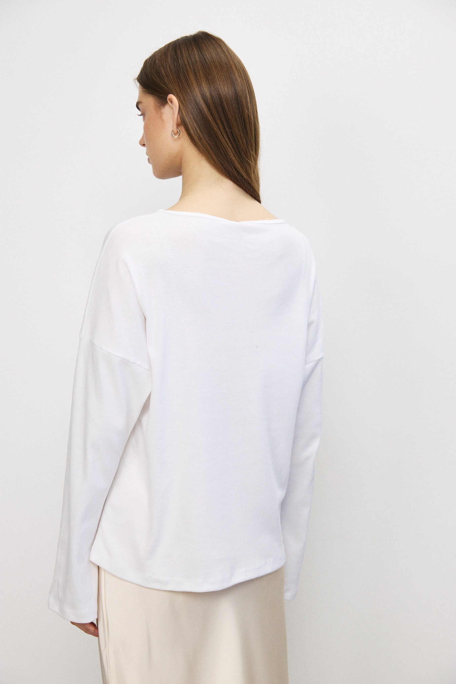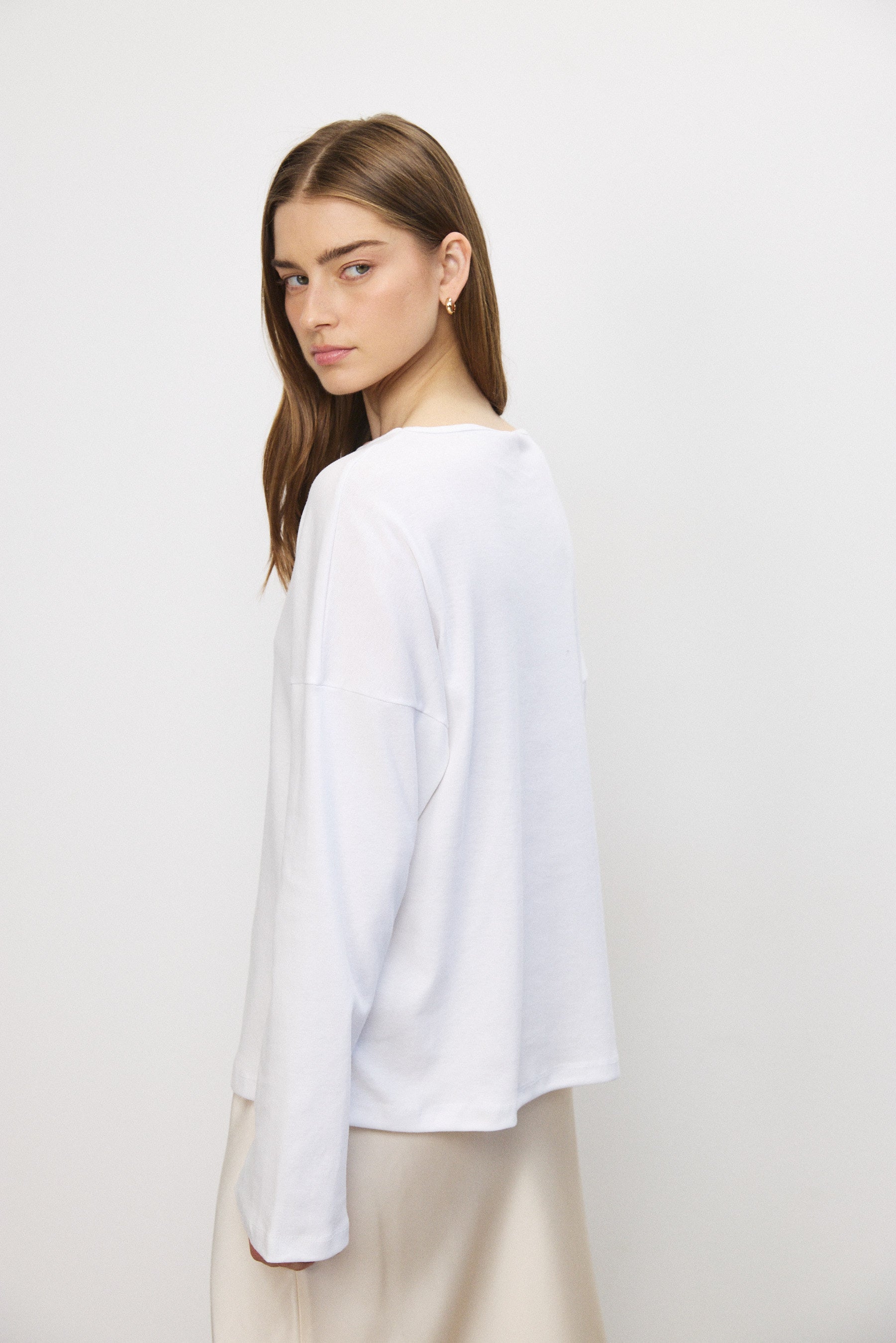 חולצה עשויה 100% כותנה דקה ואיכותית, מבד נושם ונעים על הגוף. שרוולים מתרחבים וגזרה מדויקת יוצרים מראה מאוזן ומוקפד. פריט משלים בארון המשתלב כמעט בכל לוק — יומיומי או מוקפד יותר — ומעניק בסיס נקי ומדויק לכל שילוב