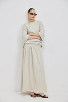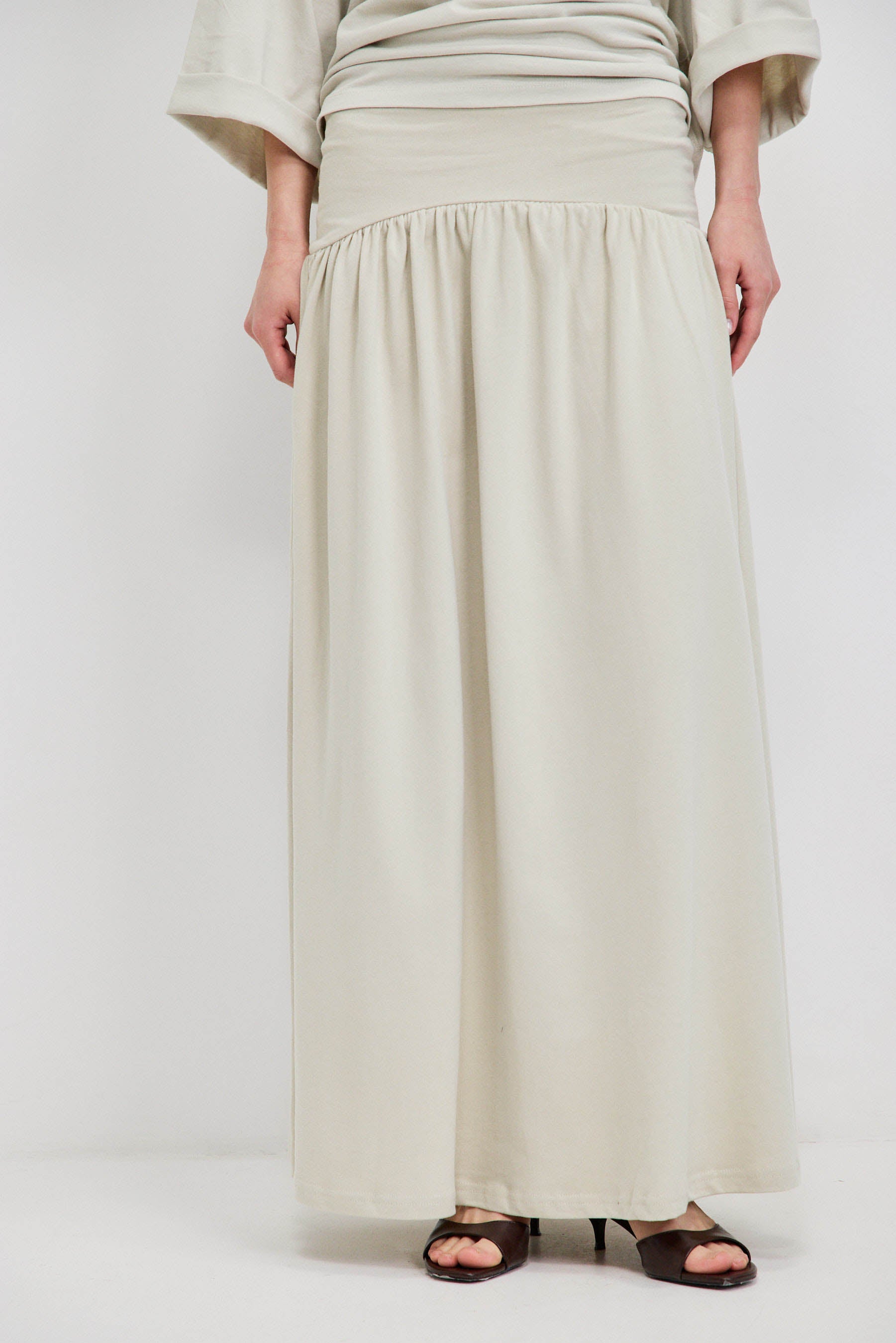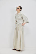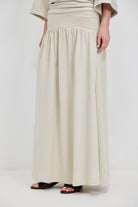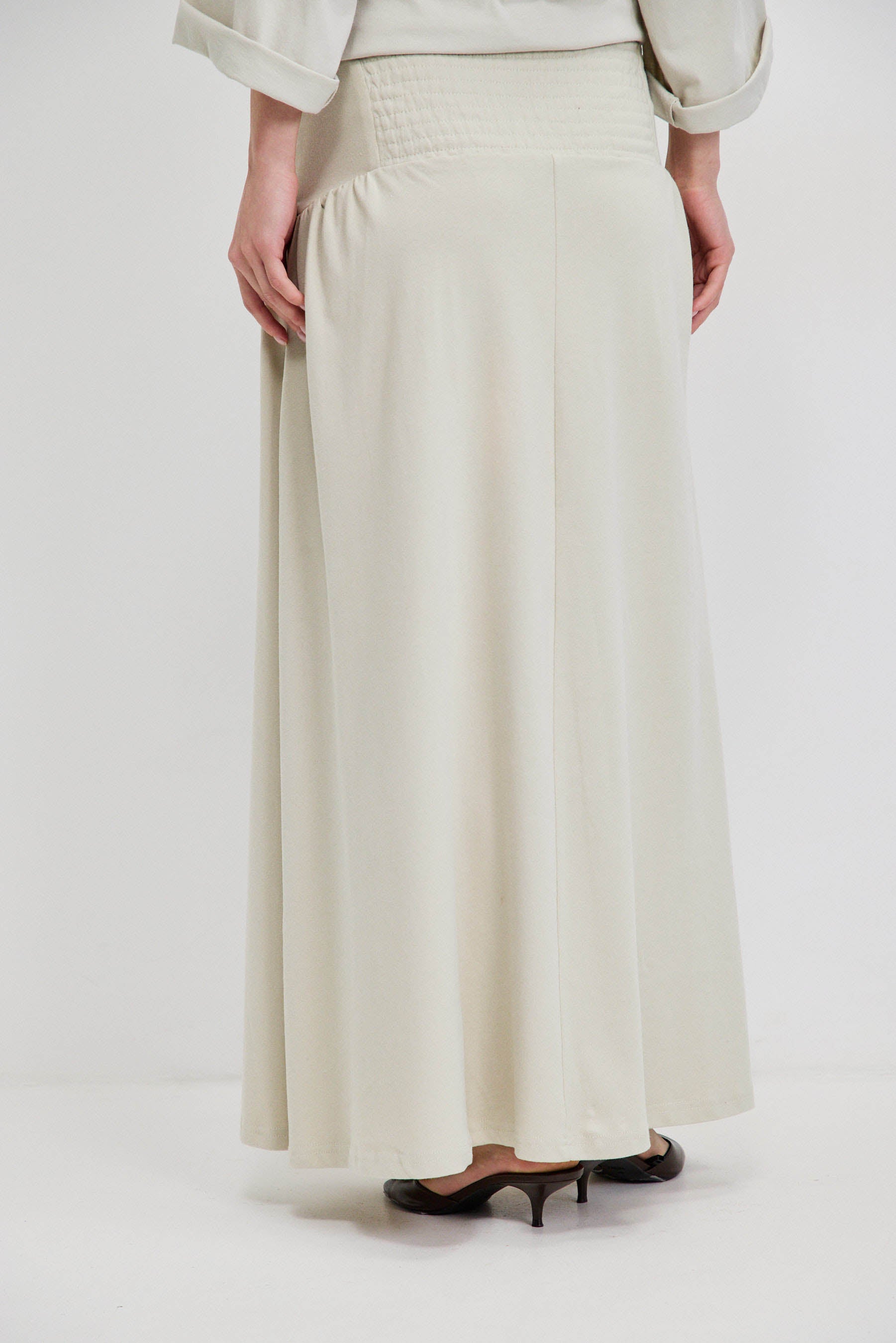 חצאית מקסי באורך מלא, בעיצוב נקי ומדויק בהשראת הגזרה האייקונית של אמארה. החלק העליון יושב בצורה מחמיאה על המותן, וממנו נפתח נפח עדין של קפלים היוצרים תנועה טבעית ומאוזנת.