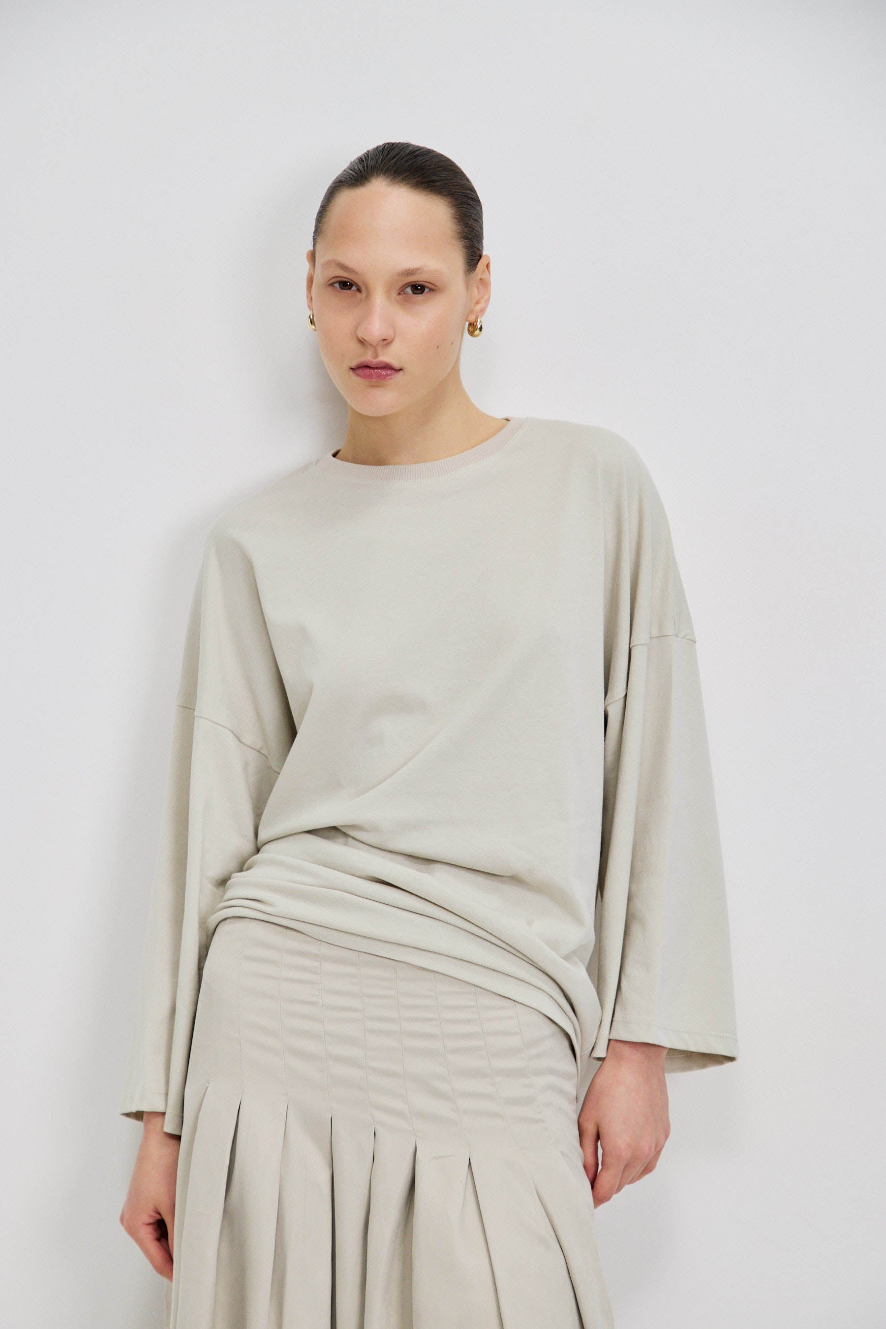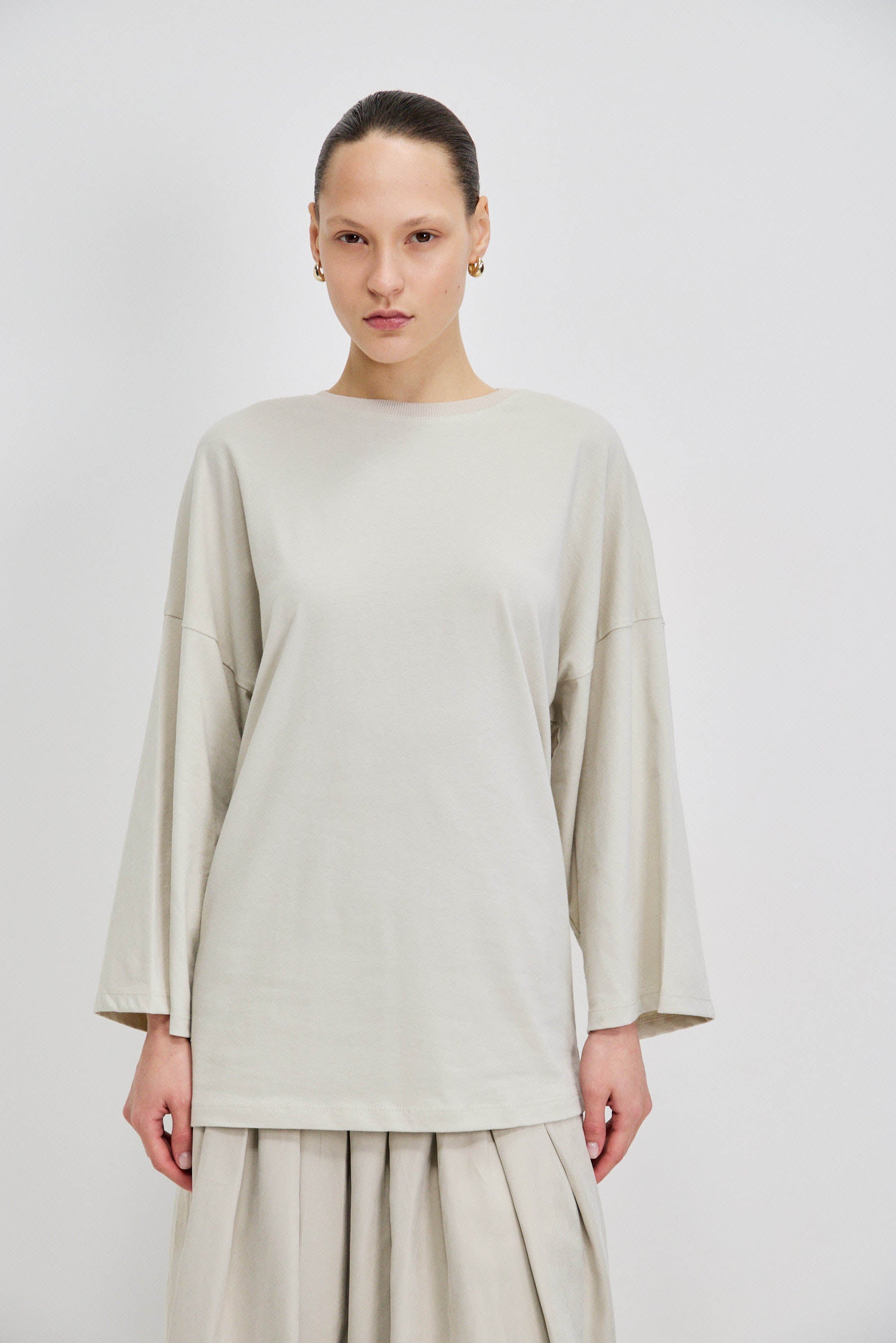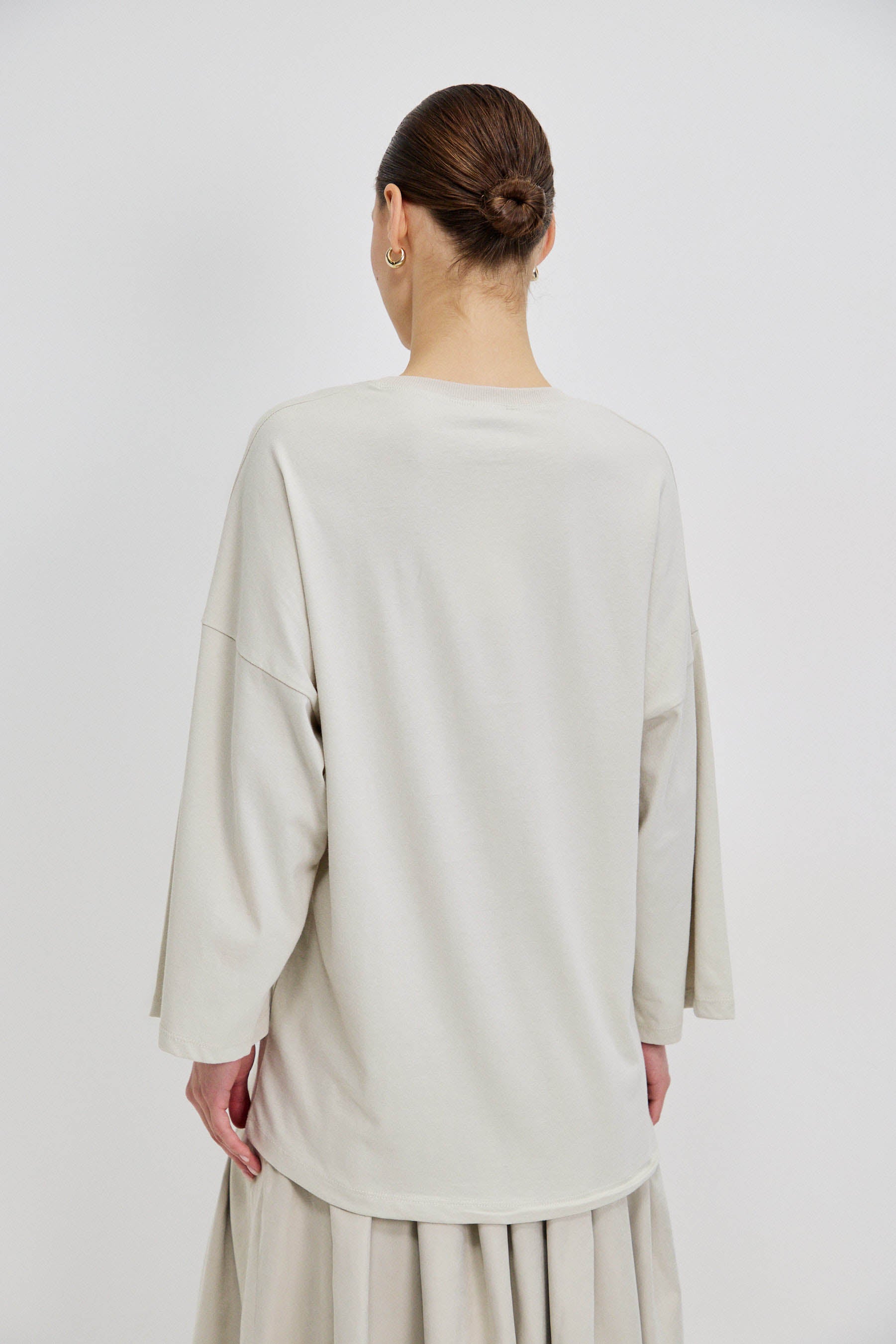 חולצת בייסיק עשויה 100% כותנה, בעלת מפתח ניקי מדויק. שרוולי שבע שמיניות עם אפשרות לקיפול למראה קליל, וגזרה רחבה באוברסייז לישיבה נוחה ומאוזנת על הגוף.