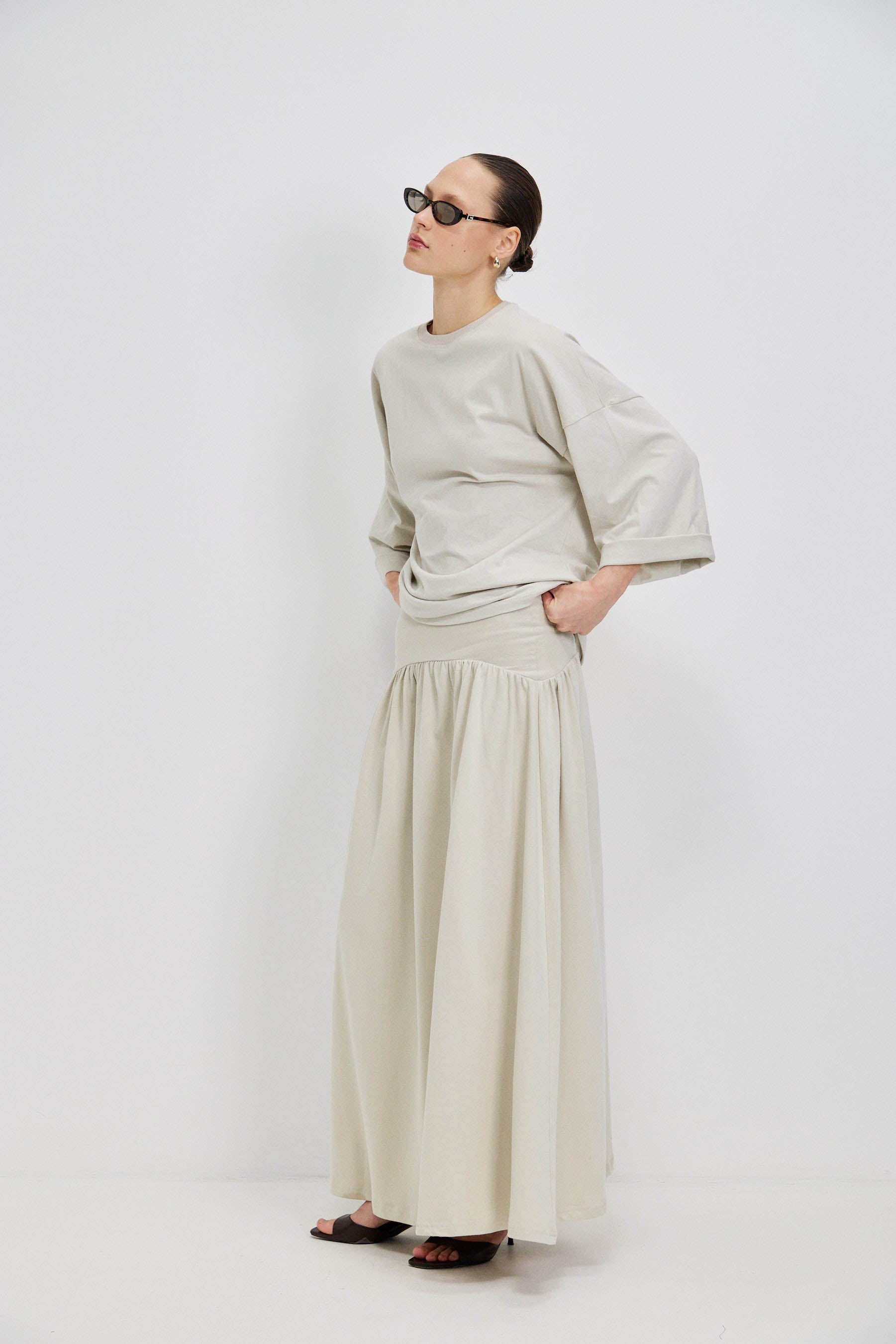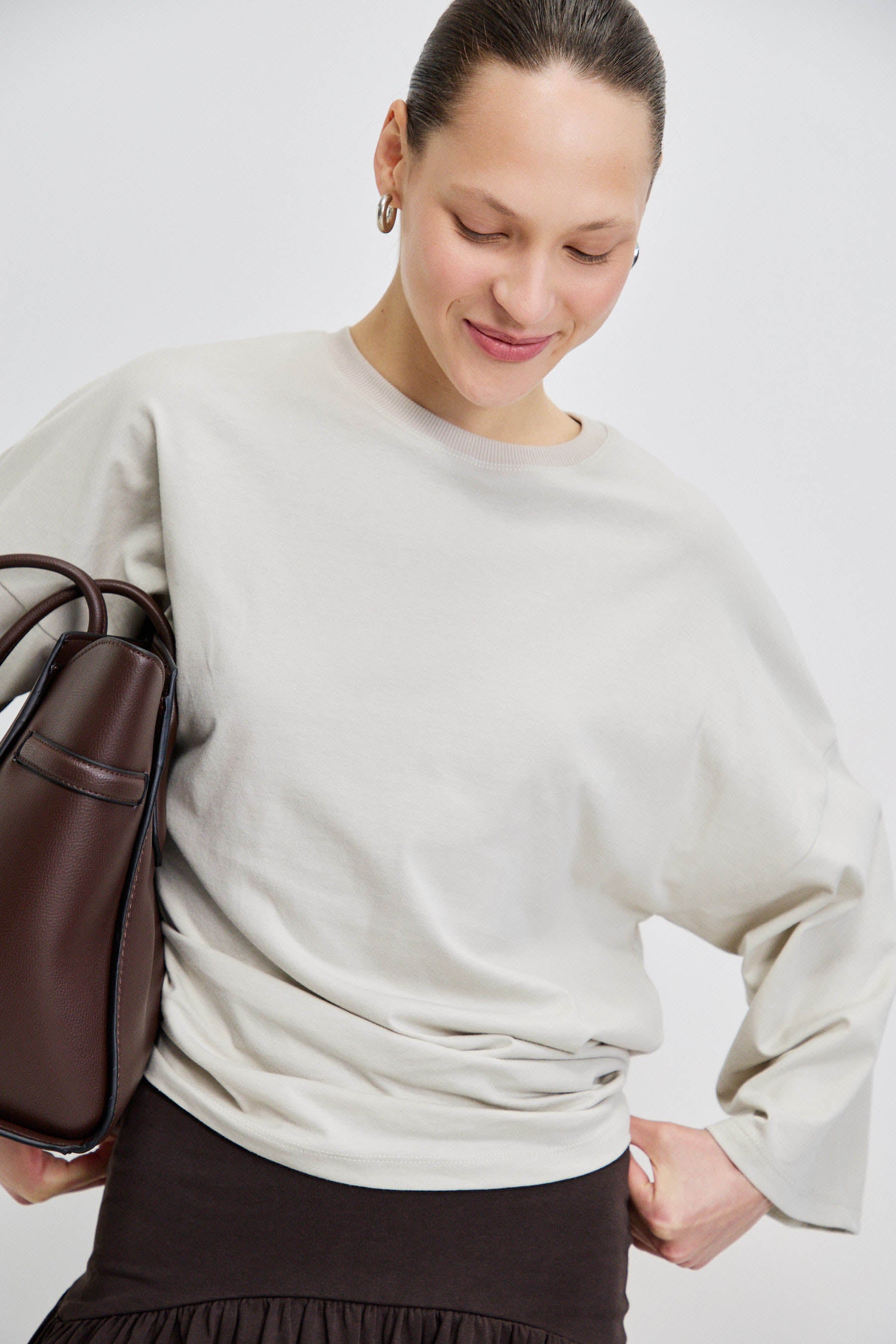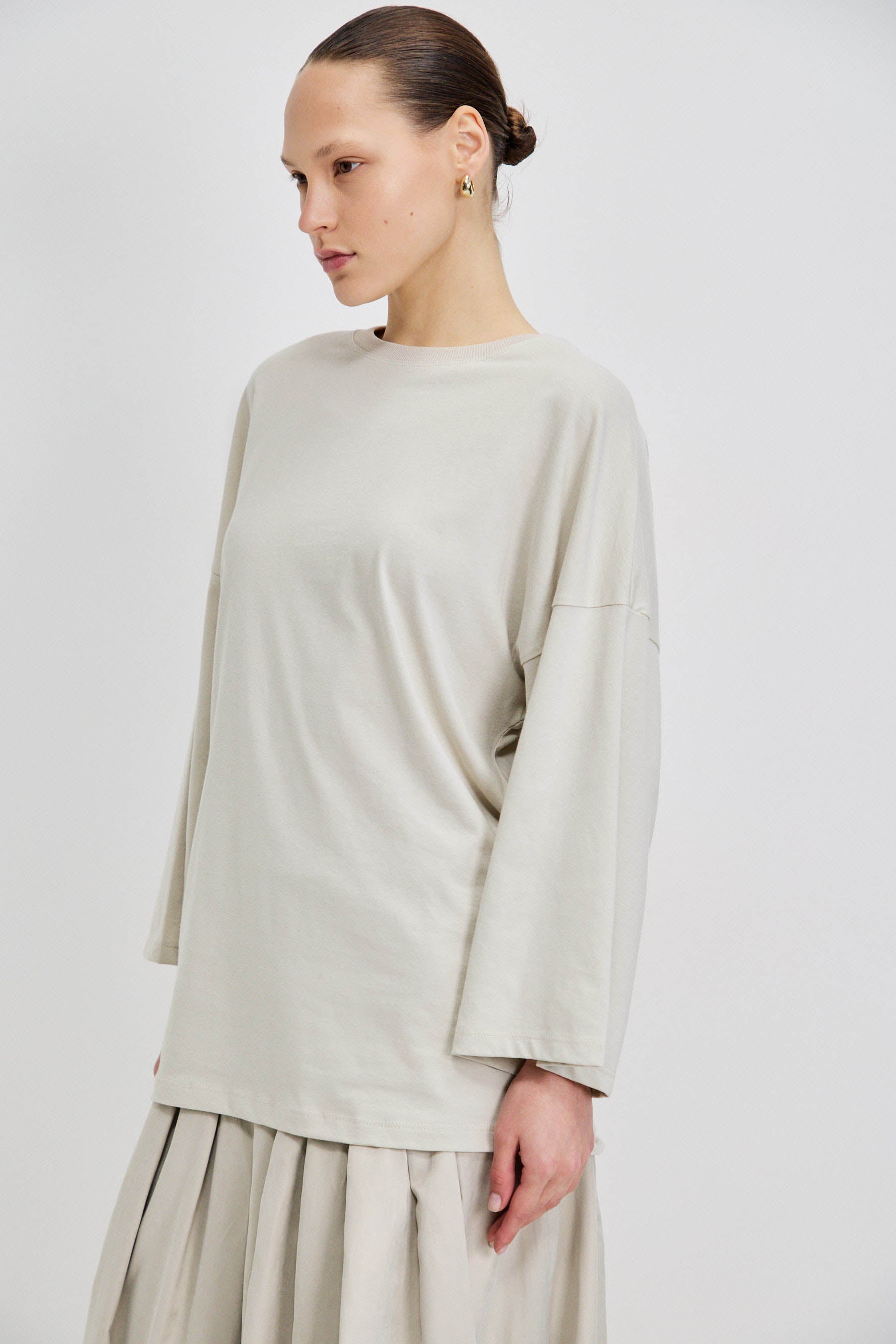 חולצת בייסיק עשויה 100% כותנה, בעלת מפתח ניקי מדויק. שרוולי שבע שמיניות עם אפשרות לקיפול למראה קליל, וגזרה רחבה באוברסייז לישיבה נוחה ומאוזנת על הגוף.